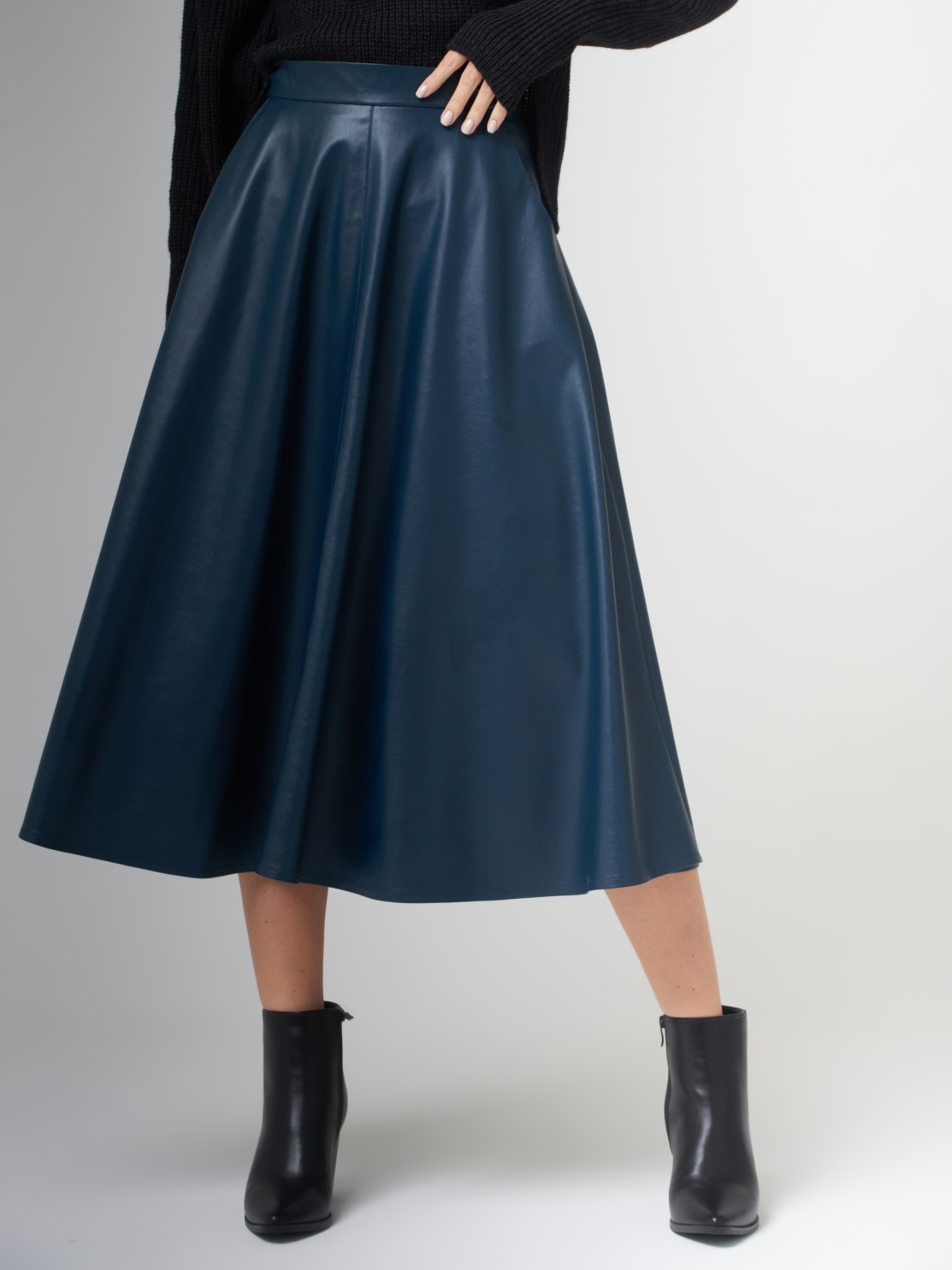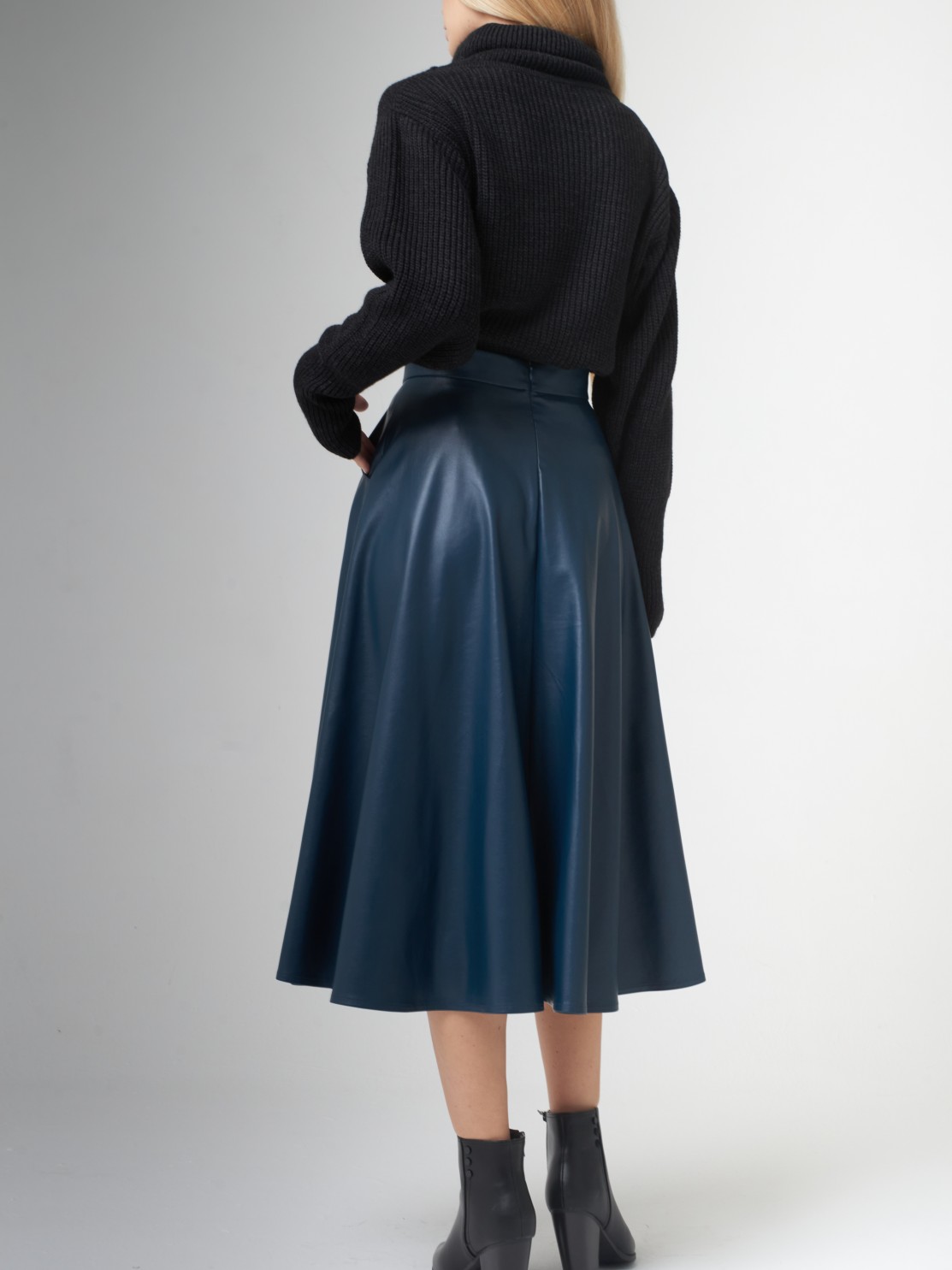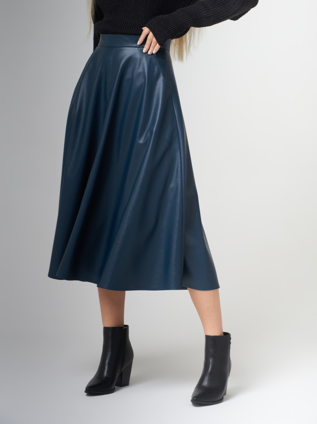 Очень красивая, качественная юбка с подкладкой. Цвет темно-синий. Материал тонкий, но мягкий и вполне напоминает натуральную кожу.