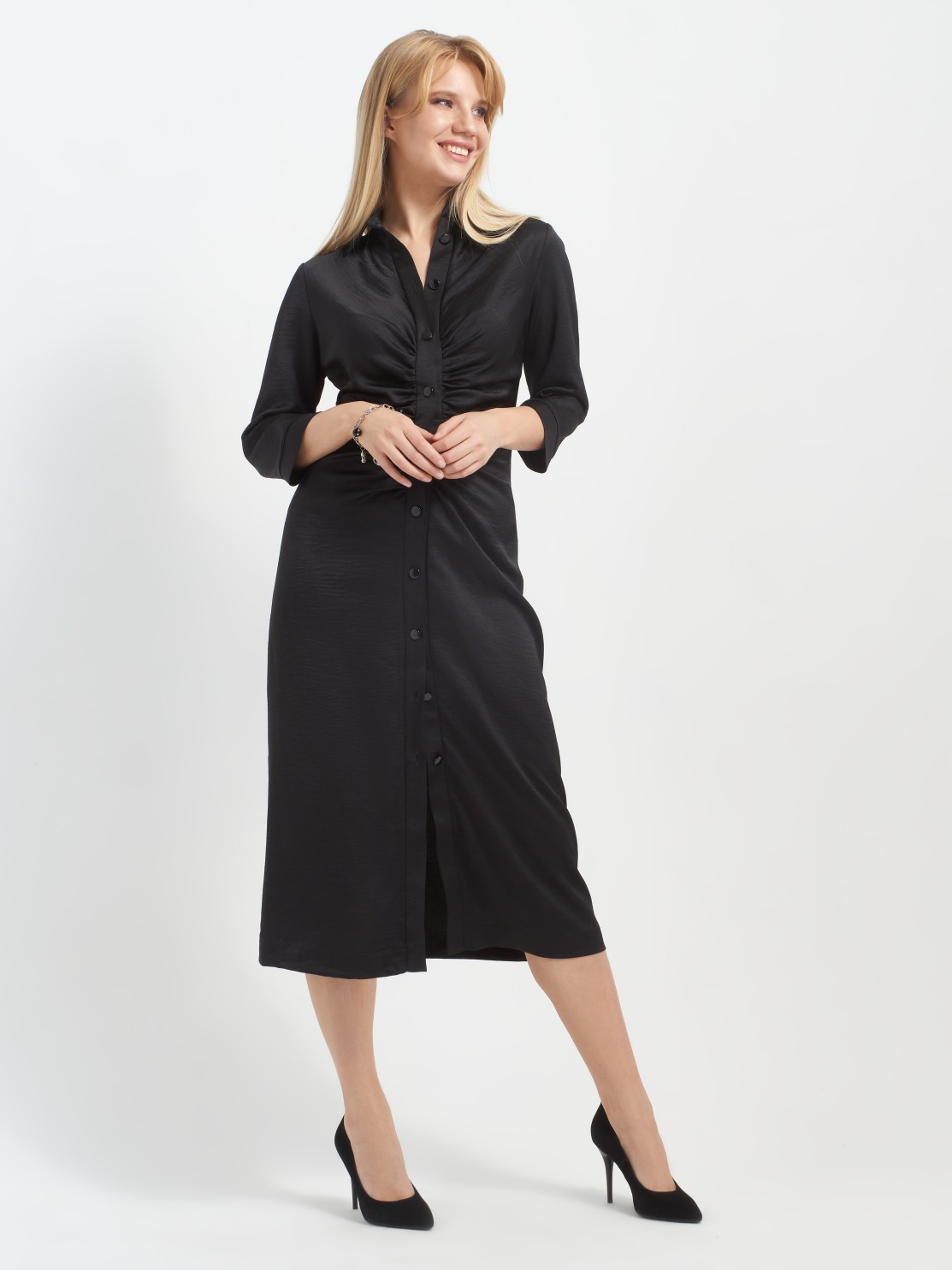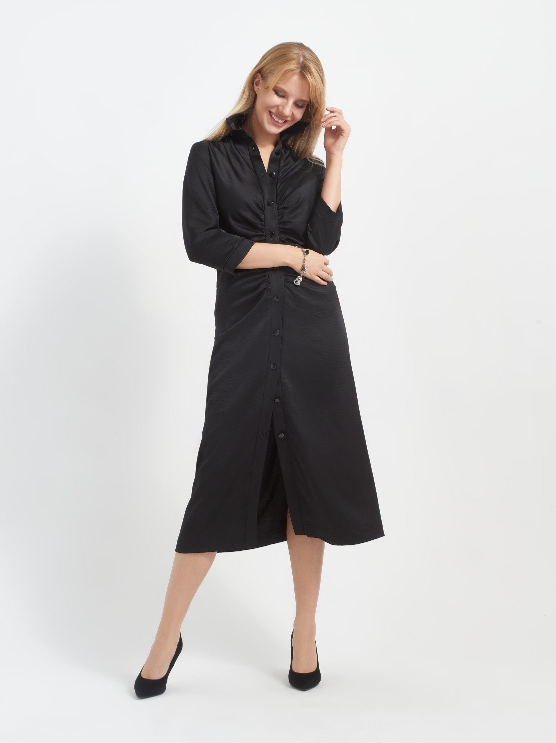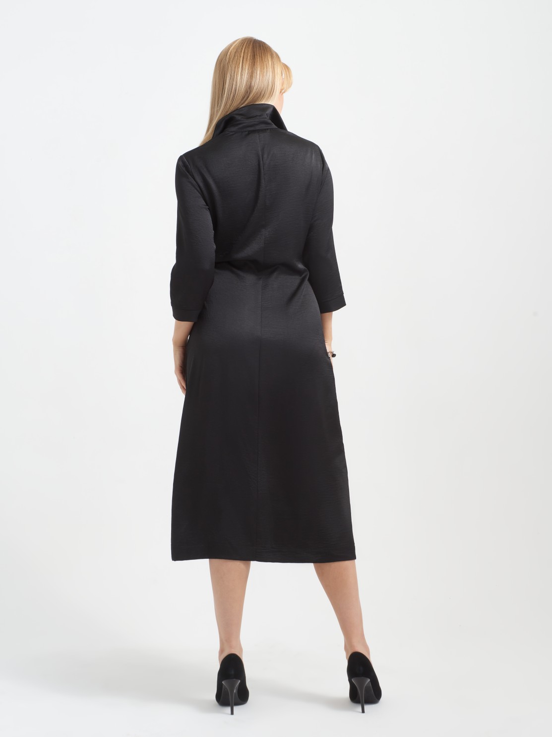 Приталенное платье-рубашка хорошо ложится по фигуре. Интересная драпировка по застежке делает красивый акцент и позволяет мягко скрыть небольшие недостатки фигуры. Благодаря атласной фактуре ткани и оригинальному крою платье может быть роскошным праздничным нарядом, всё зависит от правильно подобранных аксессуаров и обуви. Застежка пуговицы позволяет регулировать высоту разреза, а длина миди придает ему еще большую изысканность и элегантность.