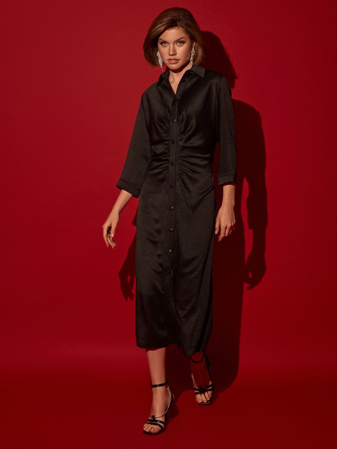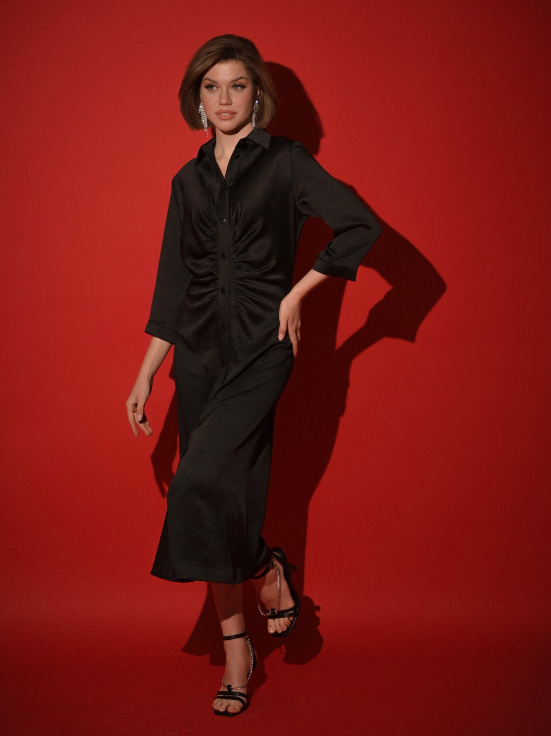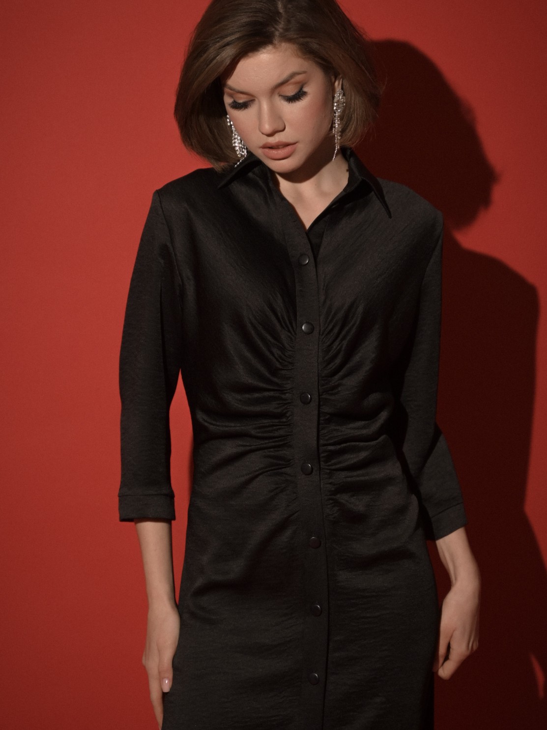 Приталенное платье-рубашка хорошо ложится по фигуре. Интересная драпировка по застежке делает красивый акцент и позволяет мягко скрыть небольшие недостатки фигуры. Благодаря атласной фактуре ткани и оригинальному крою платье может быть роскошным праздничным нарядом, всё зависит от правильно подобранных аксессуаров и обуви. Застежка пуговицы позволяет регулировать высоту разреза, а длина миди придает ему еще большую изысканность и элегантность.