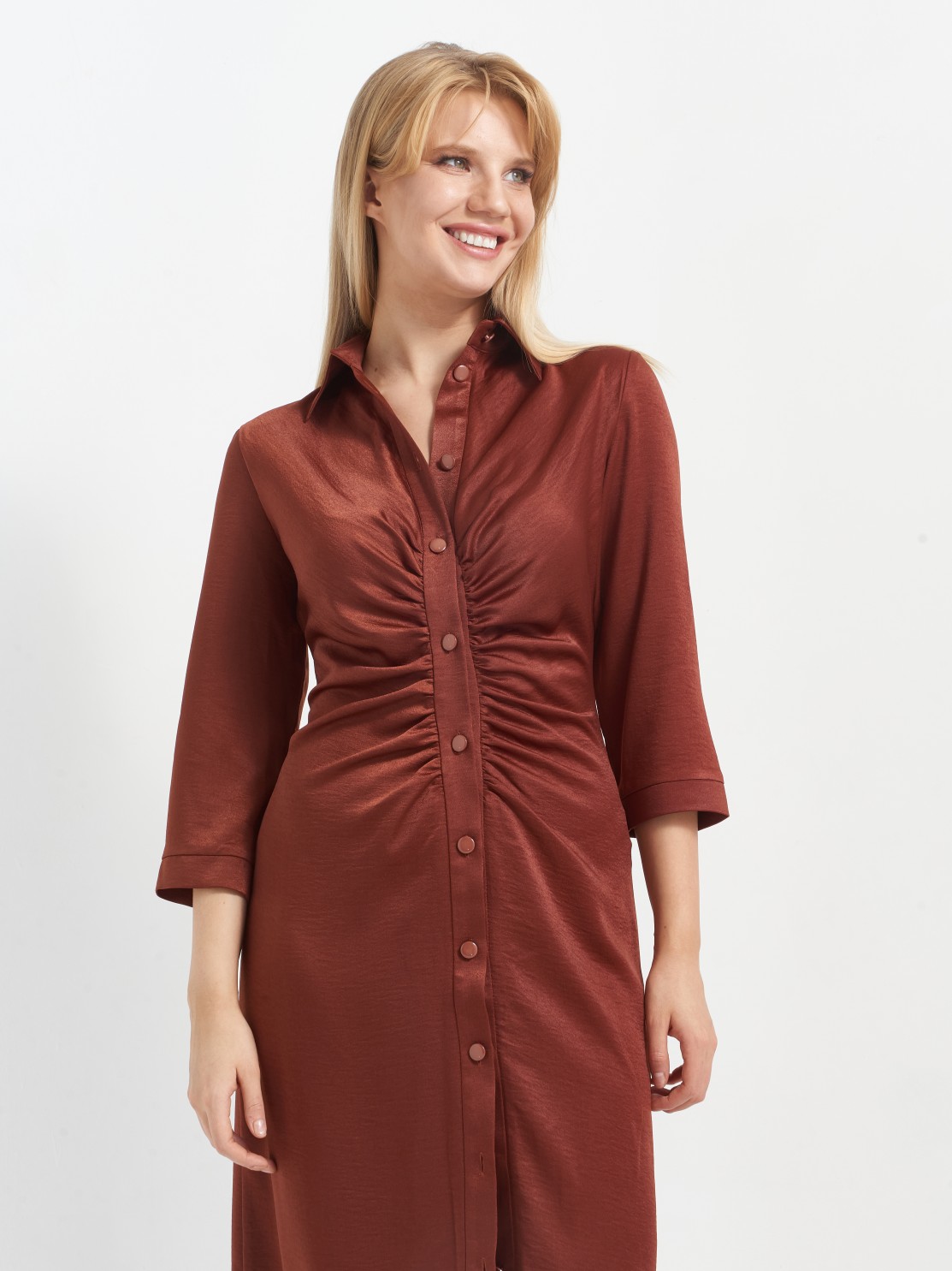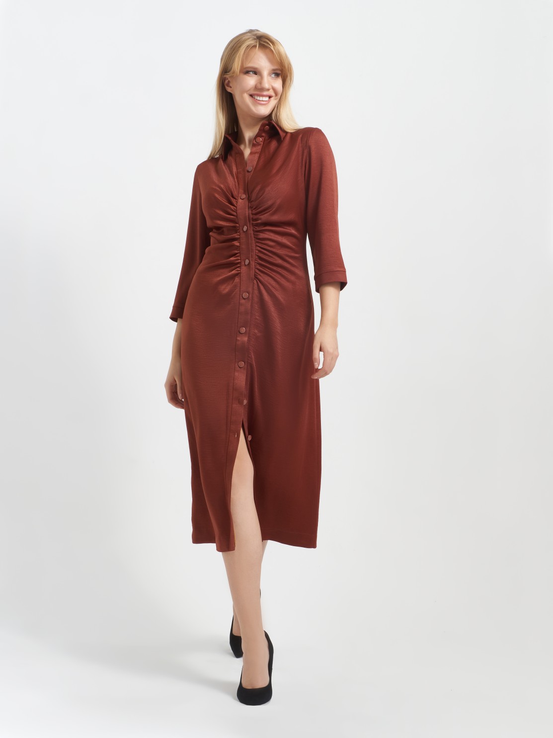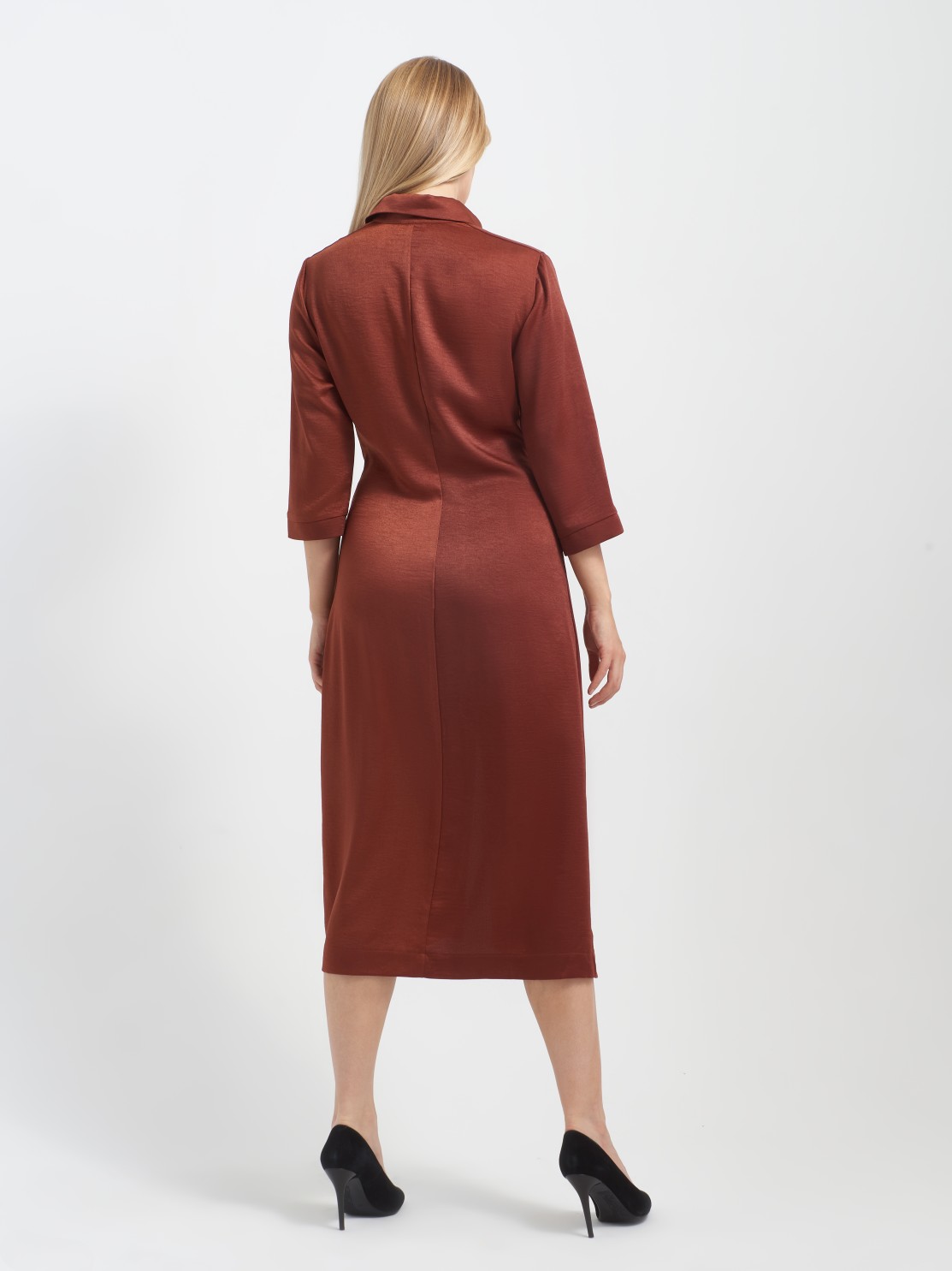 Приталенное платье-рубашка хорошо ложится по фигуре. Интересная драпировка по застежке делает красивый акцент и позволяет мягко скрыть небольшие недостатки фигуры. Благодаря атласной фактуре ткани и оригинальному крою платье может быть роскошным праздничным нарядом, всё зависит от правильно подобранных аксессуаров и обуви. Застежка пуговицы позволяет регулировать высоту разреза, а длина миди придает ему еще большую изысканность и элегантность.