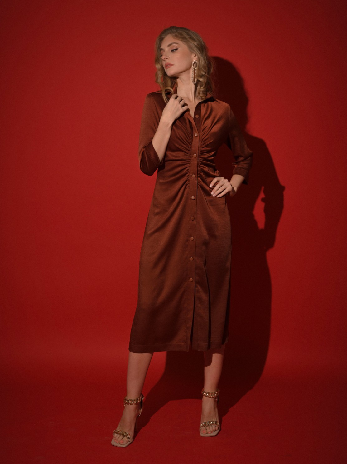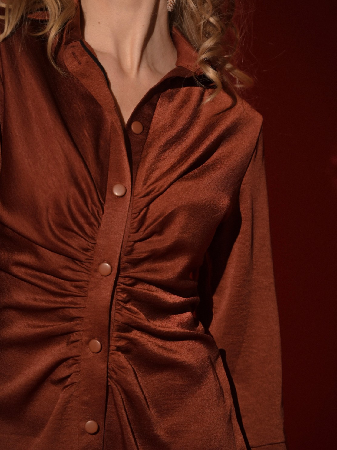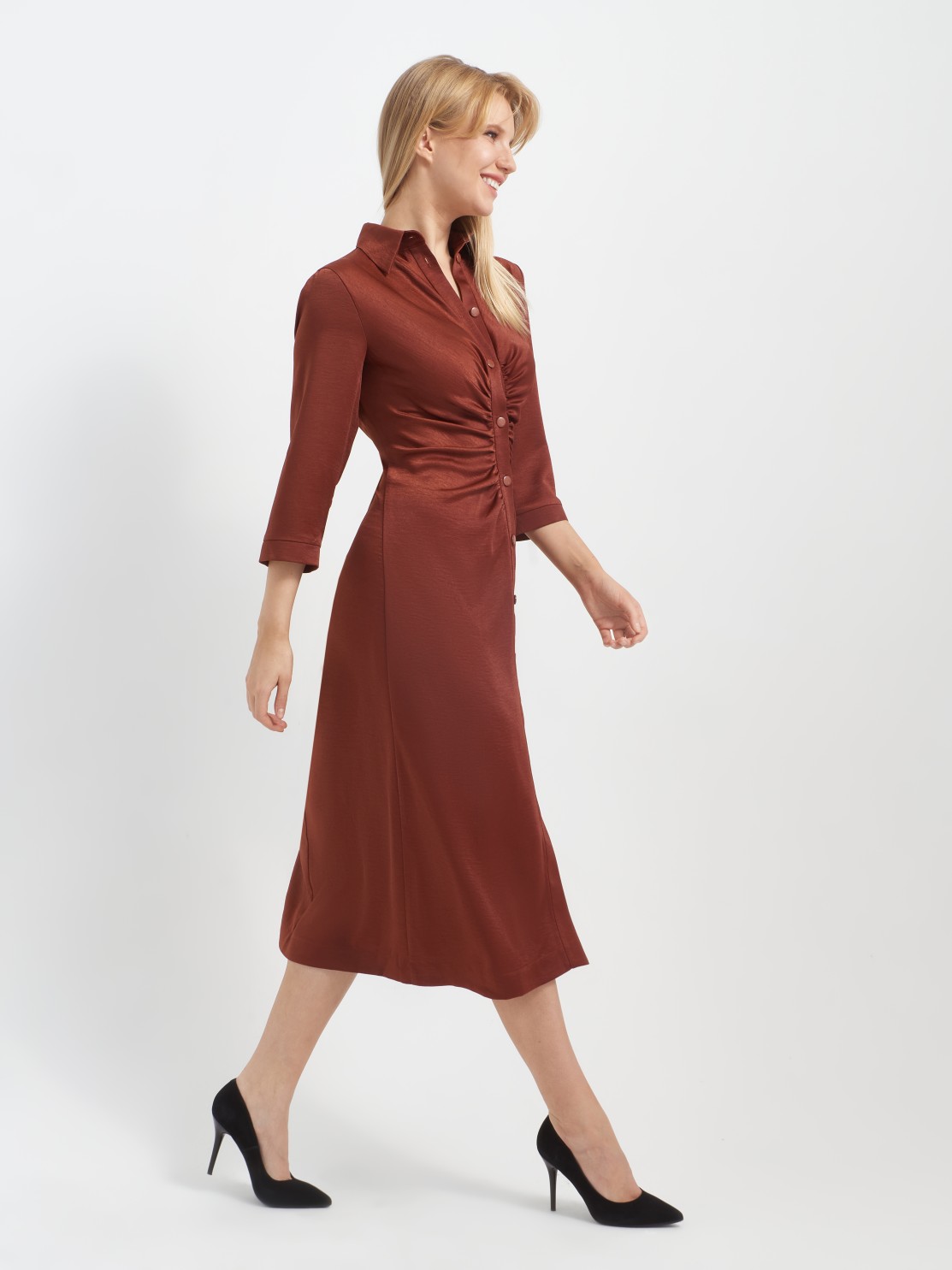 Приталенное платье-рубашка хорошо ложится по фигуре. Интересная драпировка по застежке делает красивый акцент и позволяет мягко скрыть небольшие недостатки фигуры. Благодаря атласной фактуре ткани и оригинальному крою платье может быть роскошным праздничным нарядом, всё зависит от правильно подобранных аксессуаров и обуви. Застежка пуговицы позволяет регулировать высоту разреза, а длина миди придает ему еще большую изысканность и элегантность.