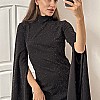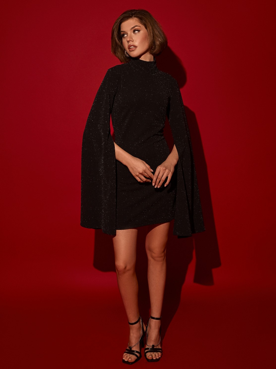 Платье мини — сочетание провокационной длины и сдержанного верха. Классическое платье-футляр до середины бедра с широкими рукавами-крыльями. Чёткий и графичный силуэт, высокий закрытый ворот «гольф», потайная молния на спине, разрезы на рукавах с внутренней стороны. Выполнено из эластичной ткани с деликатным блеском, заметным при движении.
