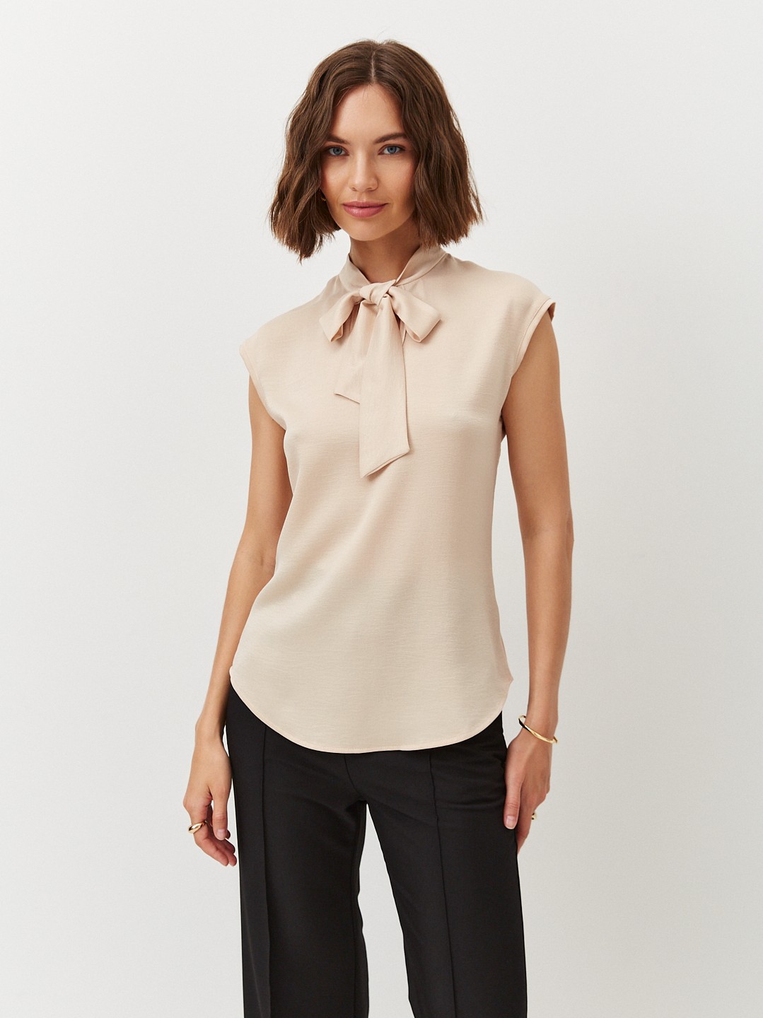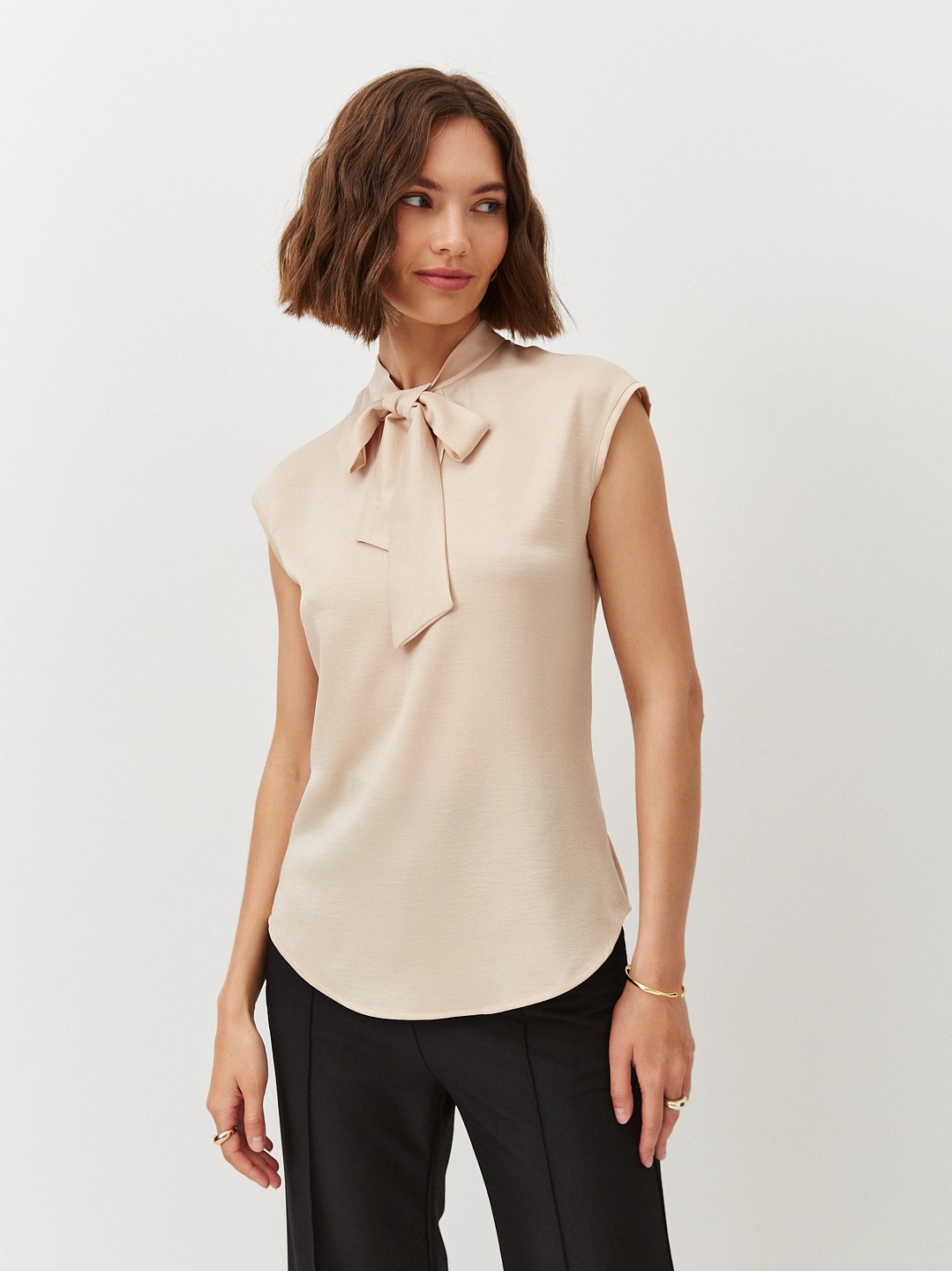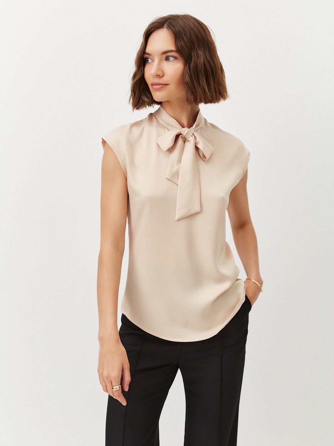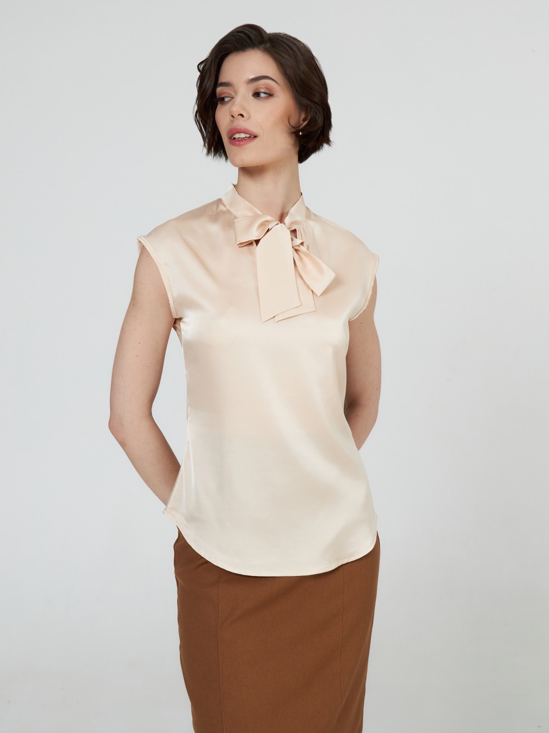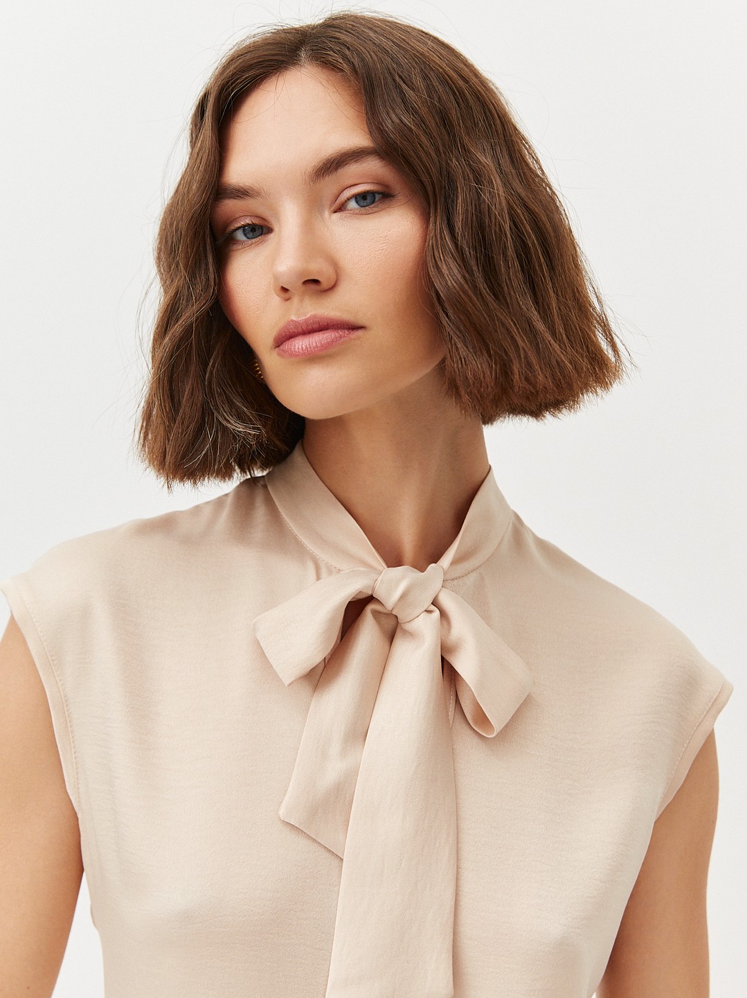 Базовый топ из мягкой ткани с деликатным сатиновым блеском. Закруглённый низ, благодаря чему его можно носить как заправленным, так и навыпуск. Важный декоративный элемент — воротник с вшитыми лентами, которые можно завязать в модный в этом сезоне бант или оставить расслабленным галстуком.
