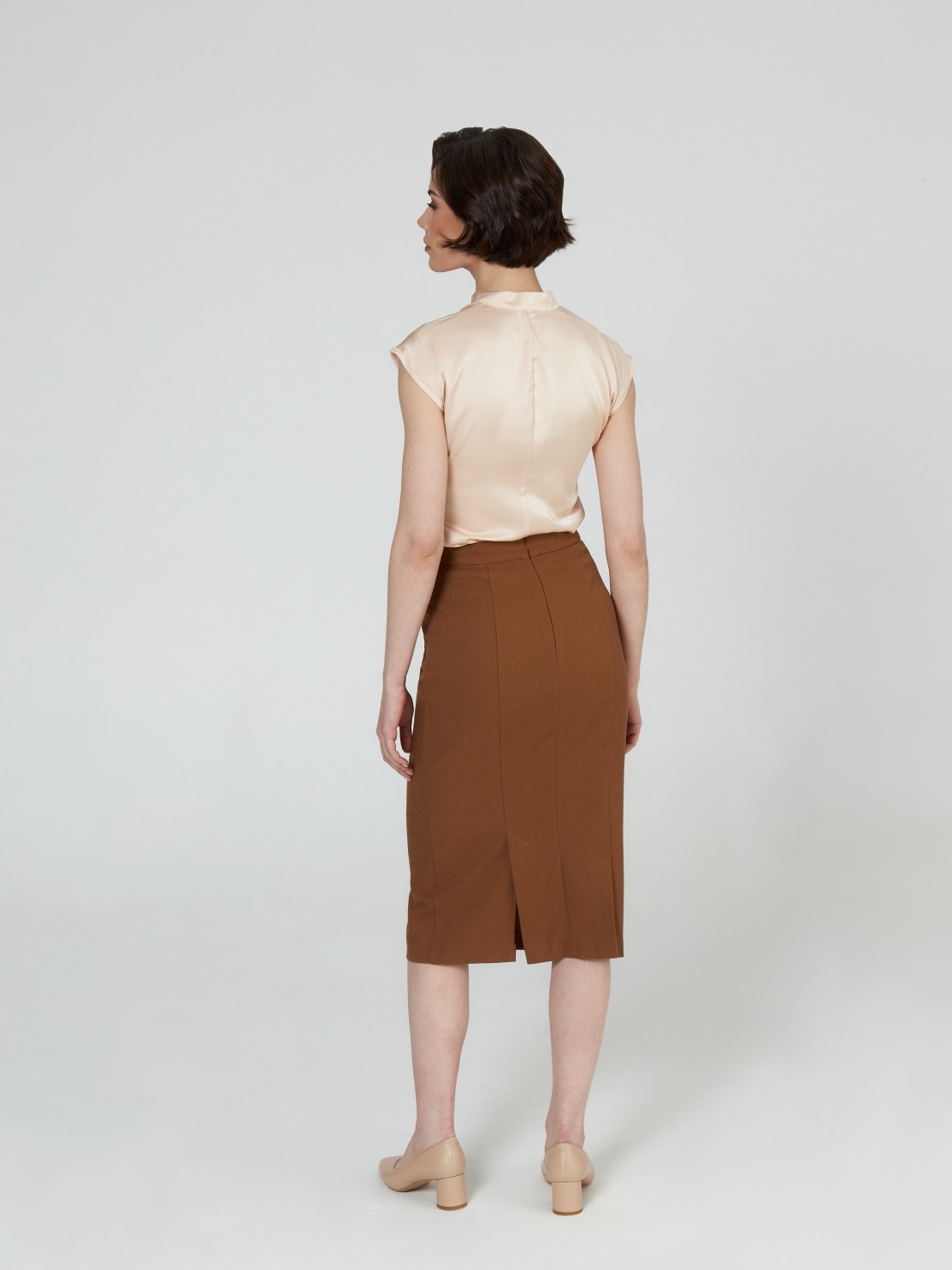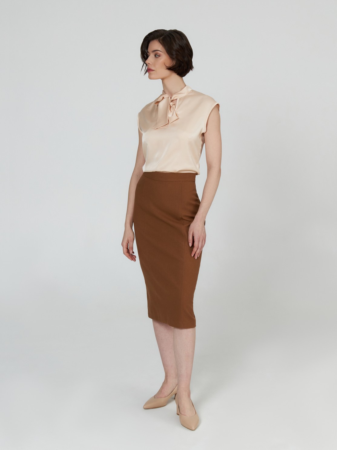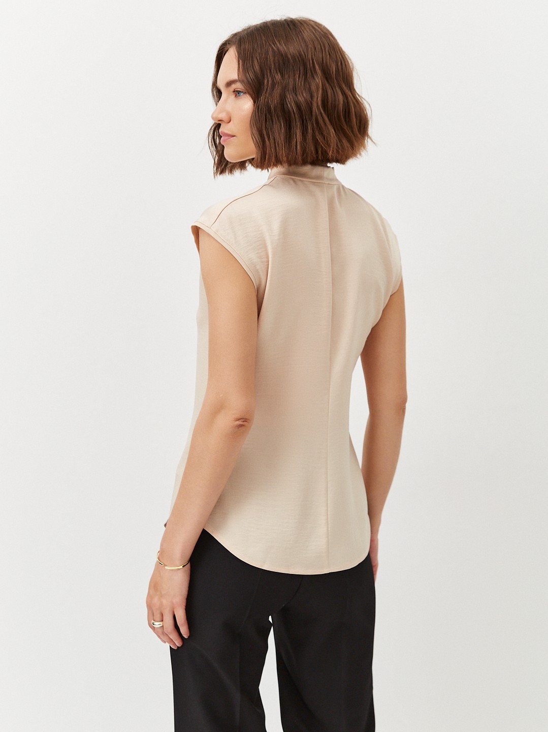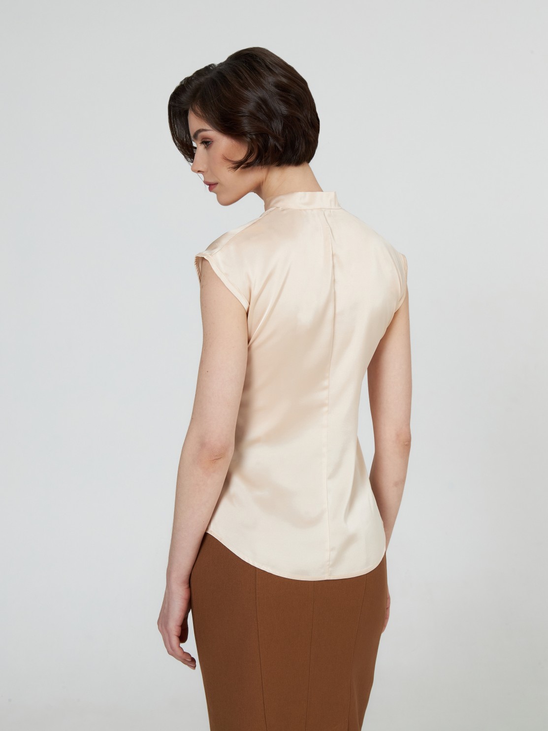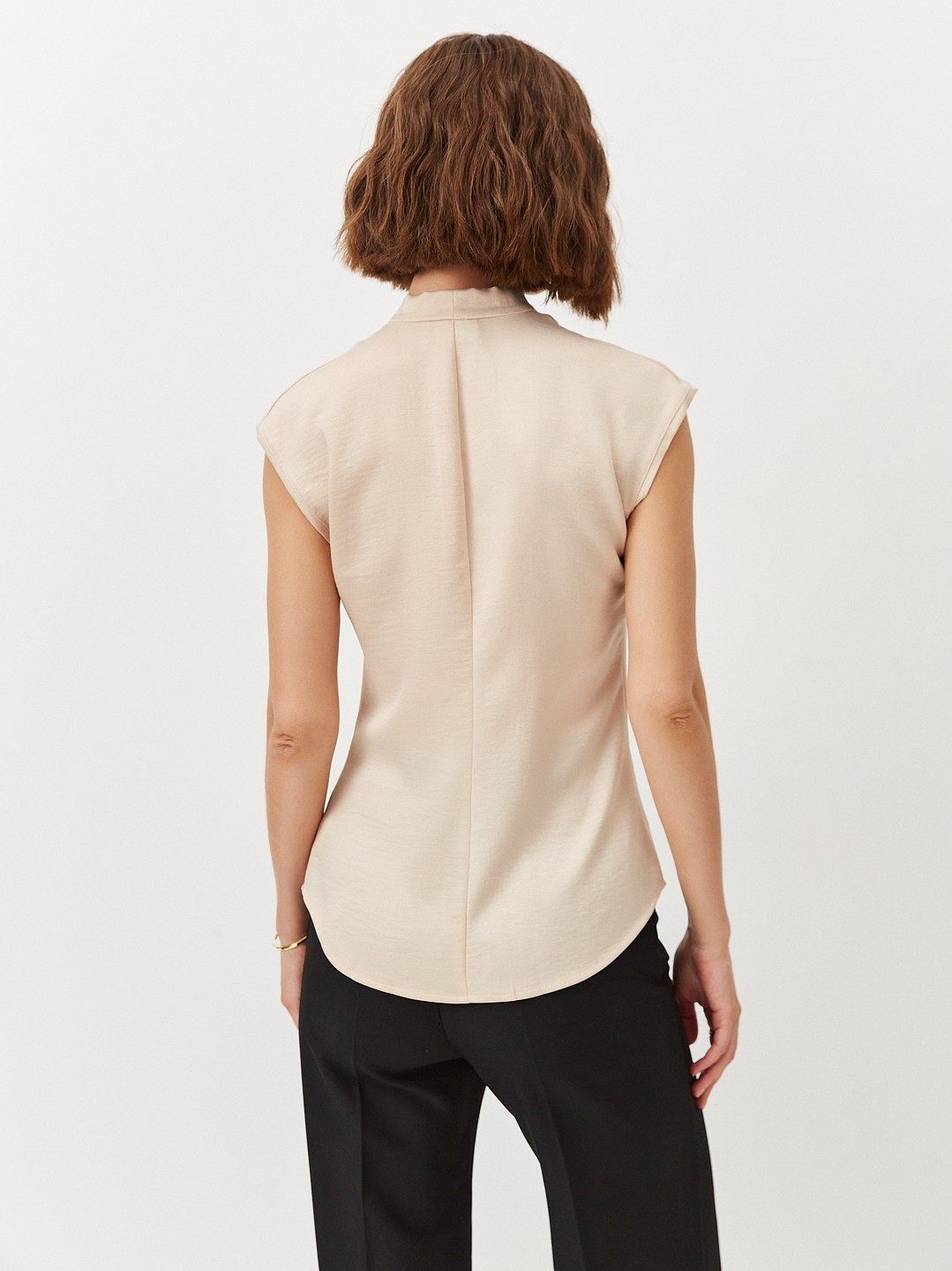 Базовый топ из мягкой ткани с деликатным сатиновым блеском. Закруглённый низ, благодаря чему его можно носить как заправленным, так и навыпуск. Важный декоративный элемент — воротник с вшитыми лентами, которые можно завязать в модный в этом сезоне бант или оставить расслабленным галстуком.