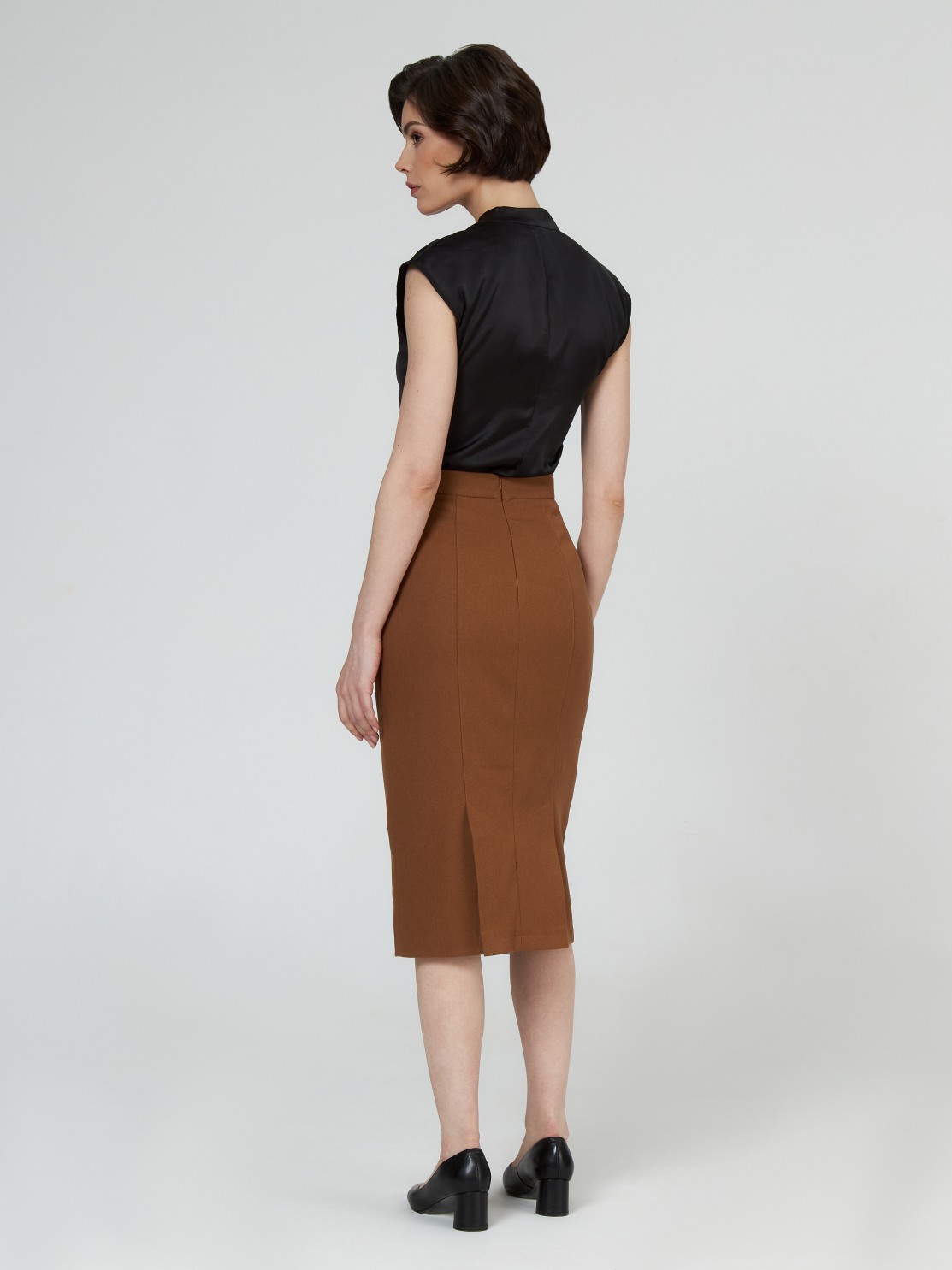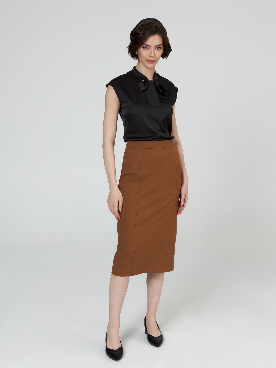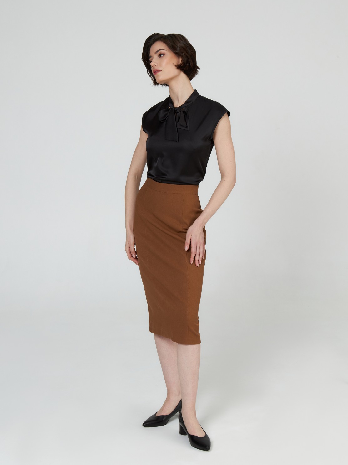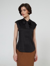Базовый топ из мягкой ткани с деликатным сатиновым блеском. Закруглённый низ, благодаря чему его можно носить как заправленным, так и навыпуск. Важный декоративный элемент — воротник с вшитыми лентами, которые можно завязать в модный в этом сезоне бант или оставить расслабленным галстуком.