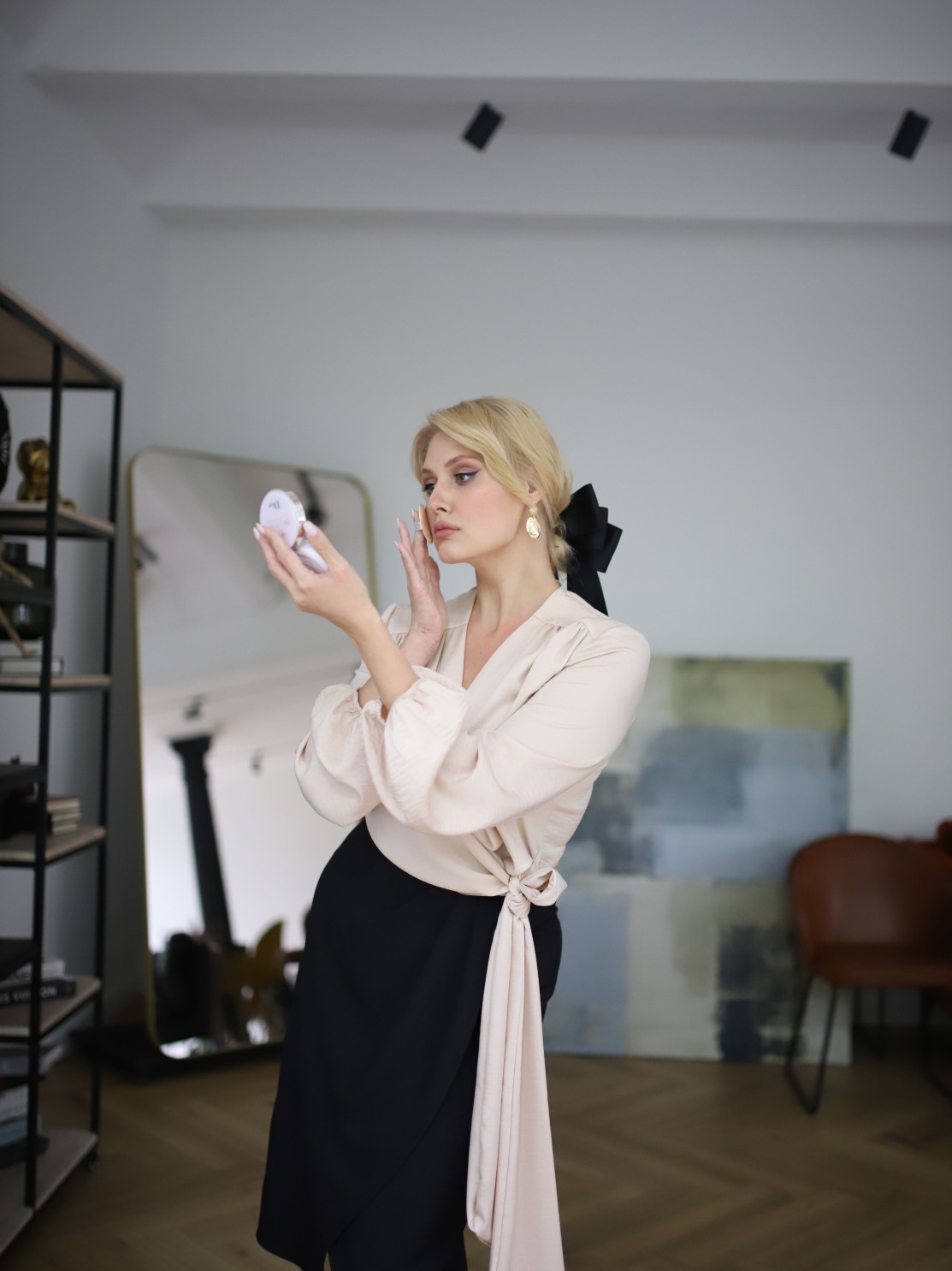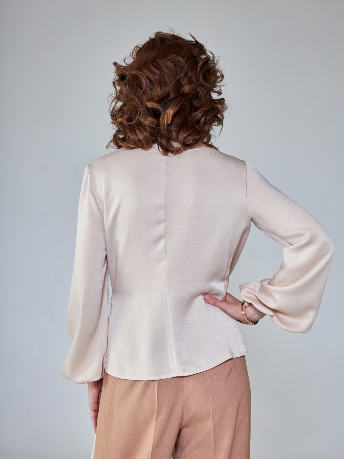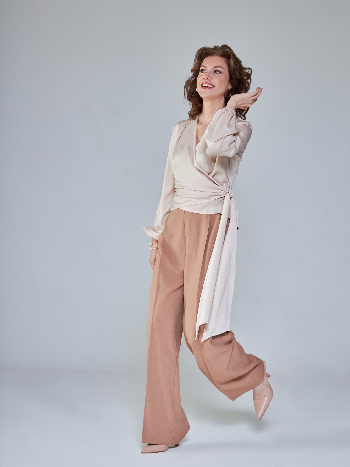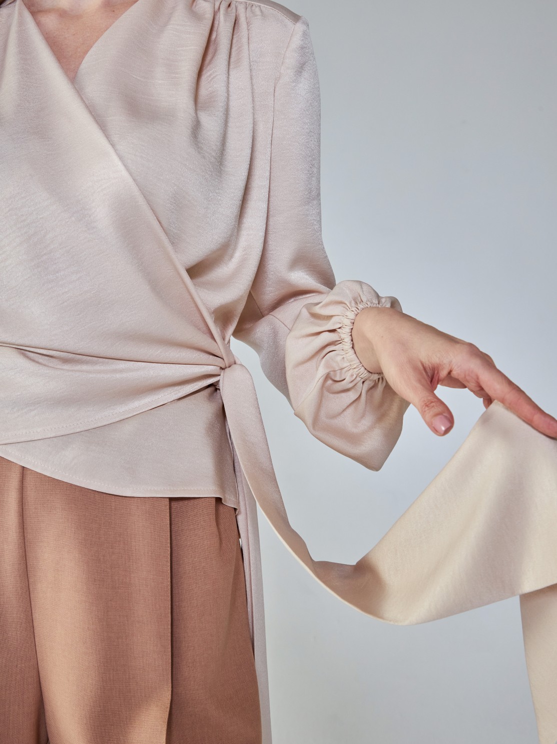 Стильная блуза-рубашка на запах с широкими рукавами и V-образным вырезом. Мягкая струящаяся ткань аккуратно драпируется на плечах. Вшитый длинный пояс подчёркивает силуэт и визуально уменьшает талию. Модель сочетается как с юбками, так и с брюками.