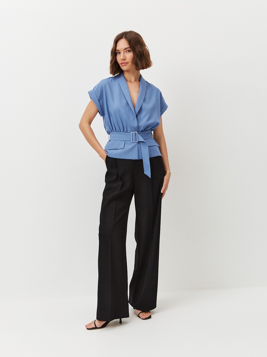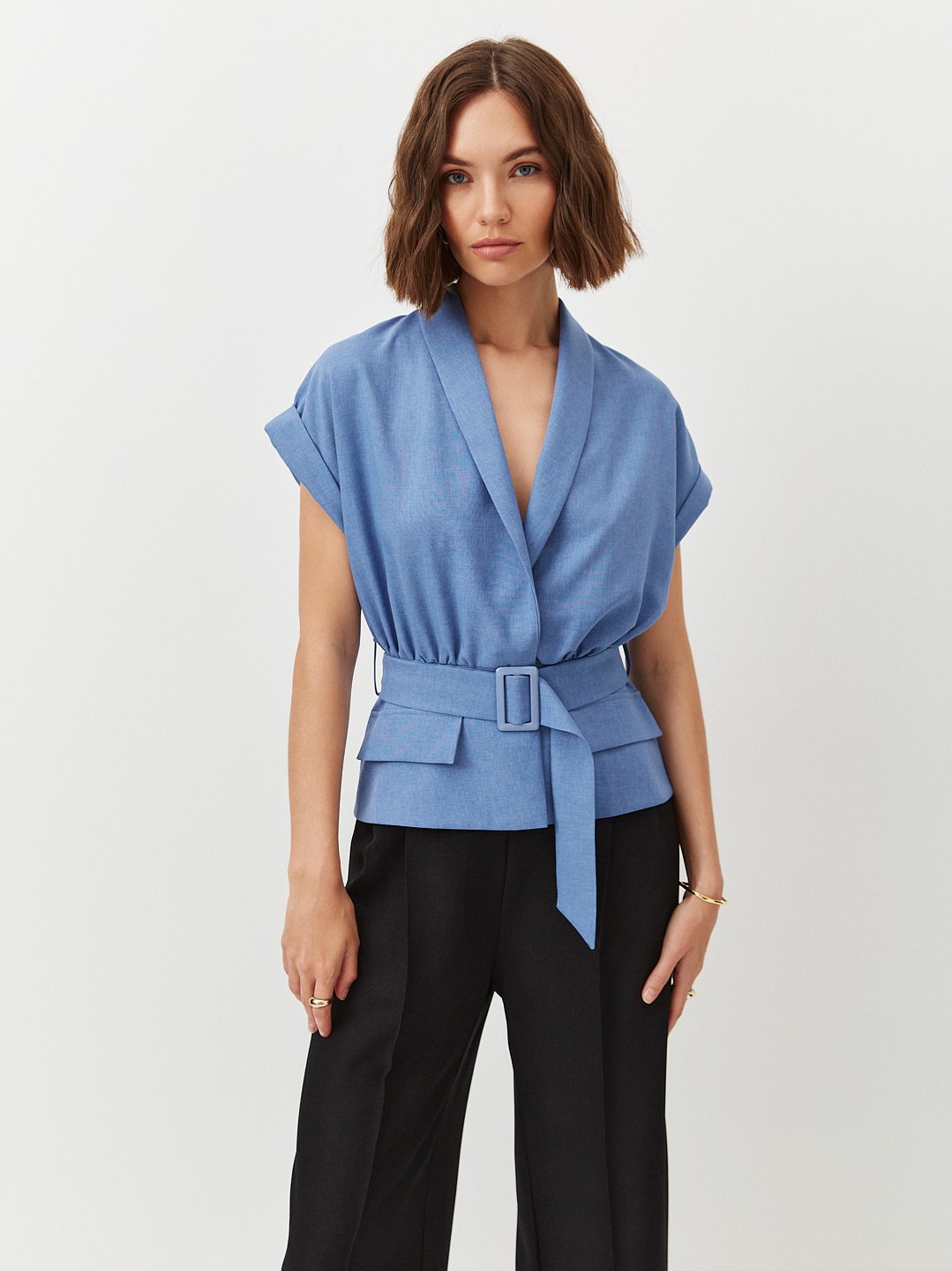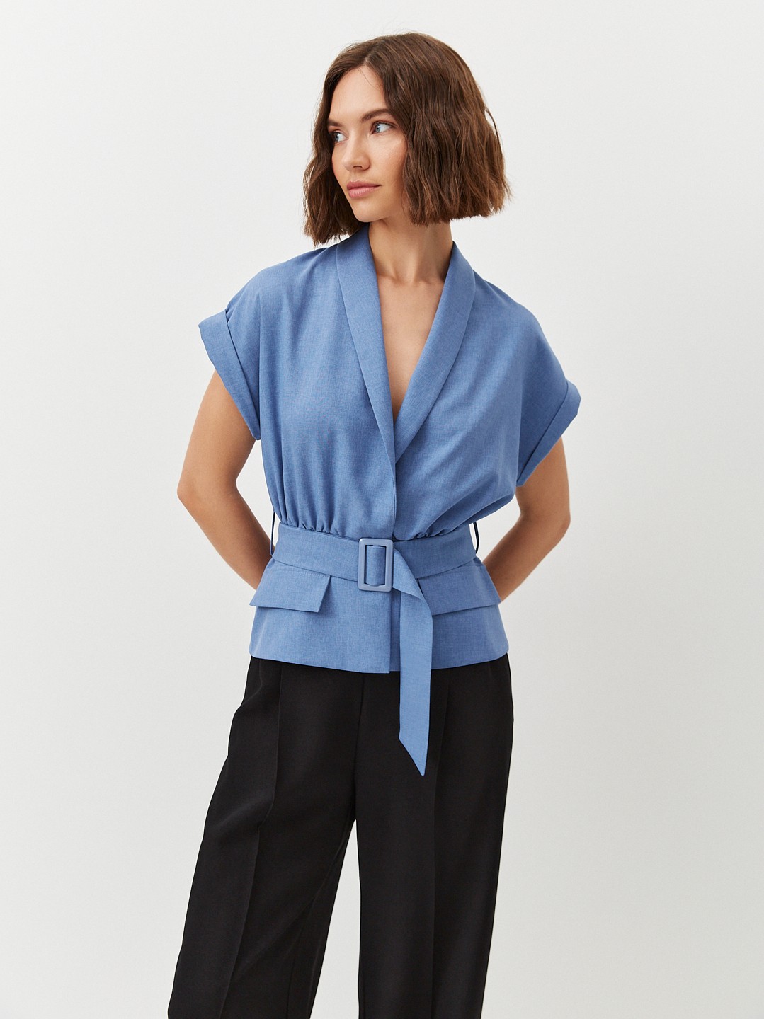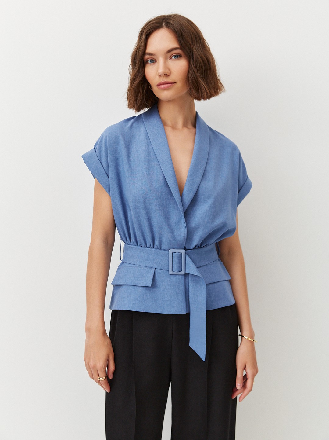 Укороченный жакет на тонкой подкладке. Изящный силуэт, короткий рукав, пояс на талии и декоративные карманы. Благодаря лёгкому материалу жакет прекрасно драпируется и держит форму, но при этом практически не мнётся. А лён в составе делает его идеальным для лета.