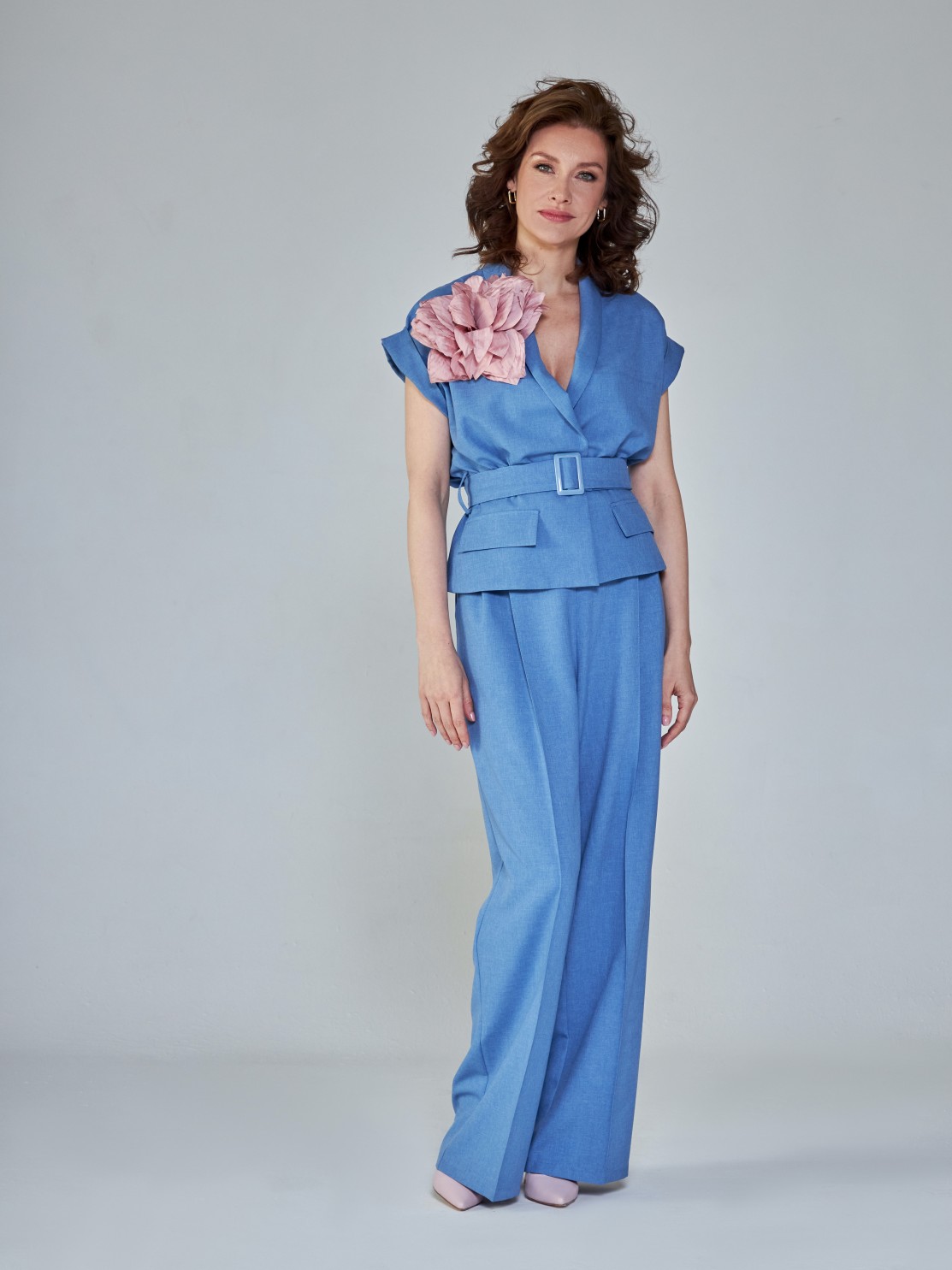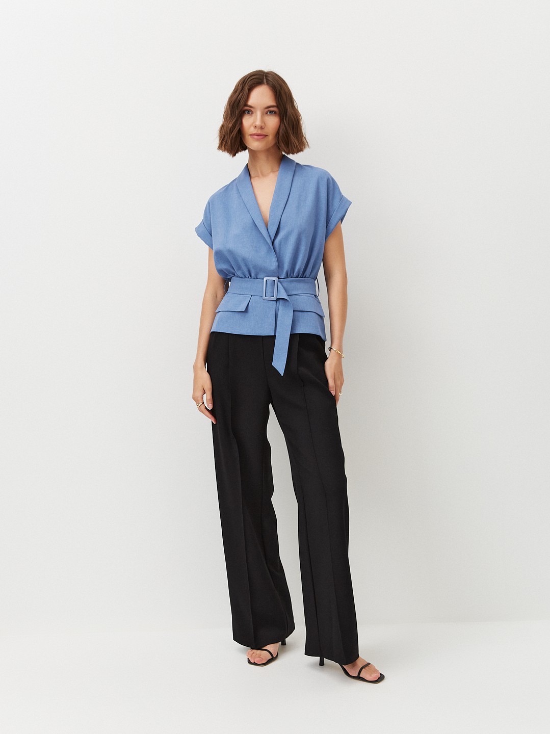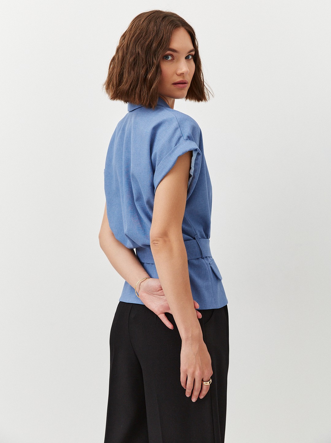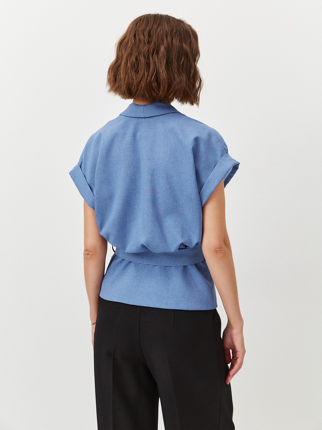 Укороченный жакет на тонкой подкладке. Изящный силуэт, короткий рукав, пояс на талии и декоративные карманы. Благодаря лёгкому материалу жакет прекрасно драпируется и держит форму, но при этом практически не мнётся. А лён в составе делает его идеальным для лета.