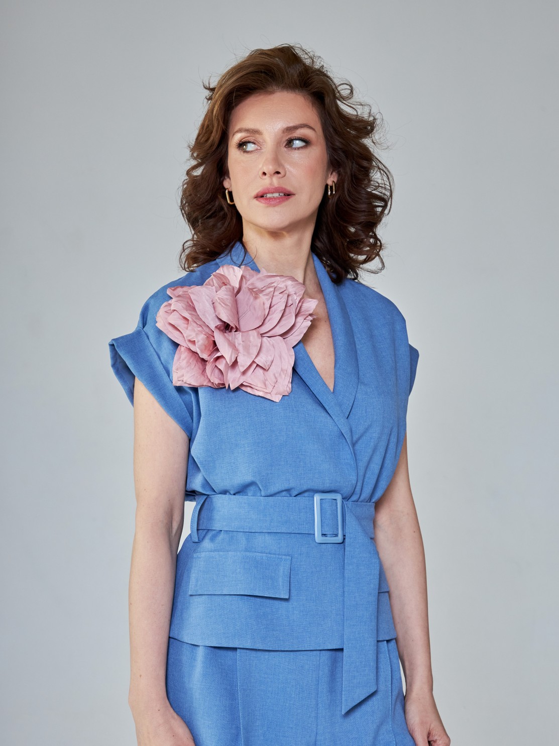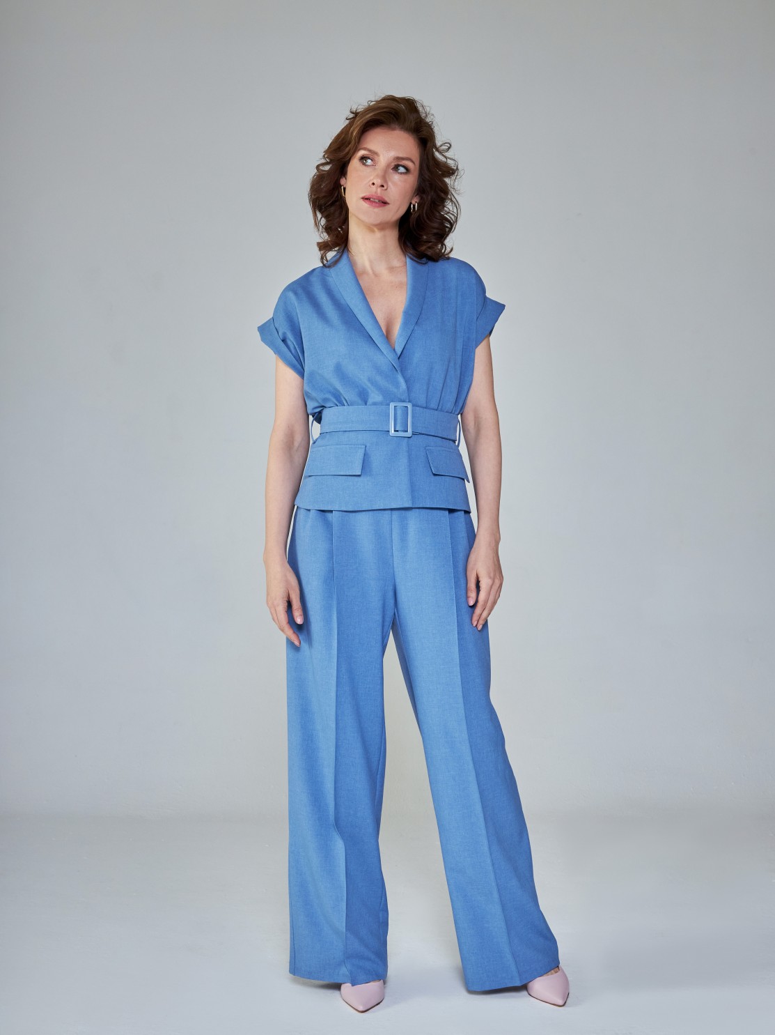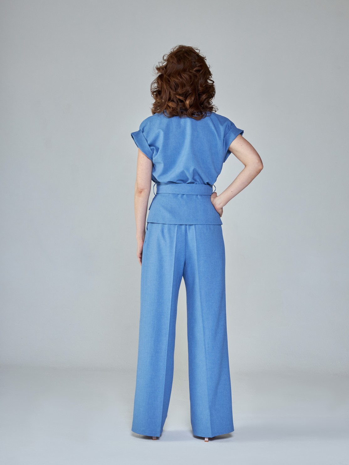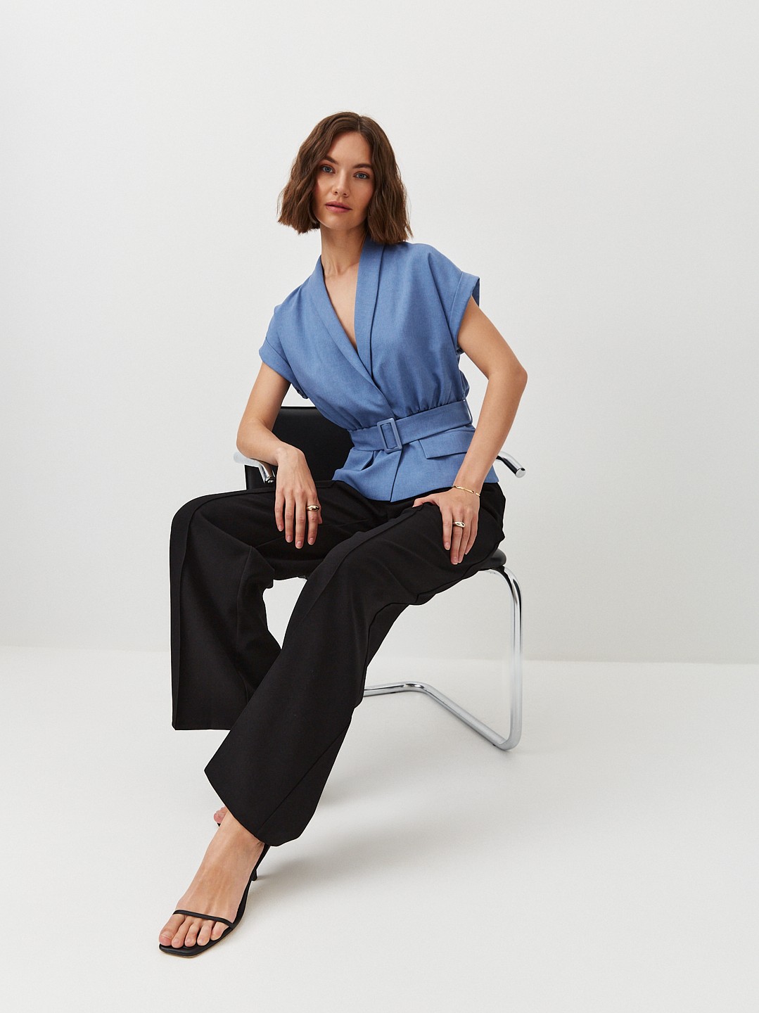 Укороченный жакет на тонкой подкладке. Изящный силуэт, короткий рукав, пояс на талии и декоративные карманы. Благодаря лёгкому материалу жакет прекрасно драпируется и держит форму, но при этом практически не мнётся. А лён в составе делает его идеальным для лета.