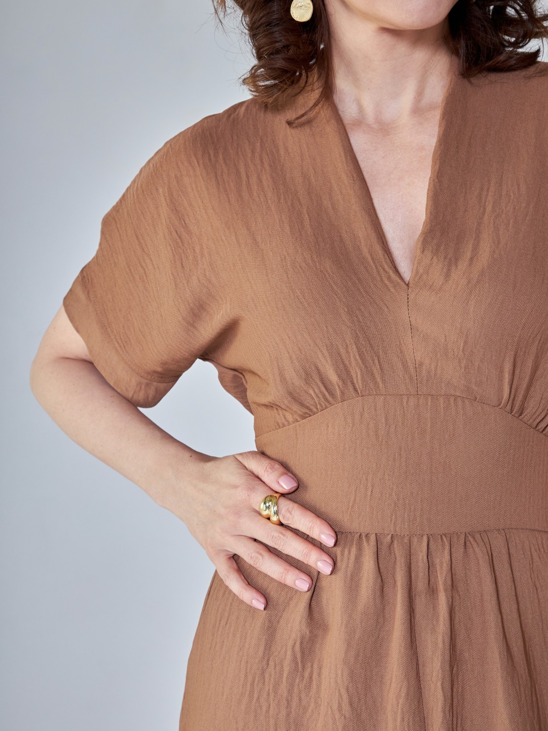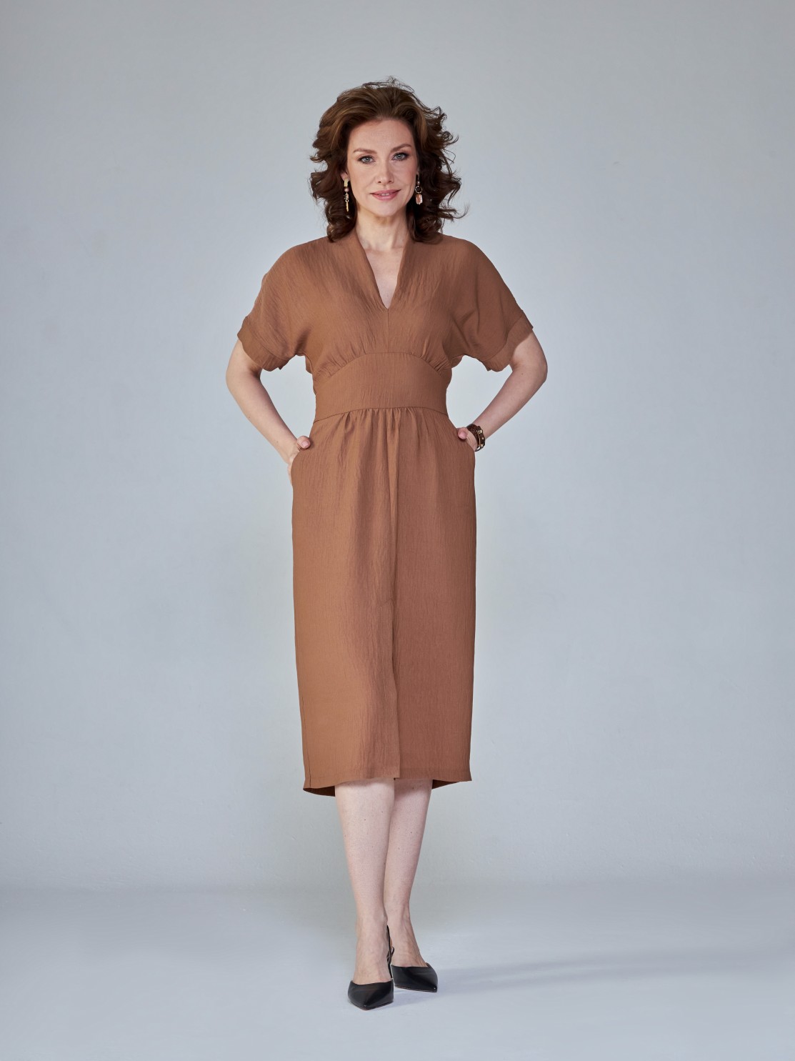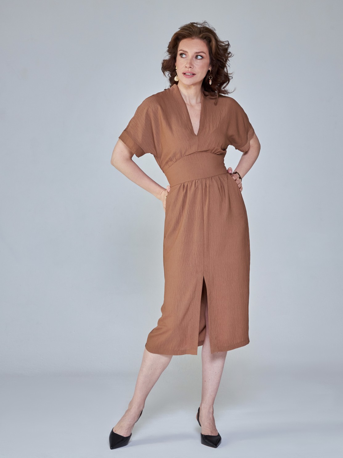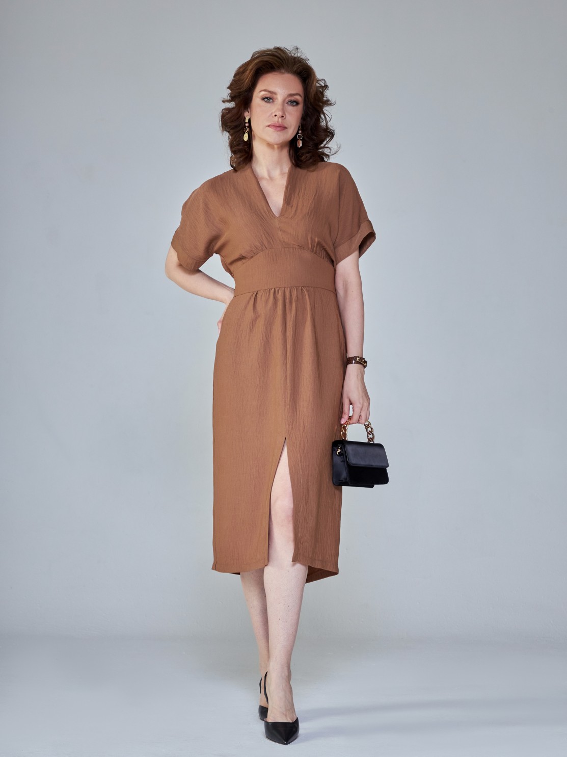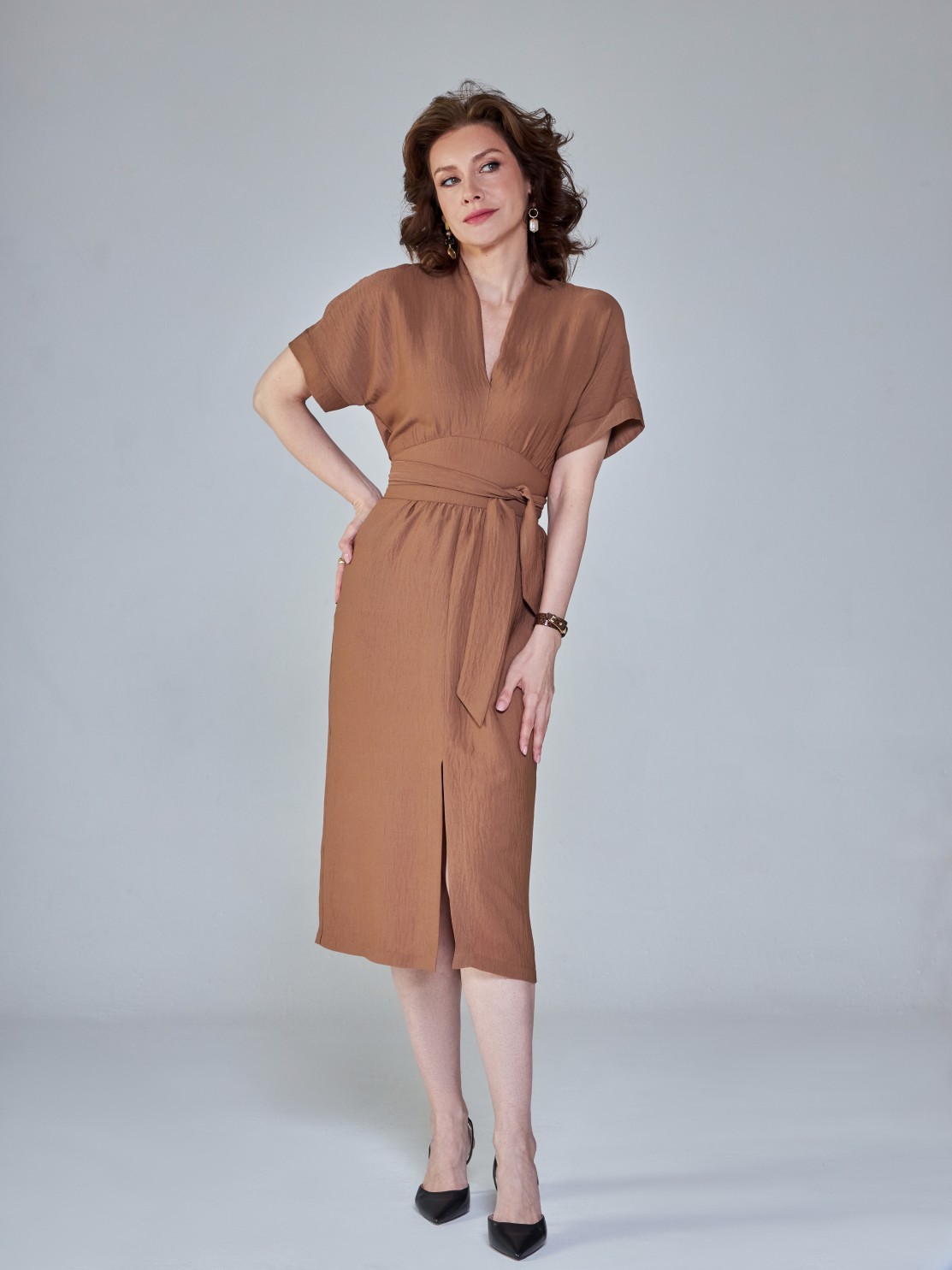 Элегантное платье с коротким рукавом и карманами из фактурной ткани с «жатым» эффектом. Вшитый пояс подчёркивает талию. V-образный вырез визуально удлиняет шею, а аккуратный разрез на юбке добавляет строгому платью игривости