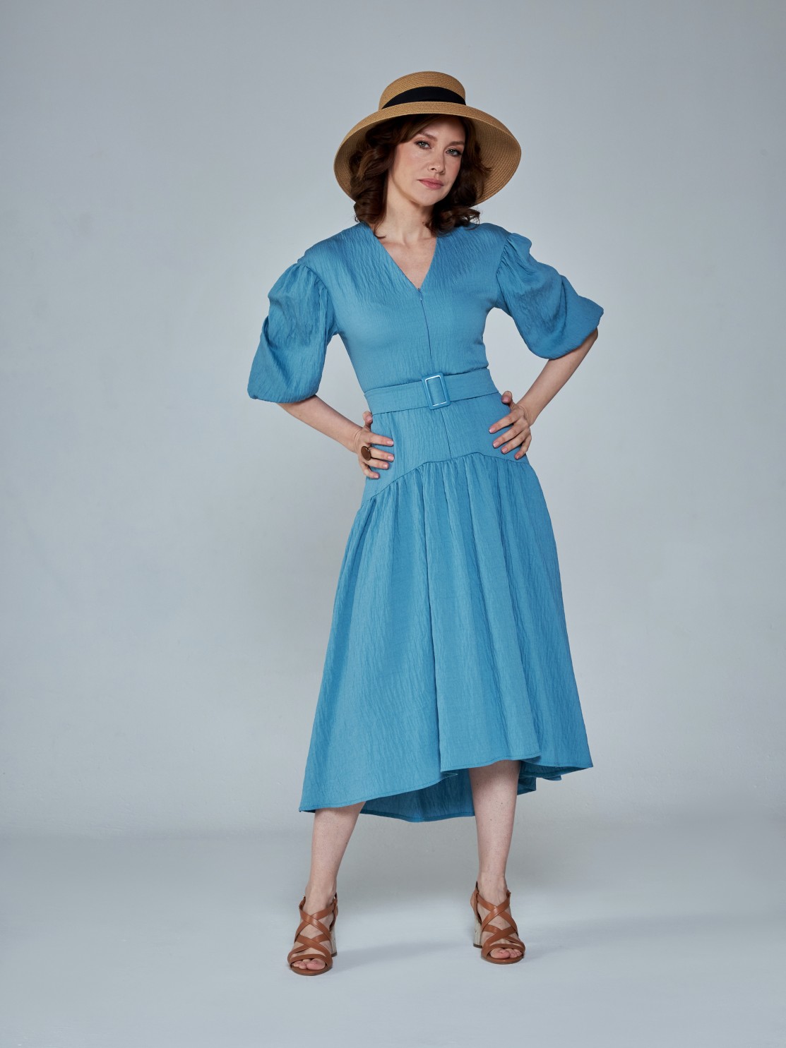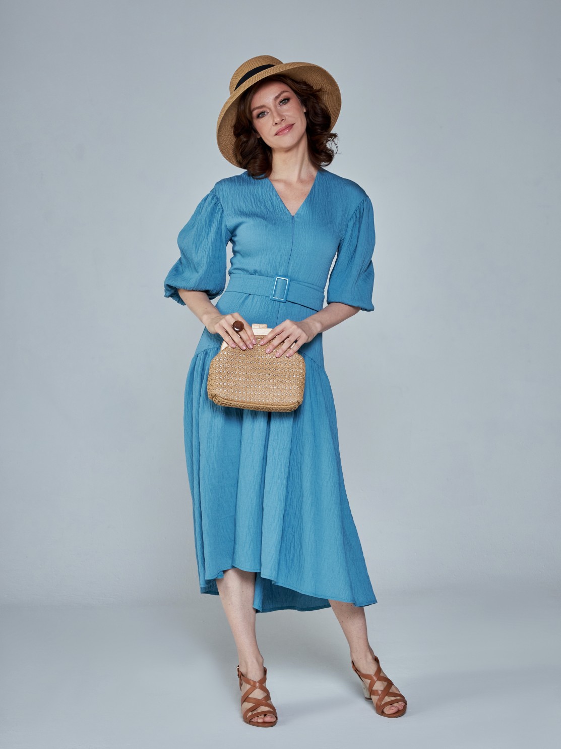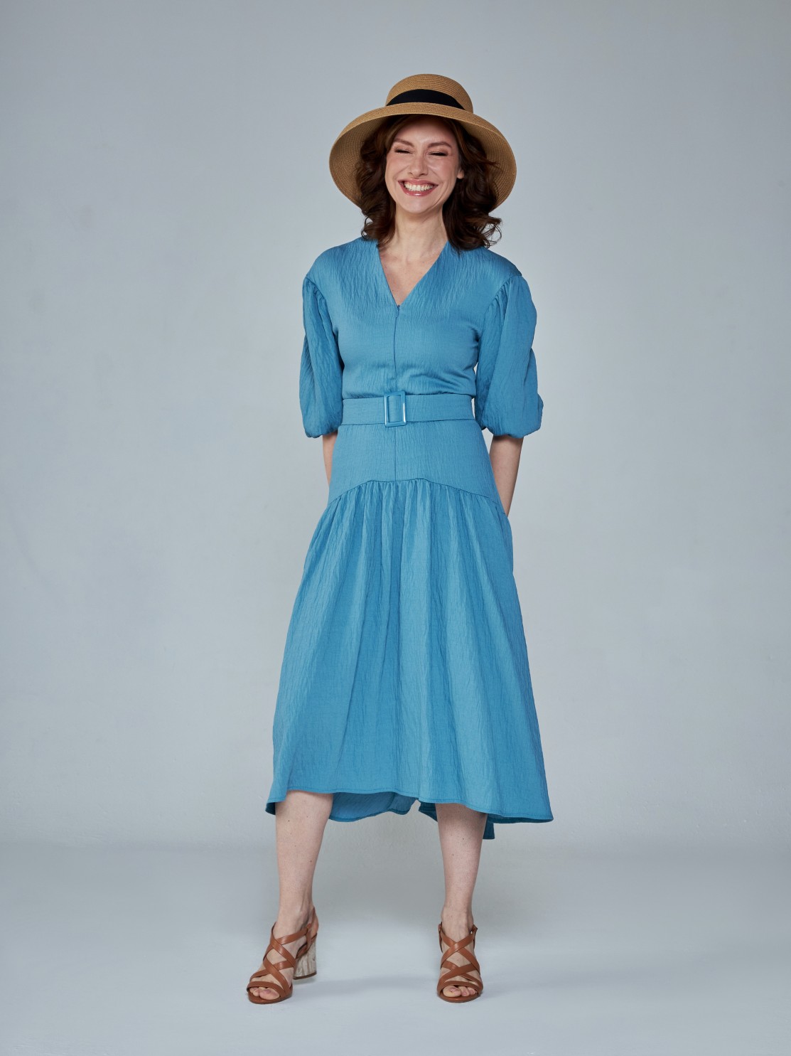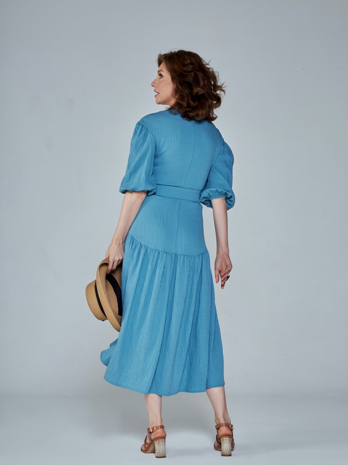 Летнее платье с пышной юбкой из лёгкой фактурной ткани. Приталенный силуэт, объёмные рукава, акцент на талии и спущенная линия юбки. Фигура в таком платье выглядит изящнее и женственнее. Модель застёгивается на потайную молнию спереди, так что вы сможете менять глубину выреза по собственному желанию.