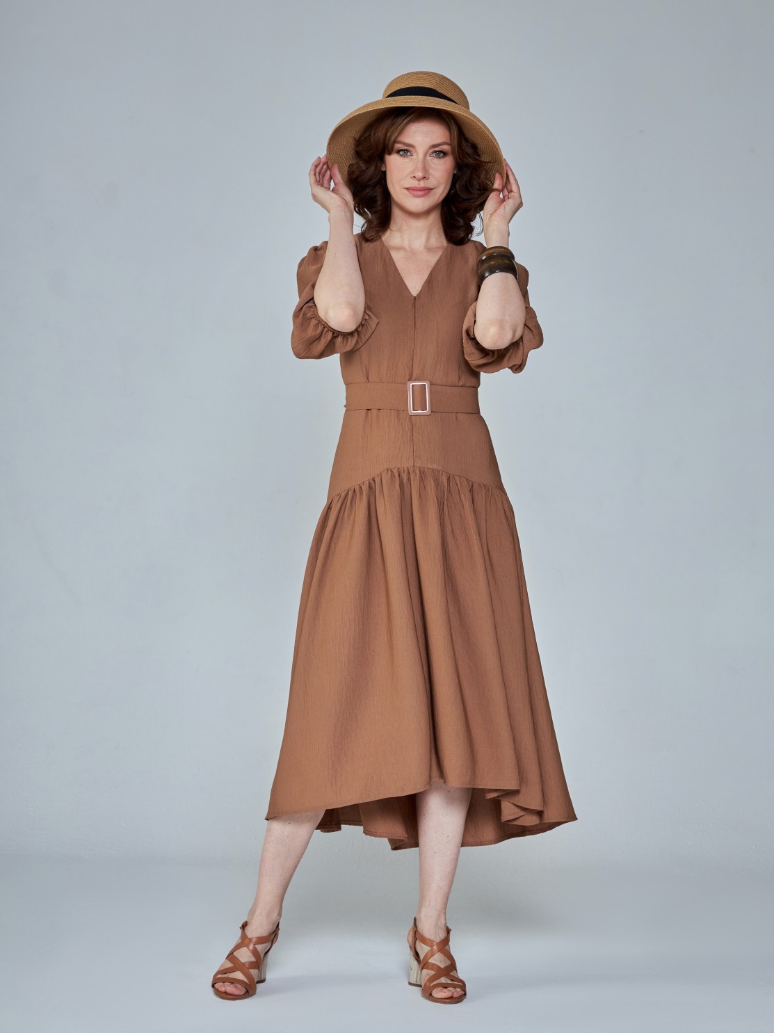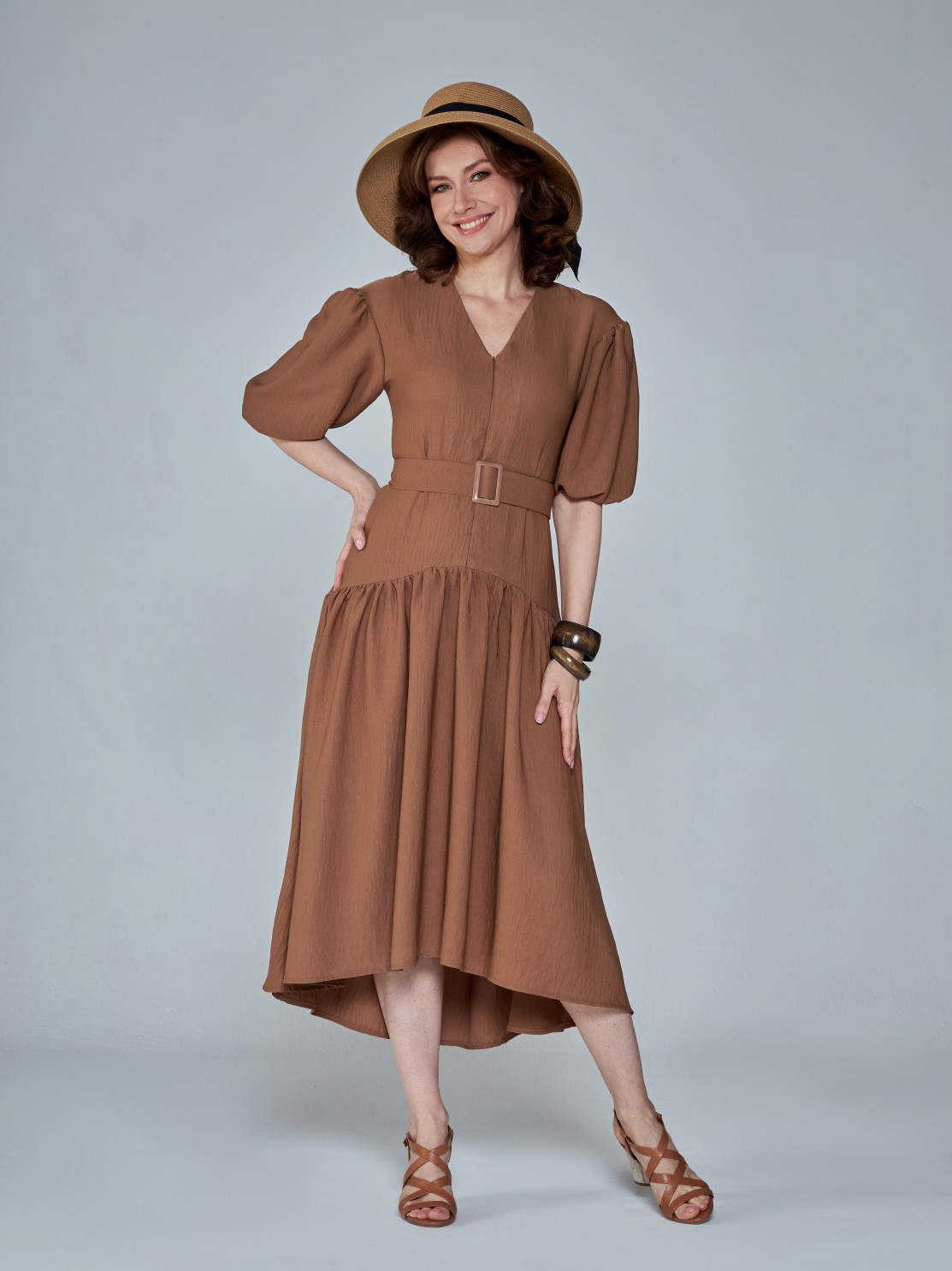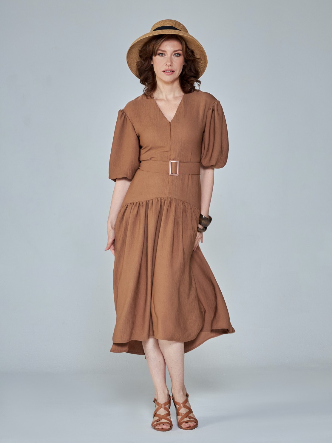 Летнее платье с пышной юбкой из лёгкой фактурной ткани. Приталенный силуэт, объёмные рукава, акцент на талии и спущенная линия юбки. Фигура в таком платье выглядит изящнее и женственнее. Модель застёгивается на потайную молнию спереди, так что вы сможете менять глубину выреза по собственному желанию.