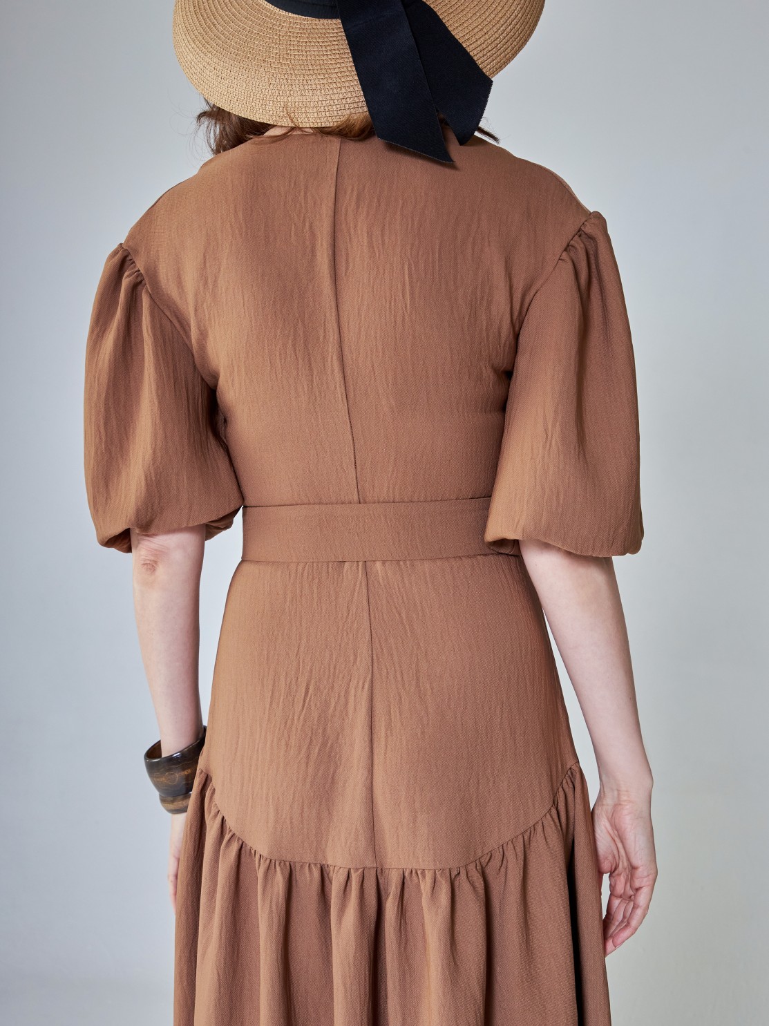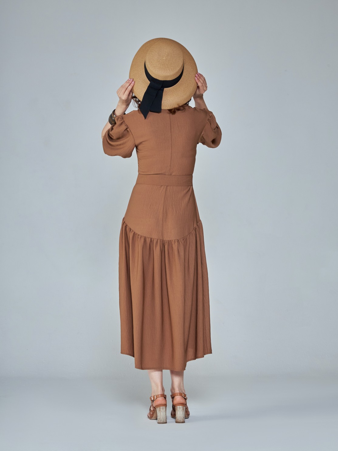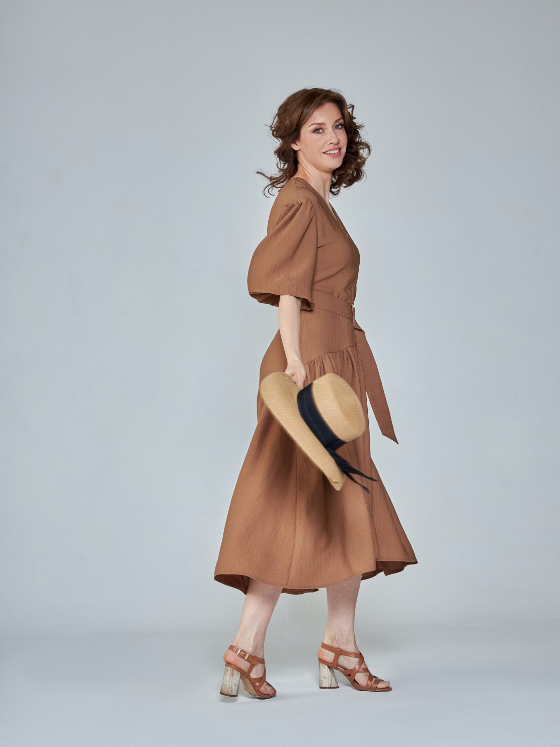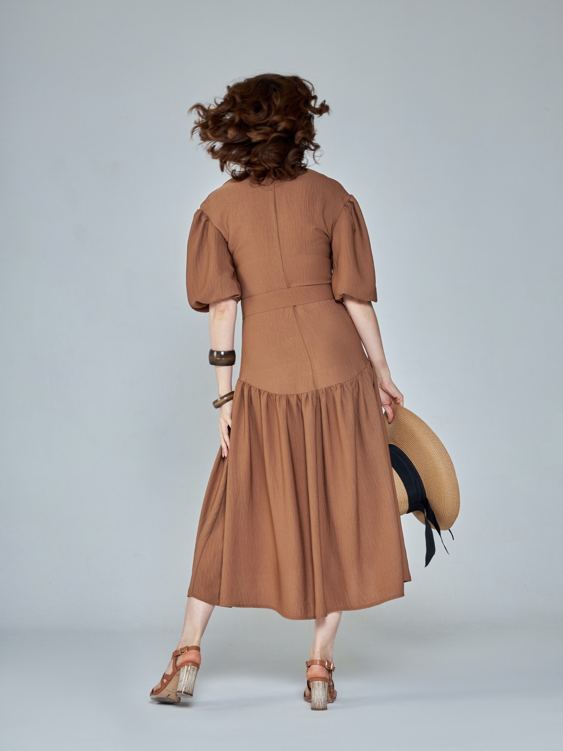 Летнее платье с пышной юбкой из лёгкой фактурной ткани. Приталенный силуэт, объёмные рукава, акцент на талии и спущенная линия юбки. Фигура в таком платье выглядит изящнее и женственнее. Модель застёгивается на потайную молнию спереди, так что вы сможете менять глубину выреза по собственному желанию.