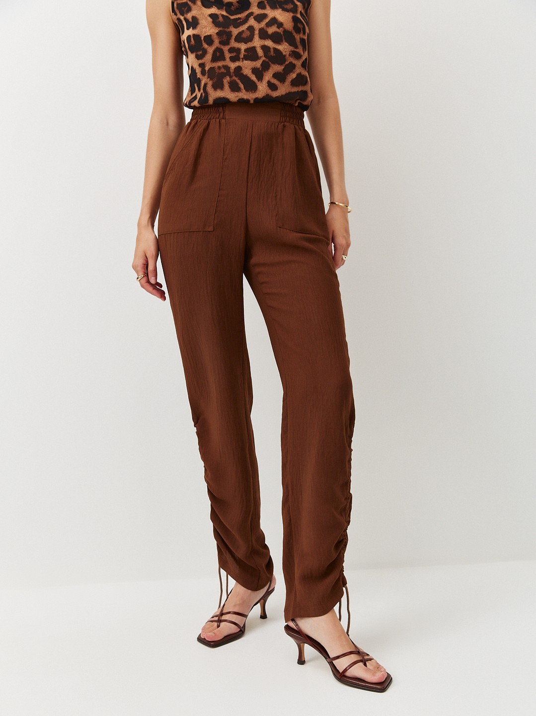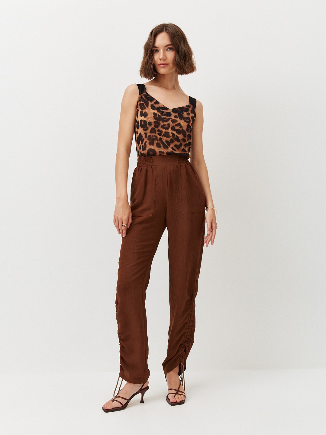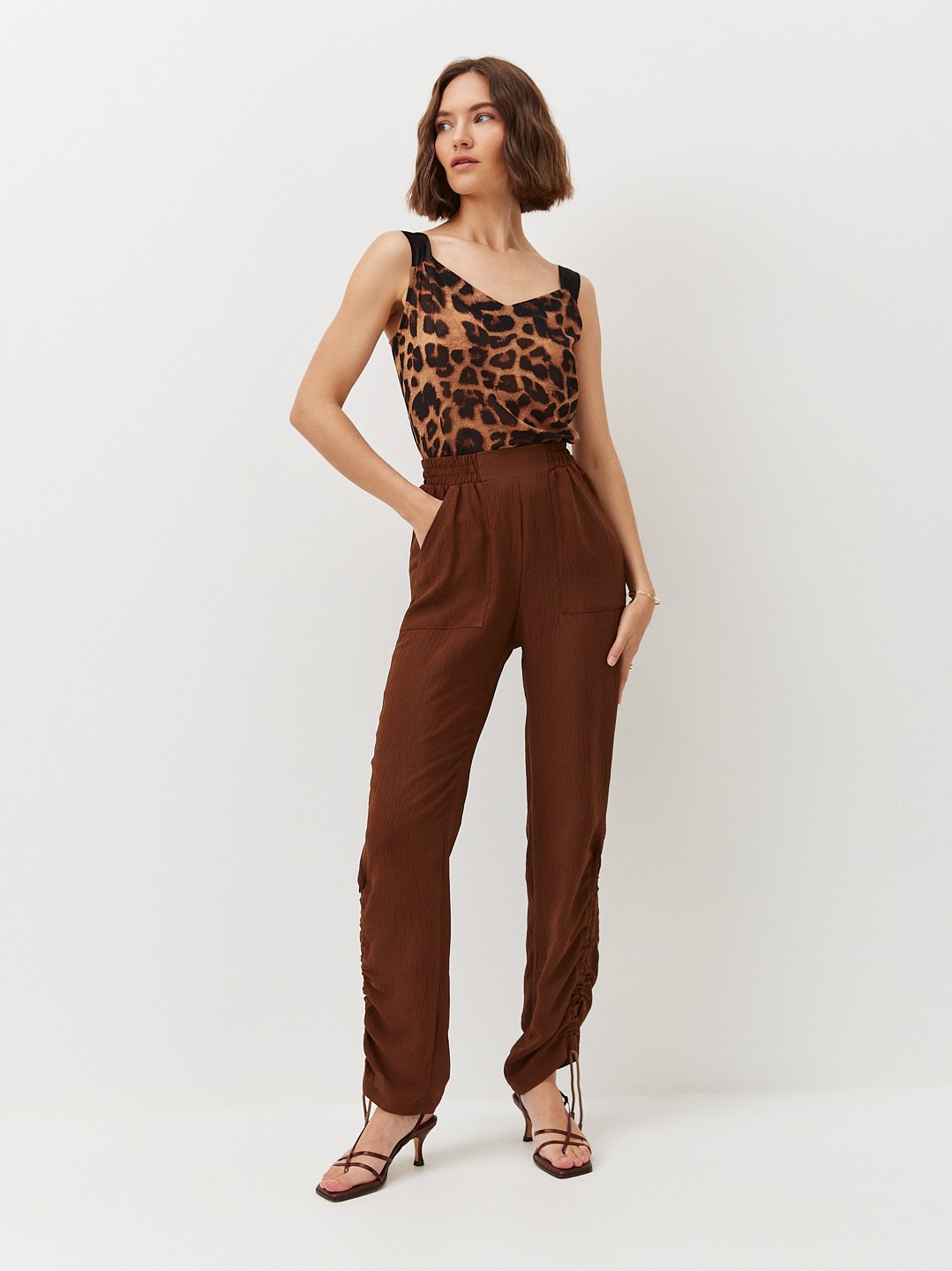 Свободные брюки с накладными карманами и завязками по низу. Пояс на эластичной резинке, глубокие карманы и дышащая фактурная ткань с «жатым» эффектом делают эту модель очень комфортной и практичной для повседневной носки.