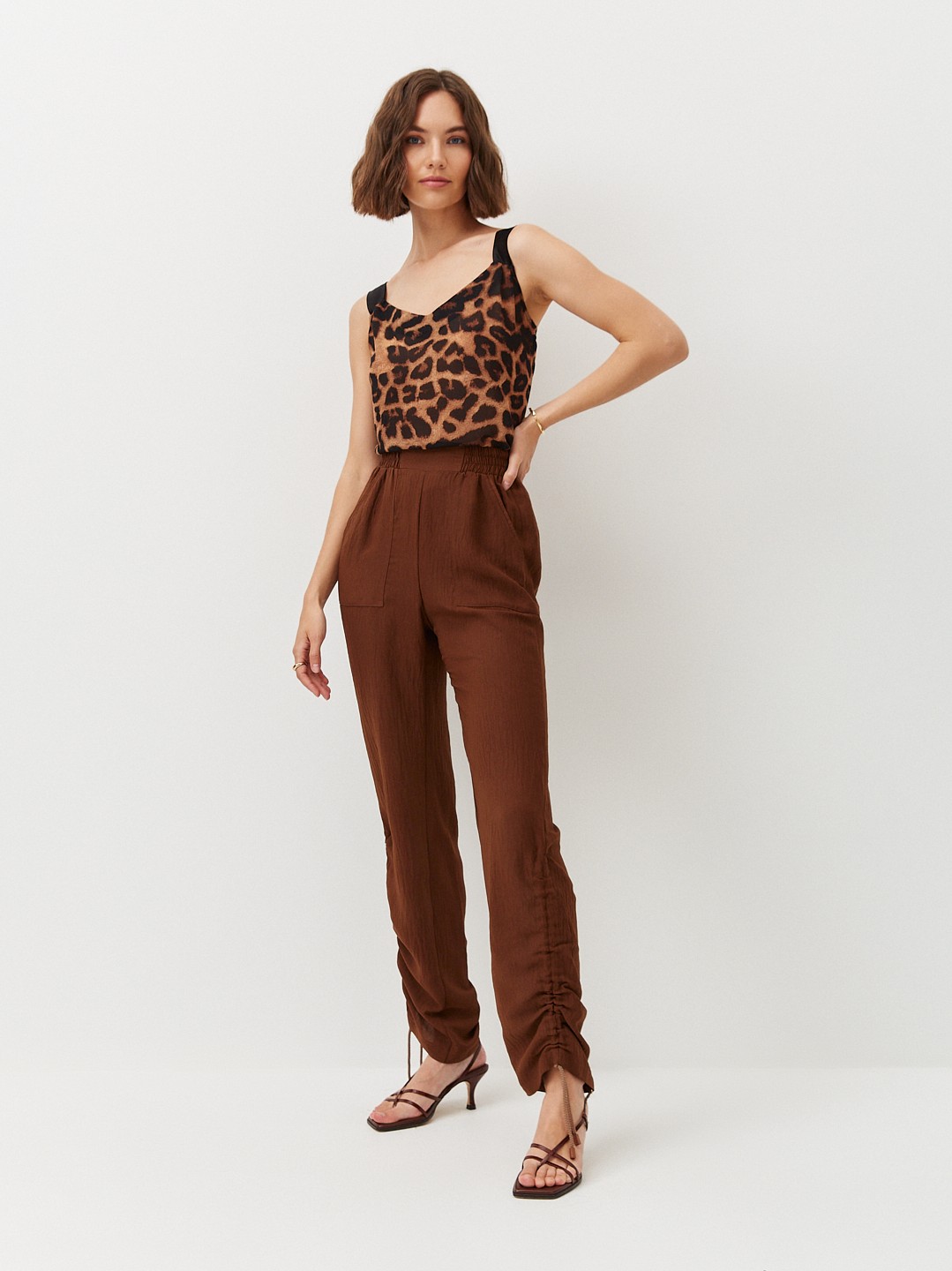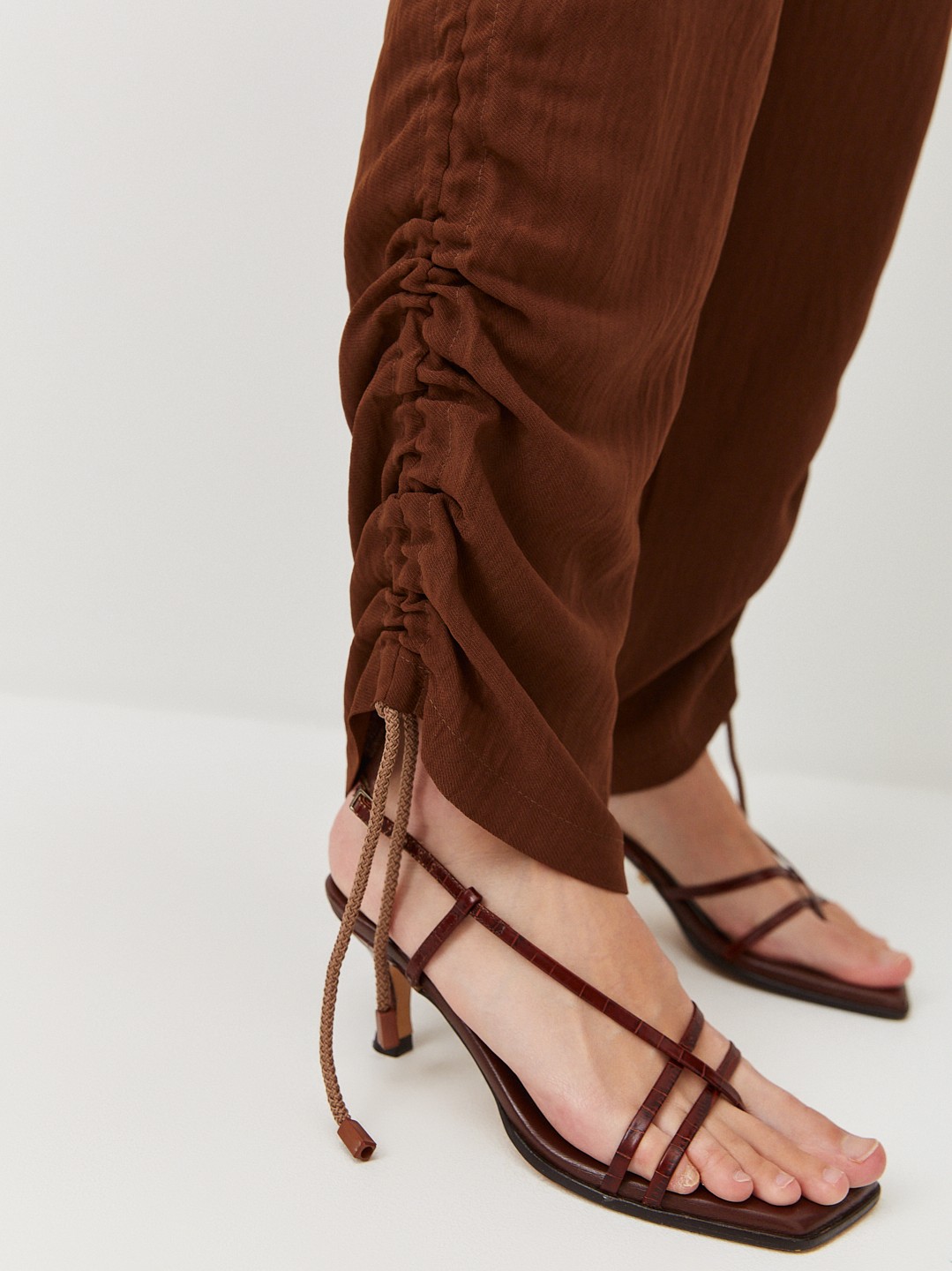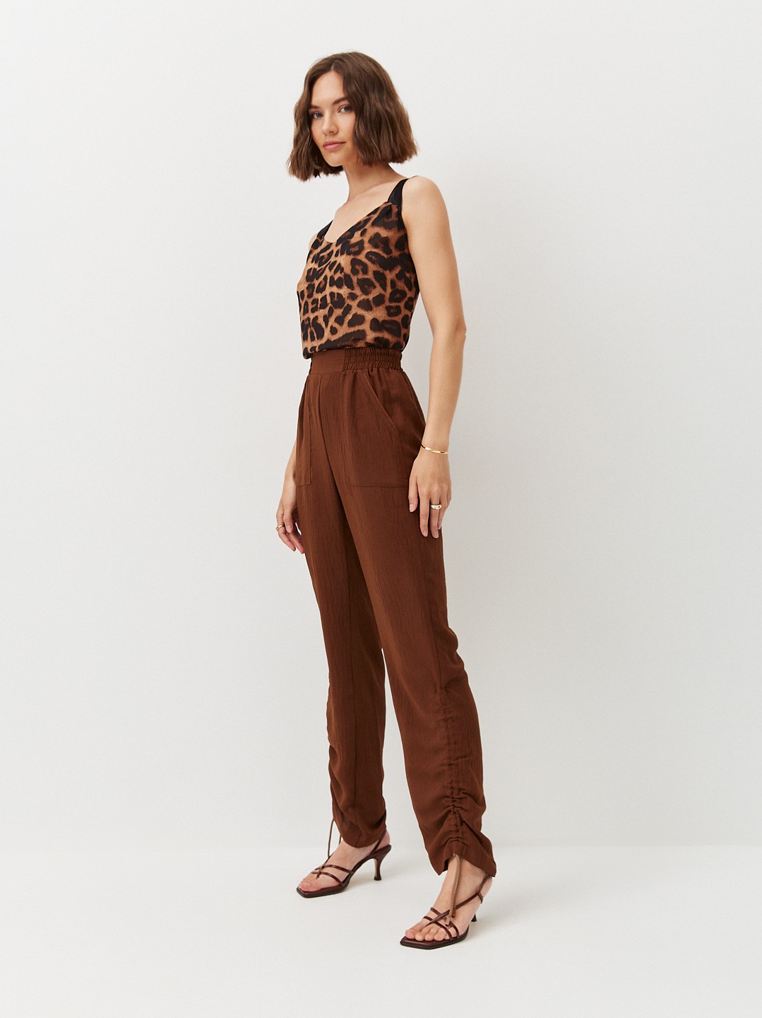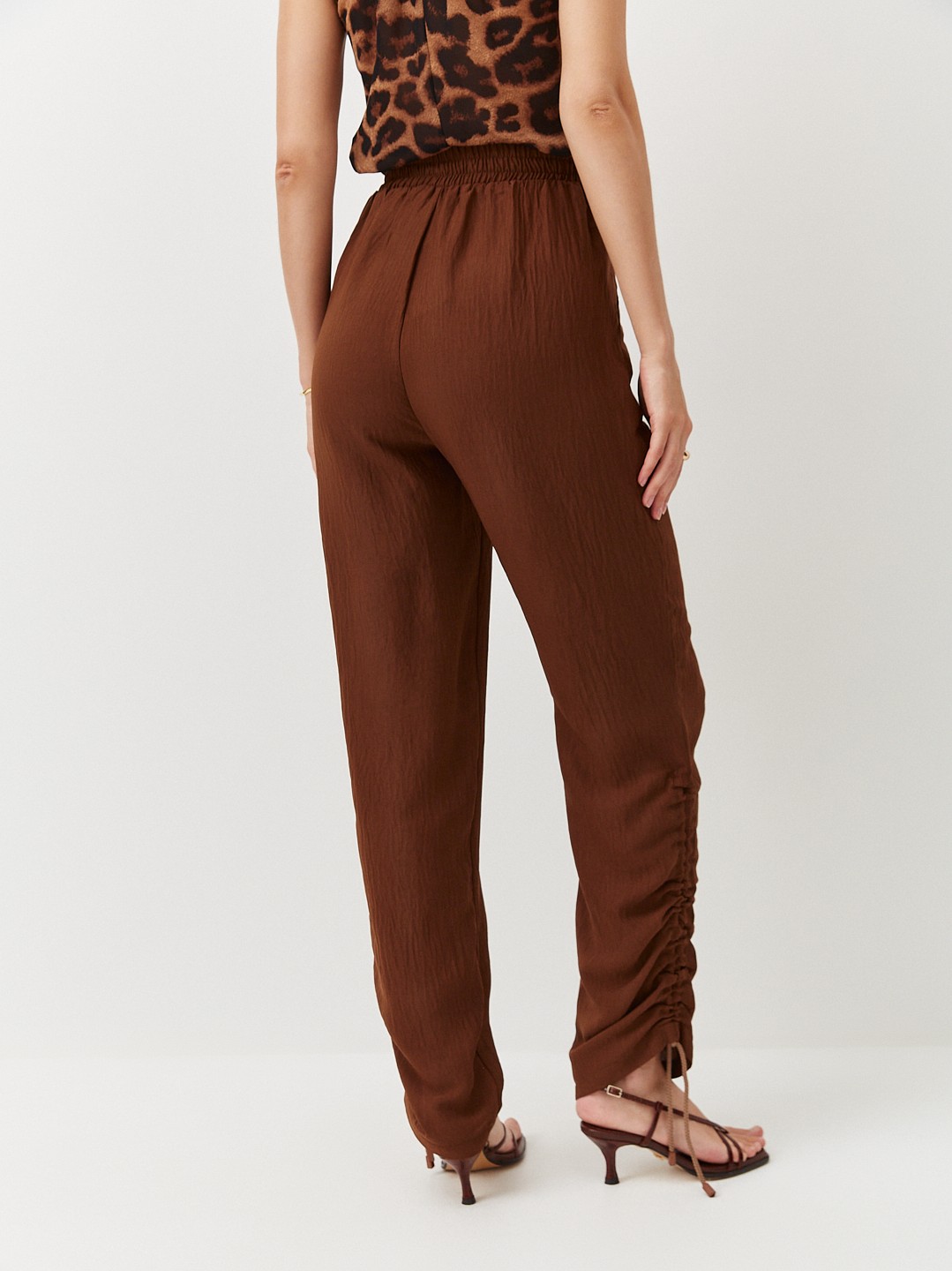 Свободные брюки с накладными карманами и завязками по низу. Пояс на эластичной резинке, глубокие карманы и дышащая фактурная ткань с «жатым» эффектом делают эту модель очень комфортной и практичной для повседневной носки.