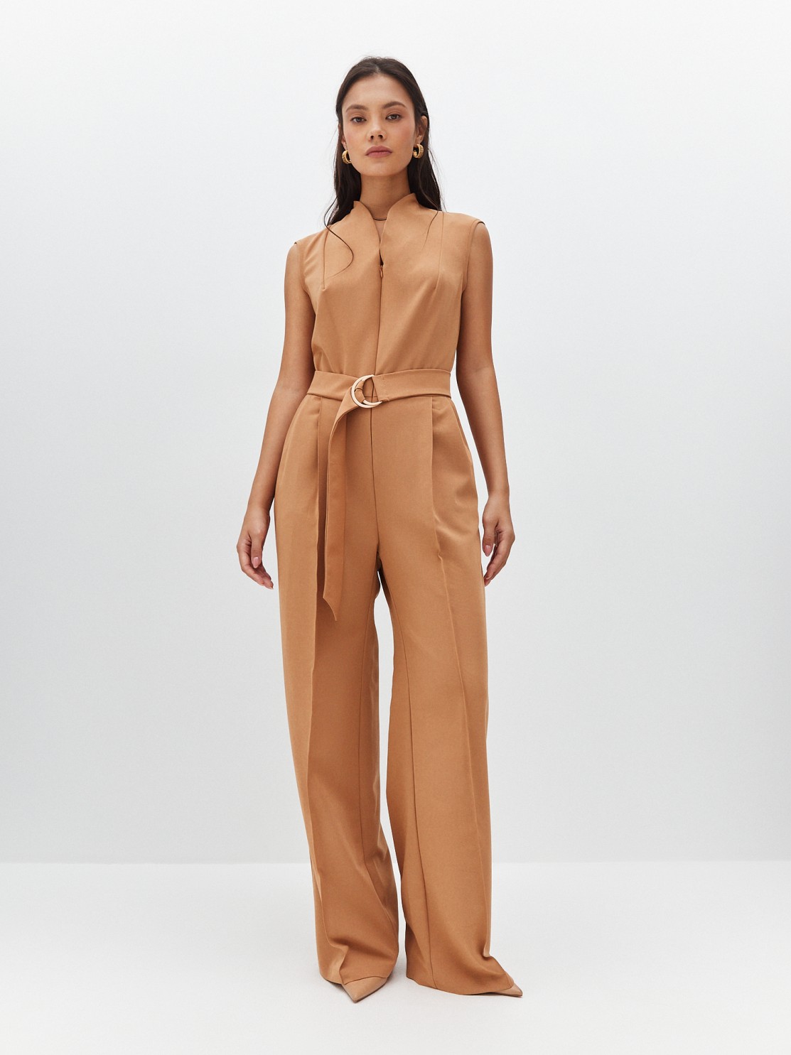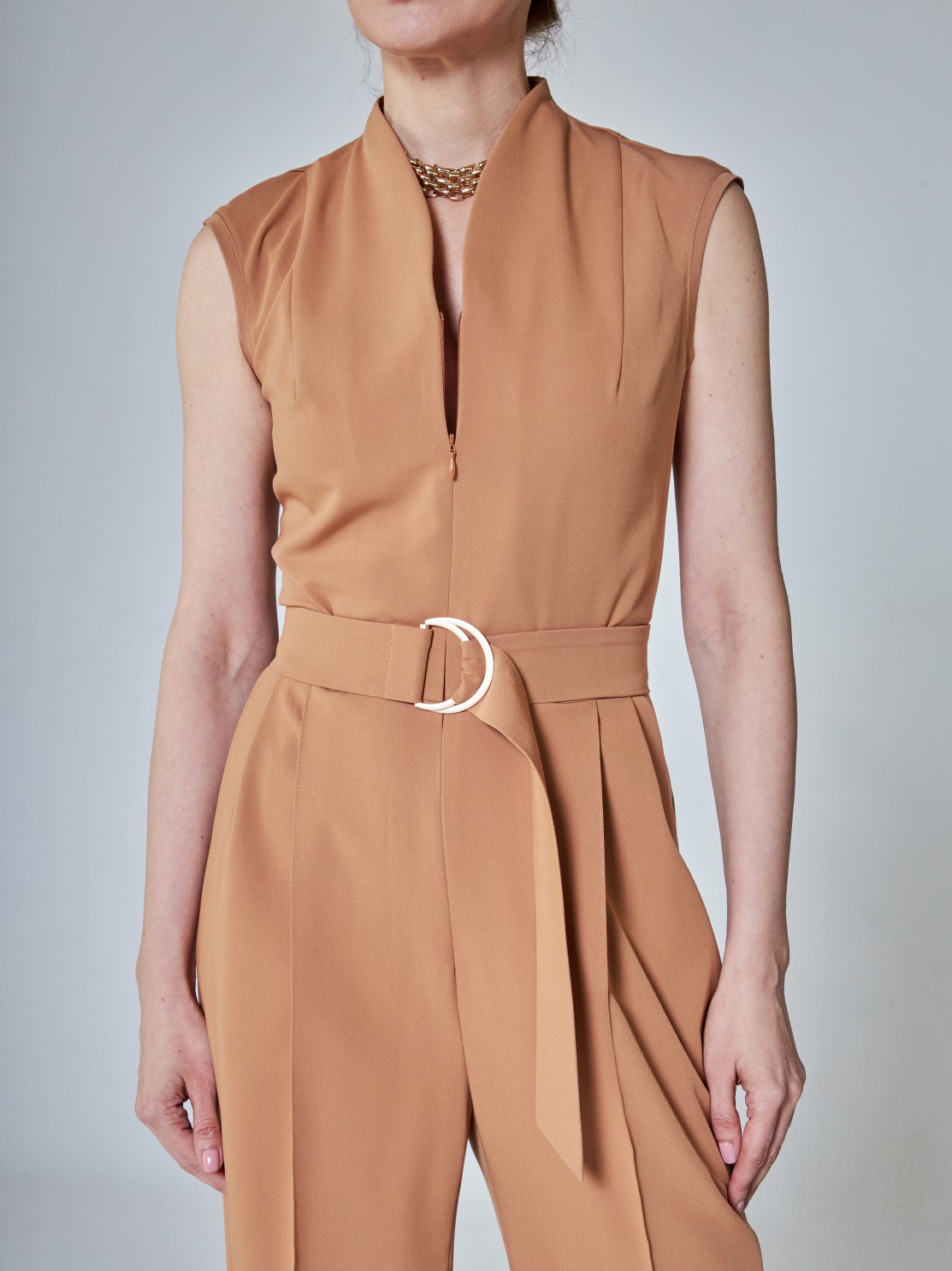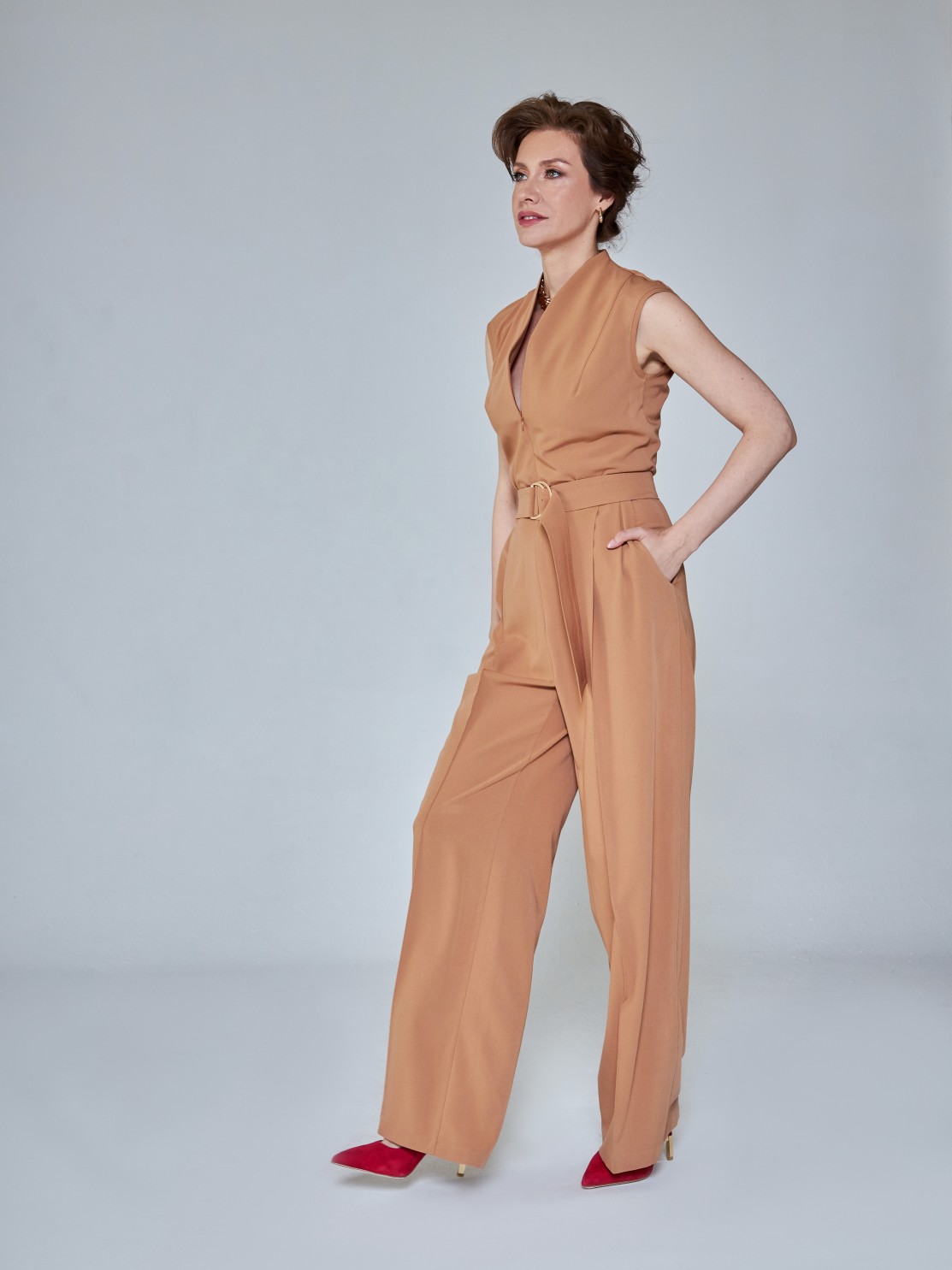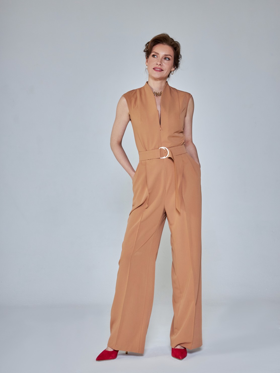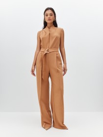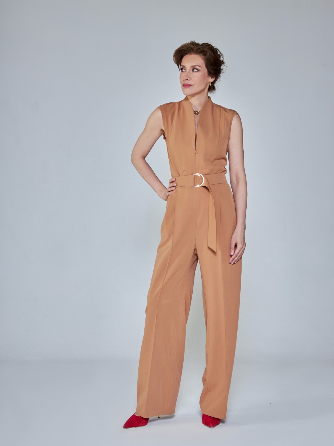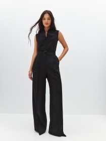 Элегантный комбинезон, который выгодно подчёркивает достоинства фигуры. Широкие брюки визуально удлиняют ноги, глубокий вырез — шею, пояс с пряжкой делает акцент на талии. Женственный силуэт, комфортная посадка и маломнущаяся ткань делают его идеальным нарядом для деловых и активных женщин.