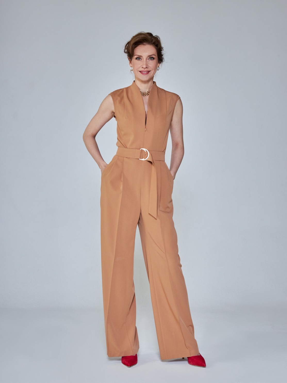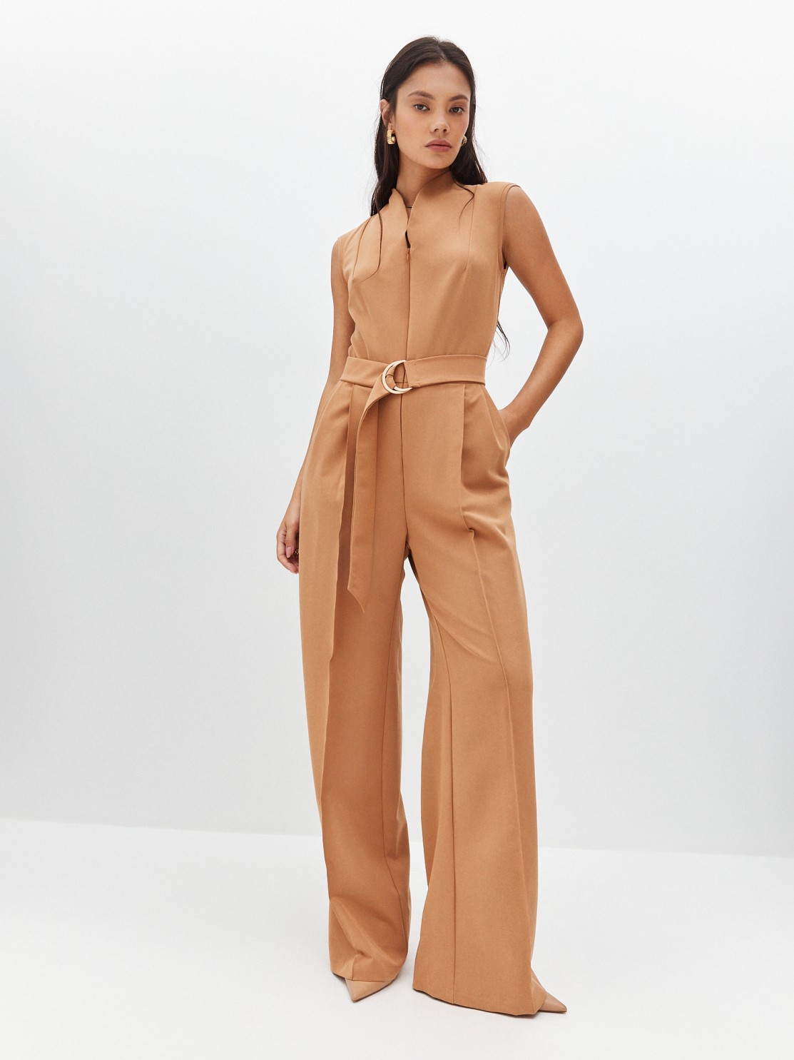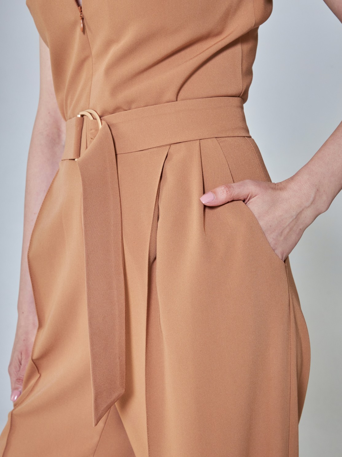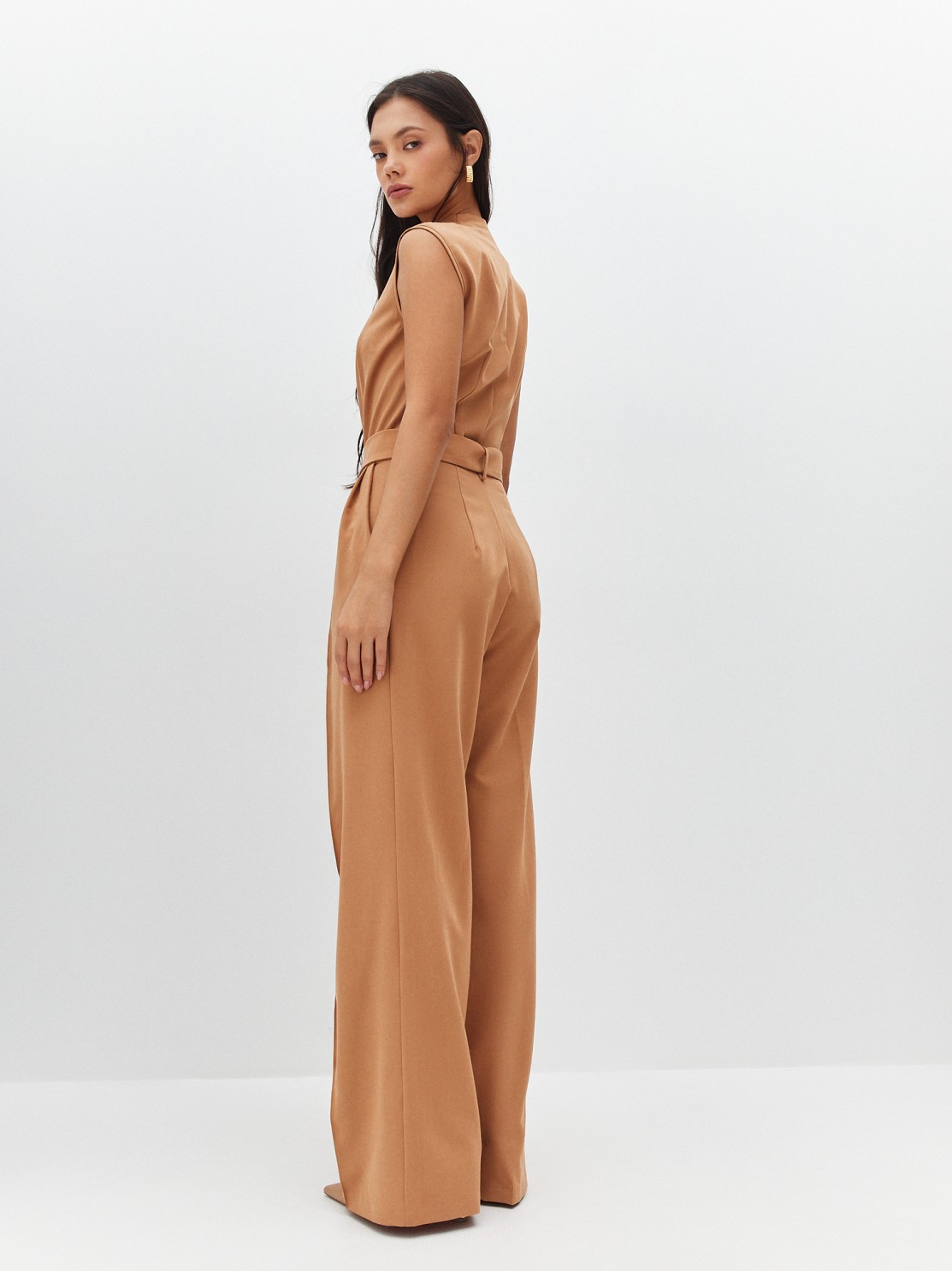 Элегантный комбинезон, который выгодно подчёркивает достоинства фигуры. Широкие брюки визуально удлиняют ноги, глубокий вырез — шею, пояс с пряжкой делает акцент на талии. Женственный силуэт, комфортная посадка и маломнущаяся ткань делают его идеальным нарядом для деловых и активных женщин.