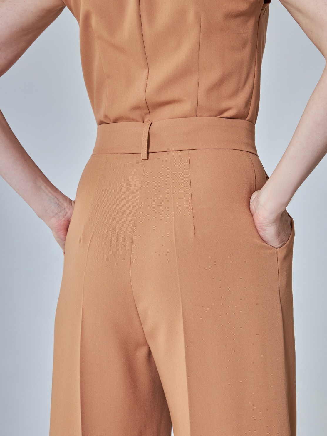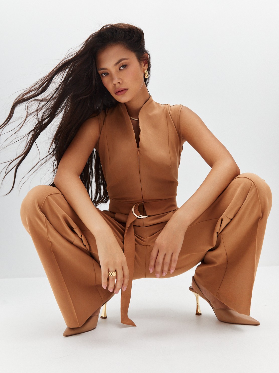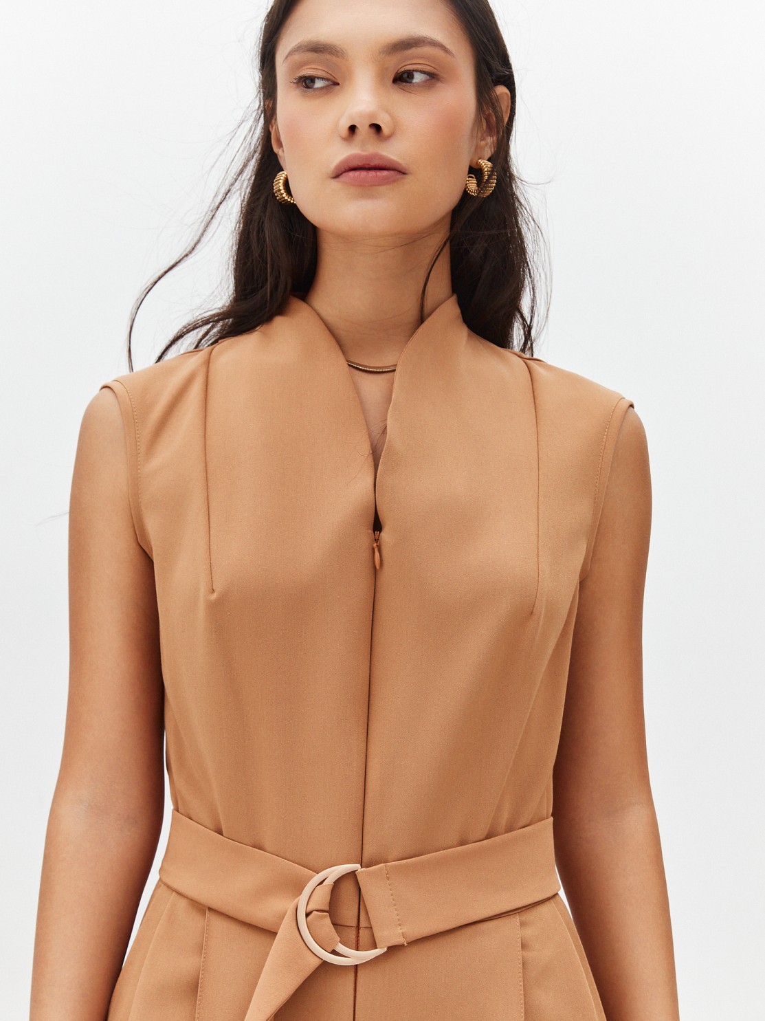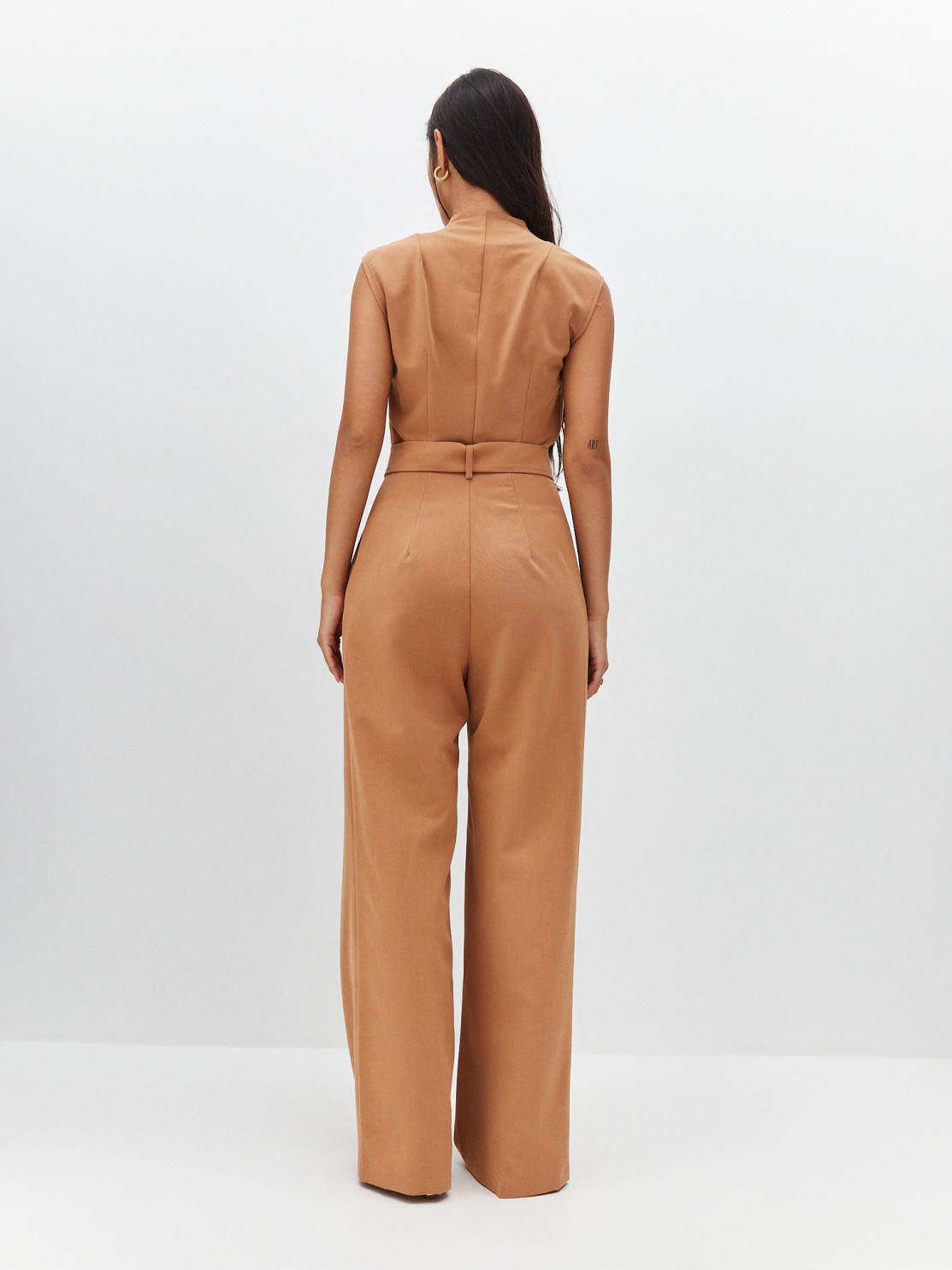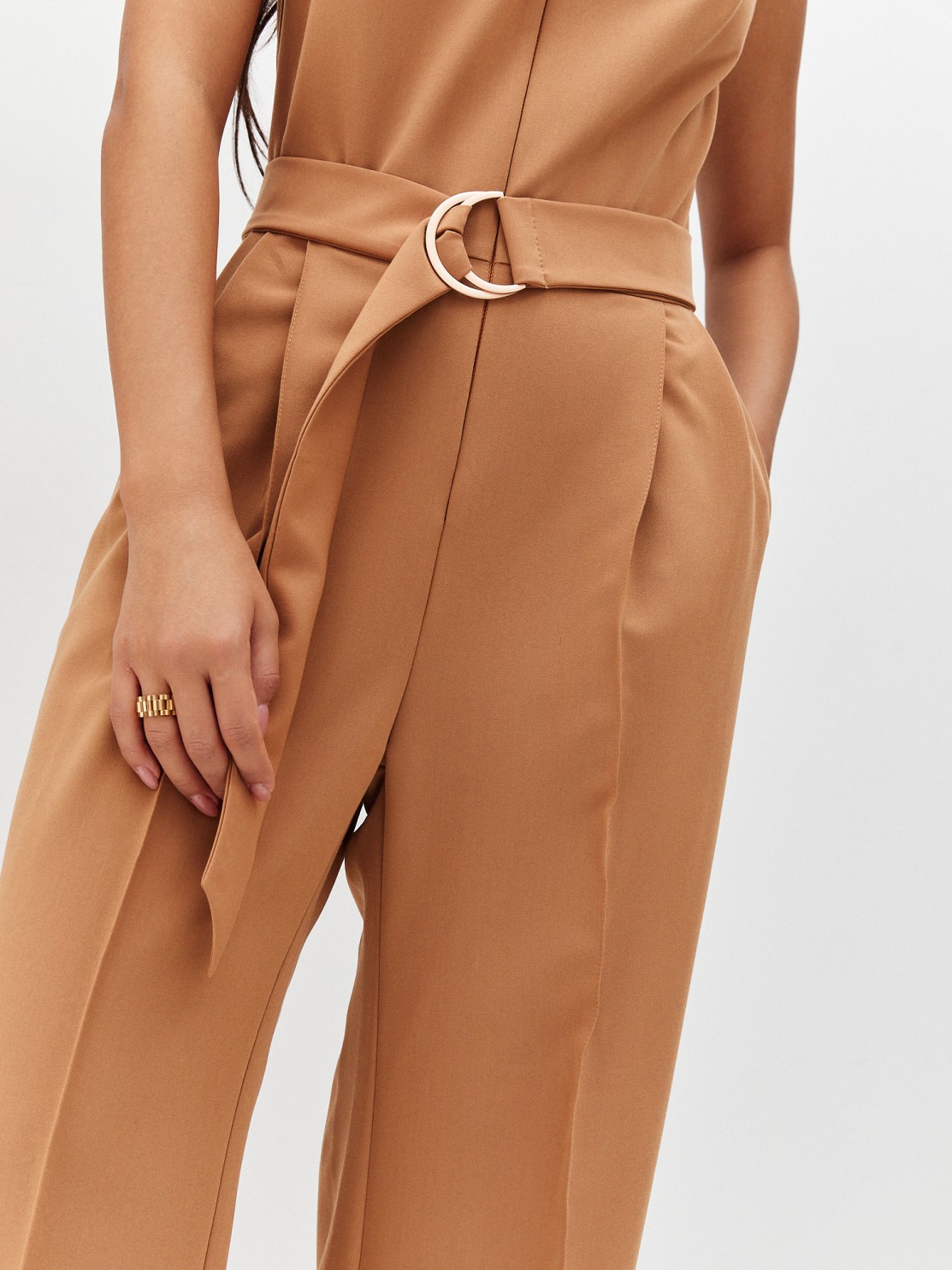 Элегантный комбинезон, который выгодно подчёркивает достоинства фигуры. Широкие брюки визуально удлиняют ноги, глубокий вырез — шею, пояс с пряжкой делает акцент на талии. Женственный силуэт, комфортная посадка и маломнущаяся ткань делают его идеальным нарядом для деловых и активных женщин.