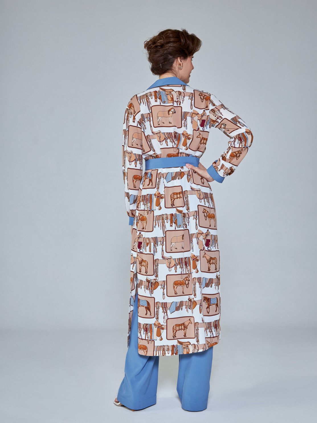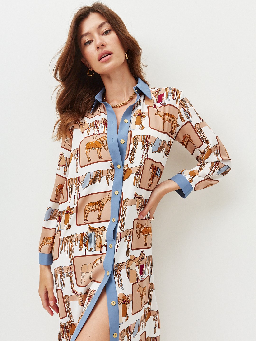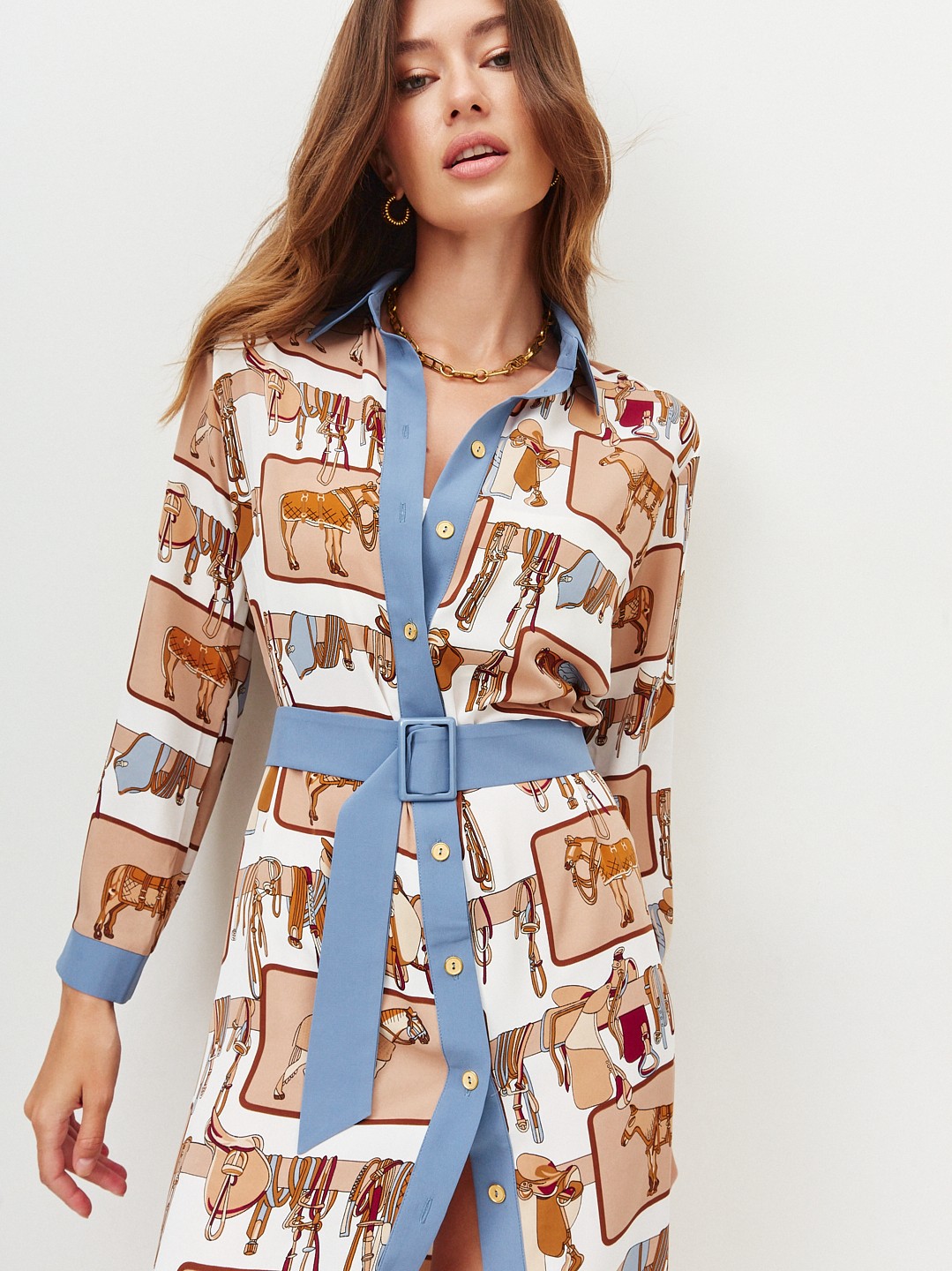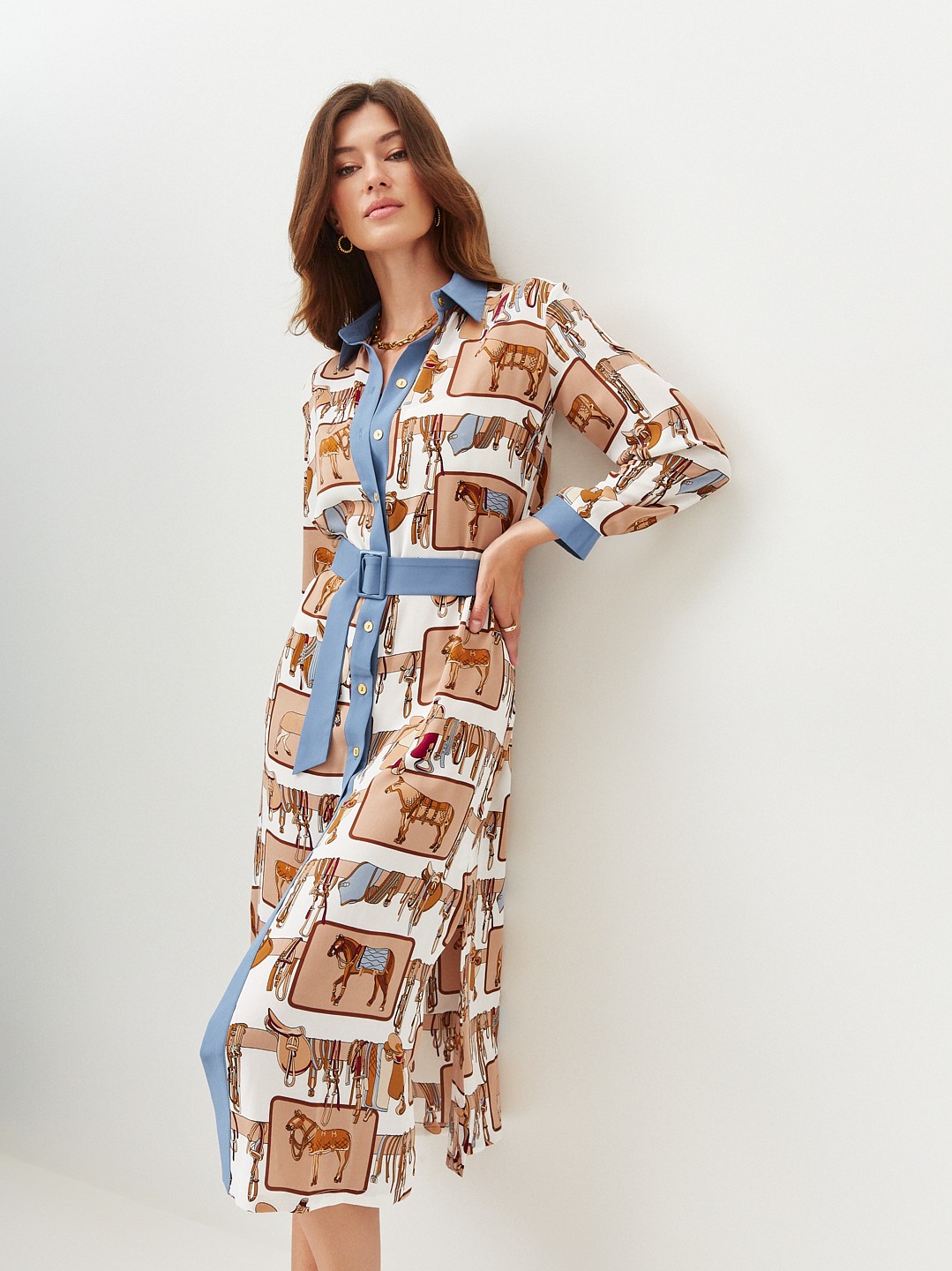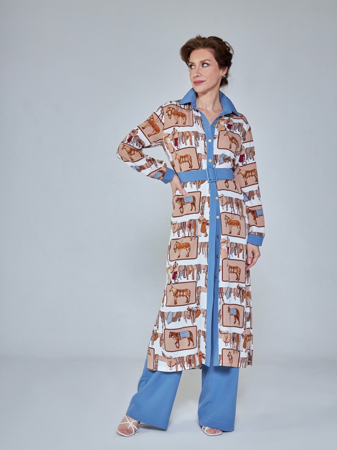 Удлинённое платье-рубашка со стильным принтом. В комплекте есть пояс, застёгивается спереди на пуговицы. Такой фасон выгодно подчёркивает фигуру и даёт простор для модных фантазий. Носите его как эффектное платье, полностью расстёгнутым, как лёгкий кардиган, или вместе с