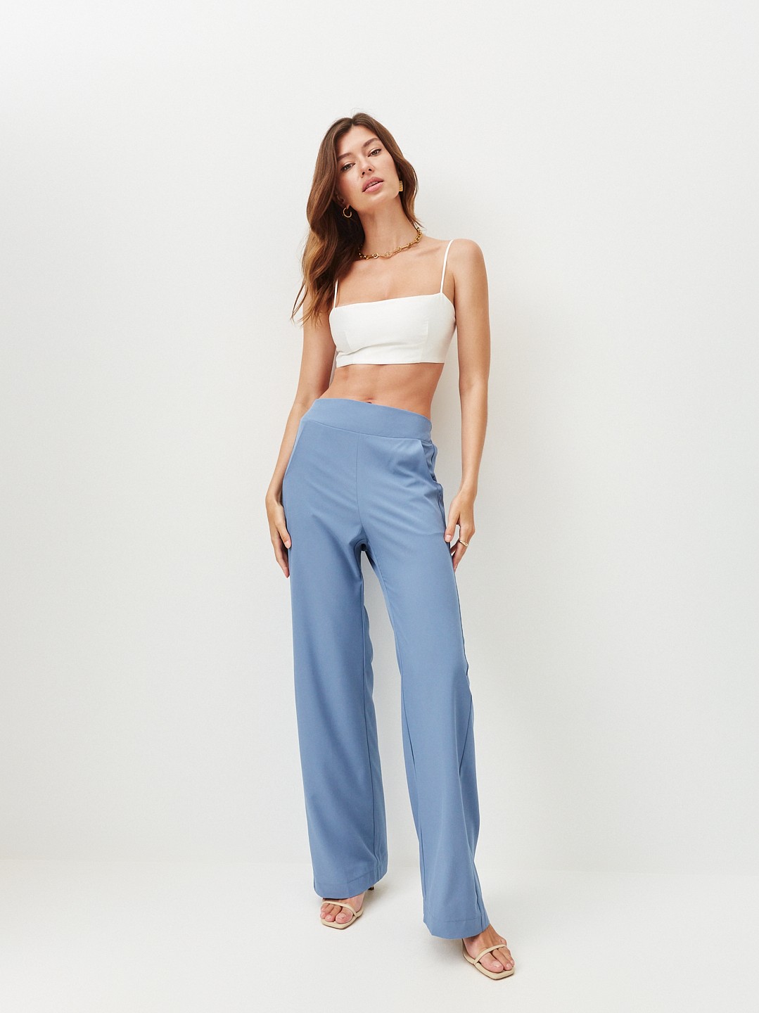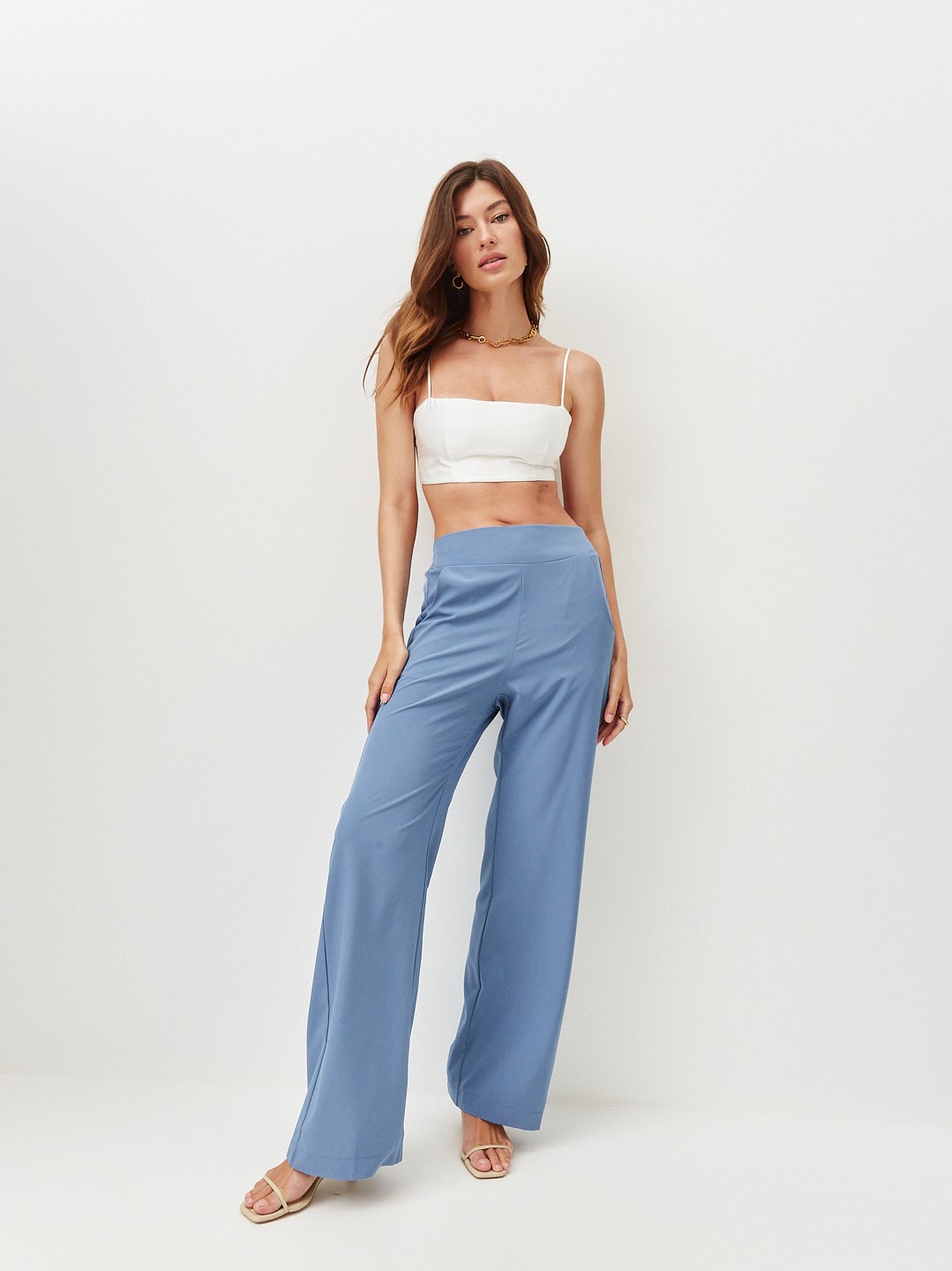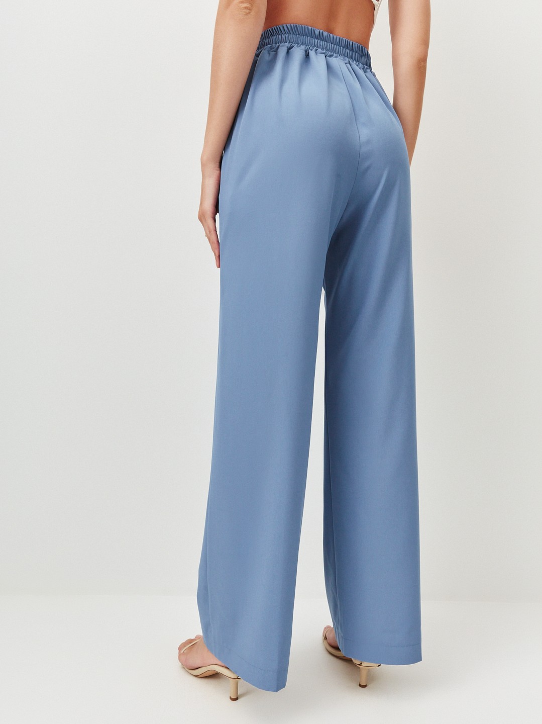 Широкие брюки на эластичной резинке светло-синего оттенка. Выполнены из комфортной и практичной ткани, которая держит форму и мало мнётся. Сочетайте их с