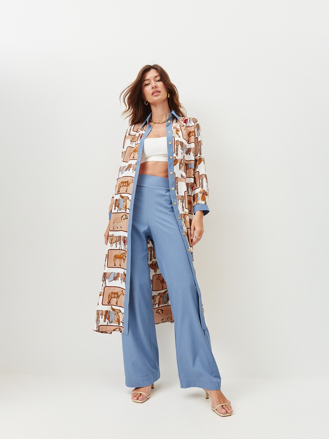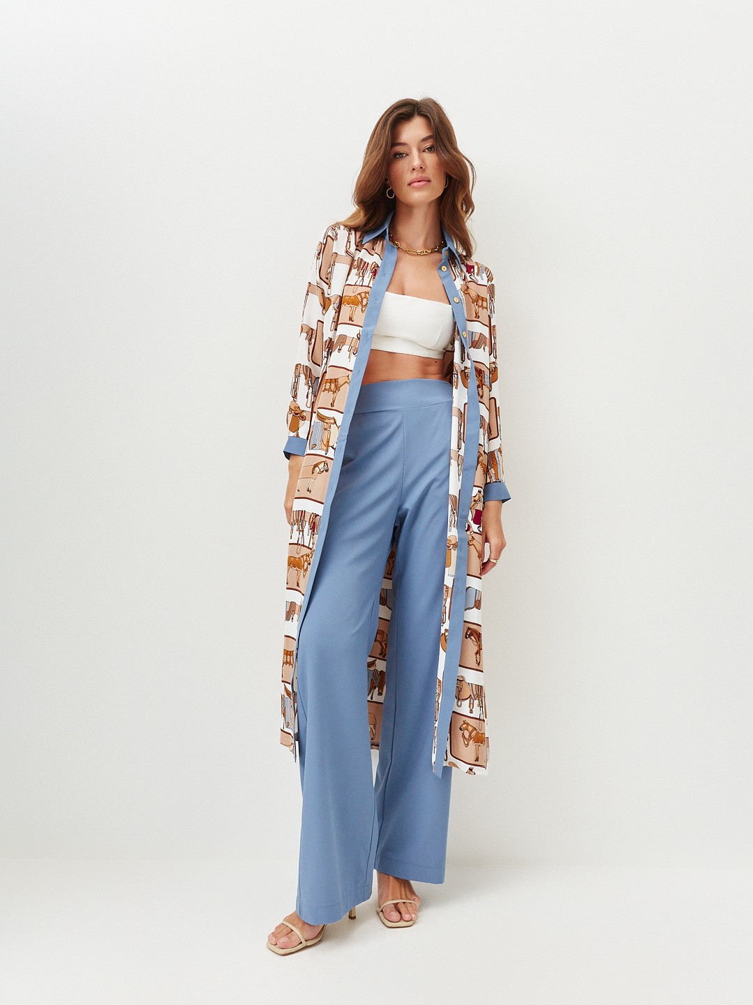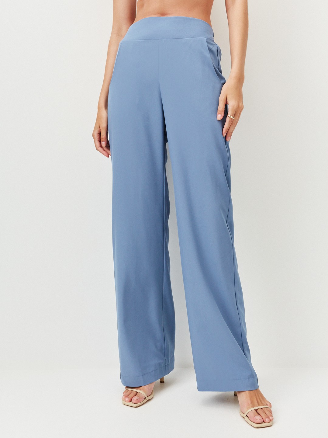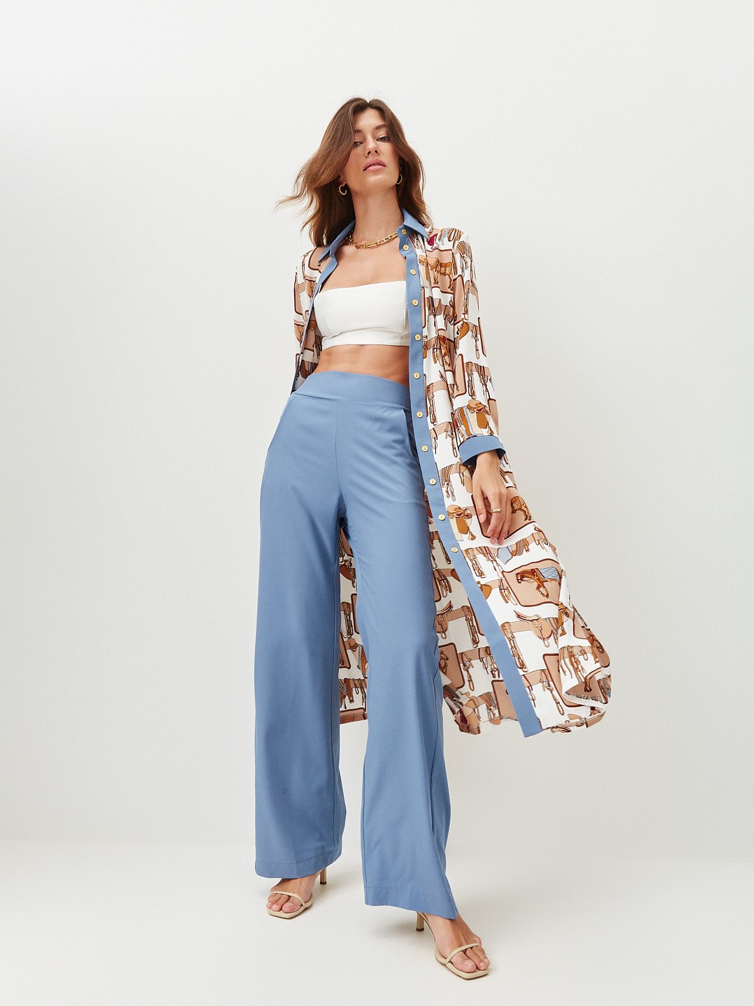 Широкие брюки на эластичной резинке светло-синего оттенка. Выполнены из комфортной и практичной ткани, которая держит форму и мало мнётся. Сочетайте их с