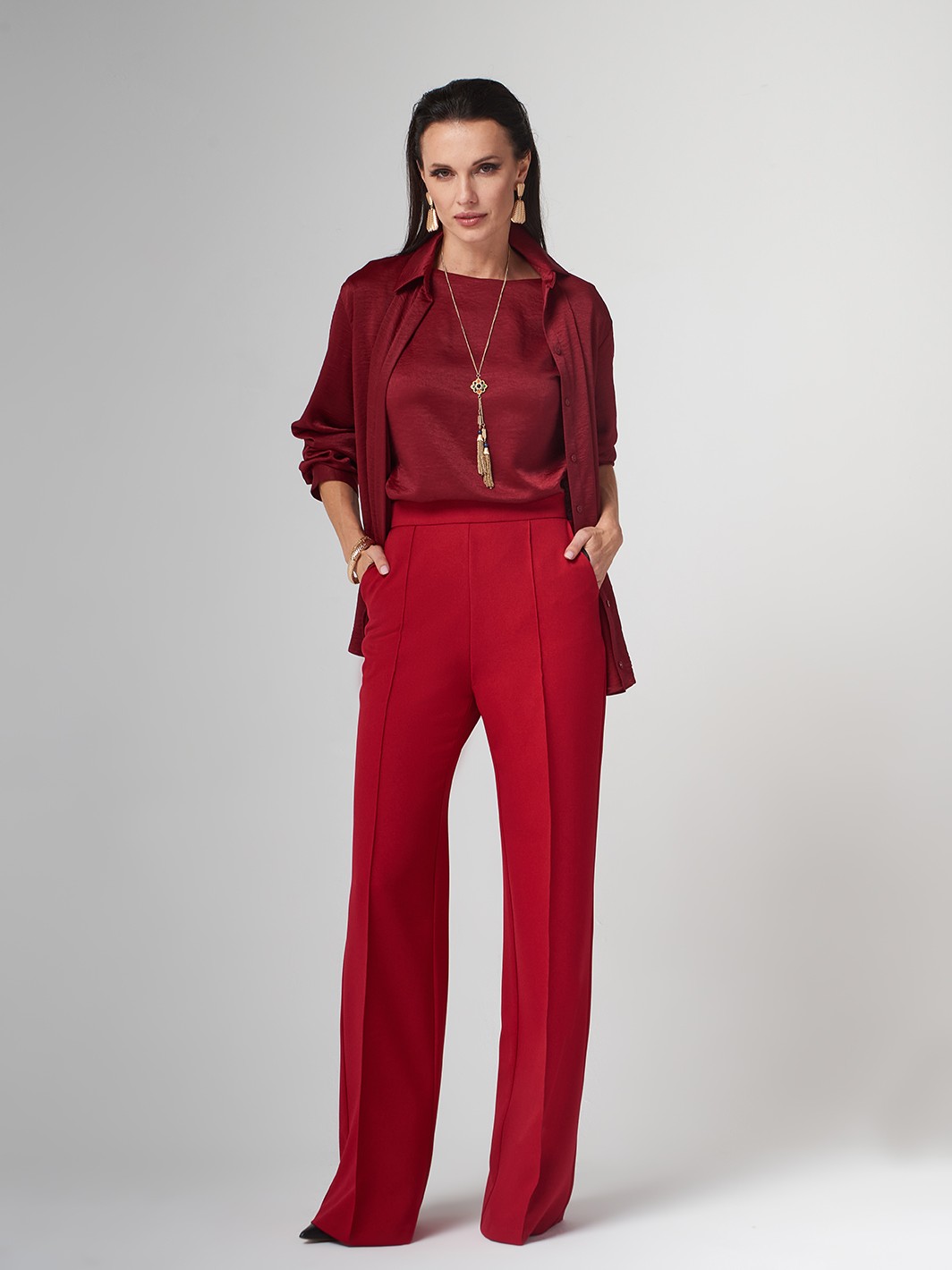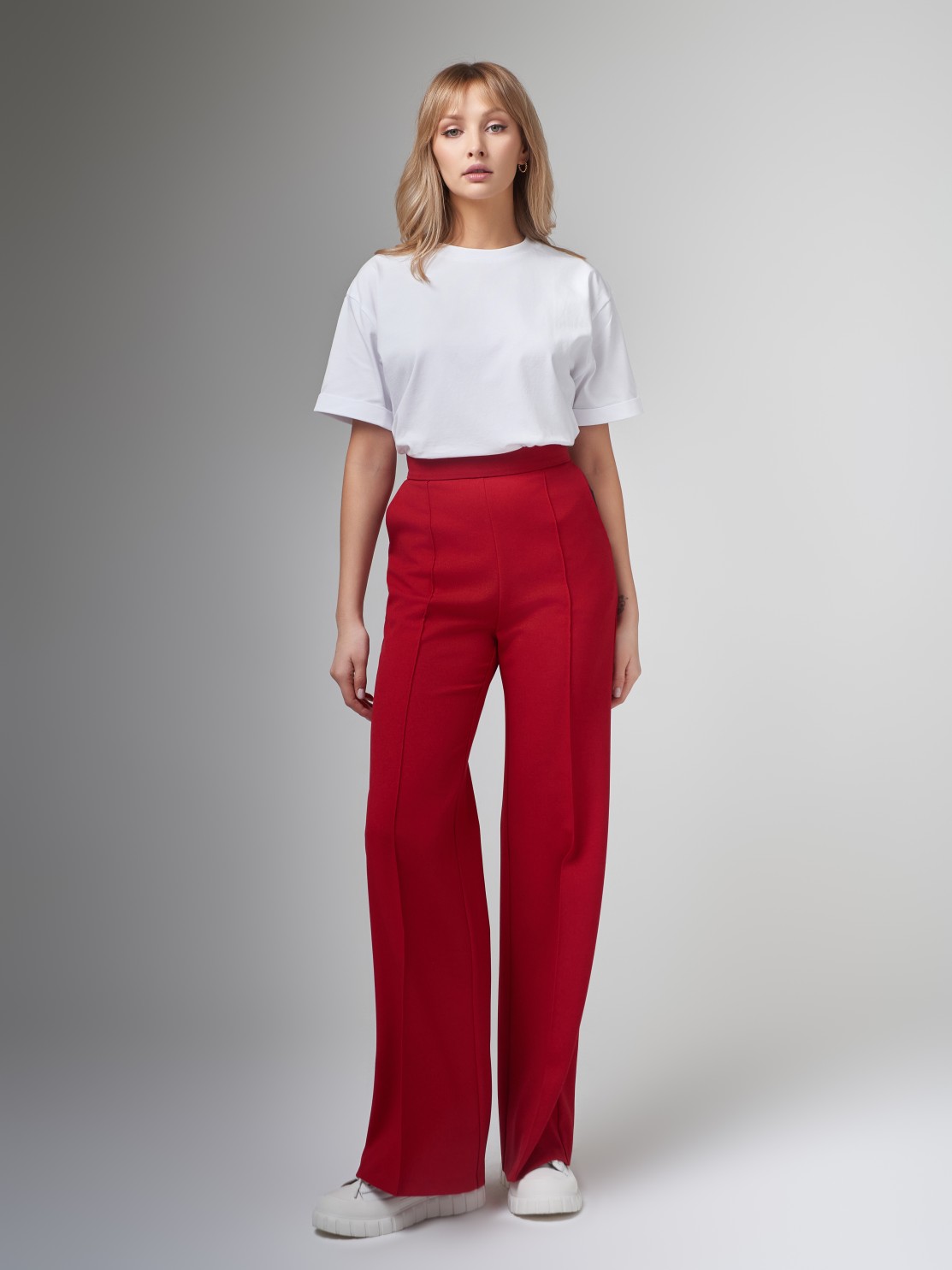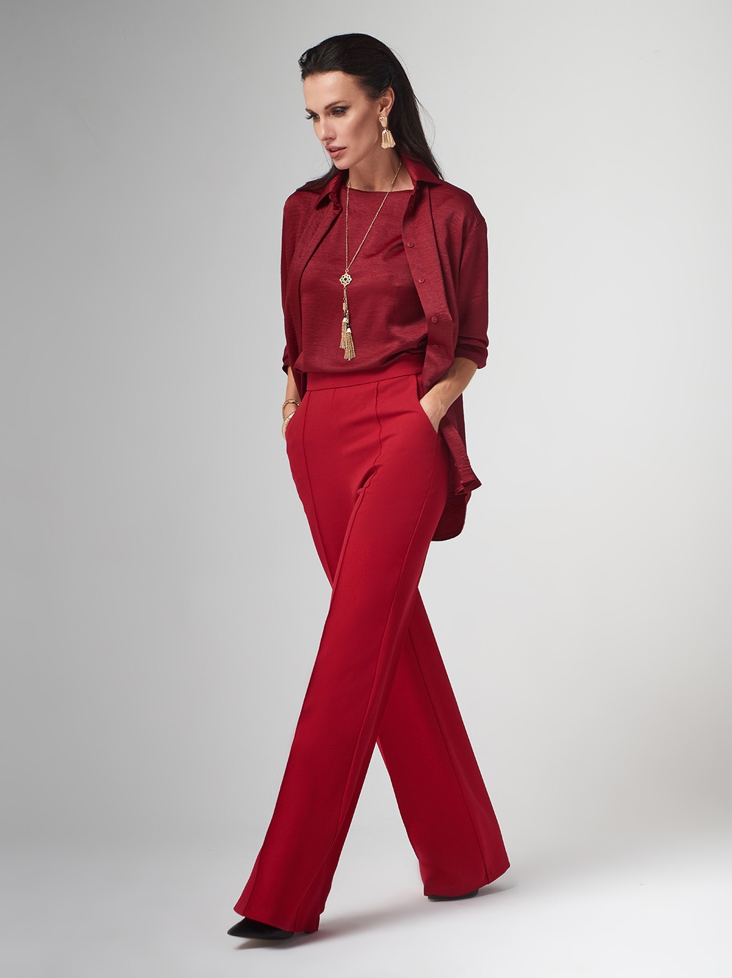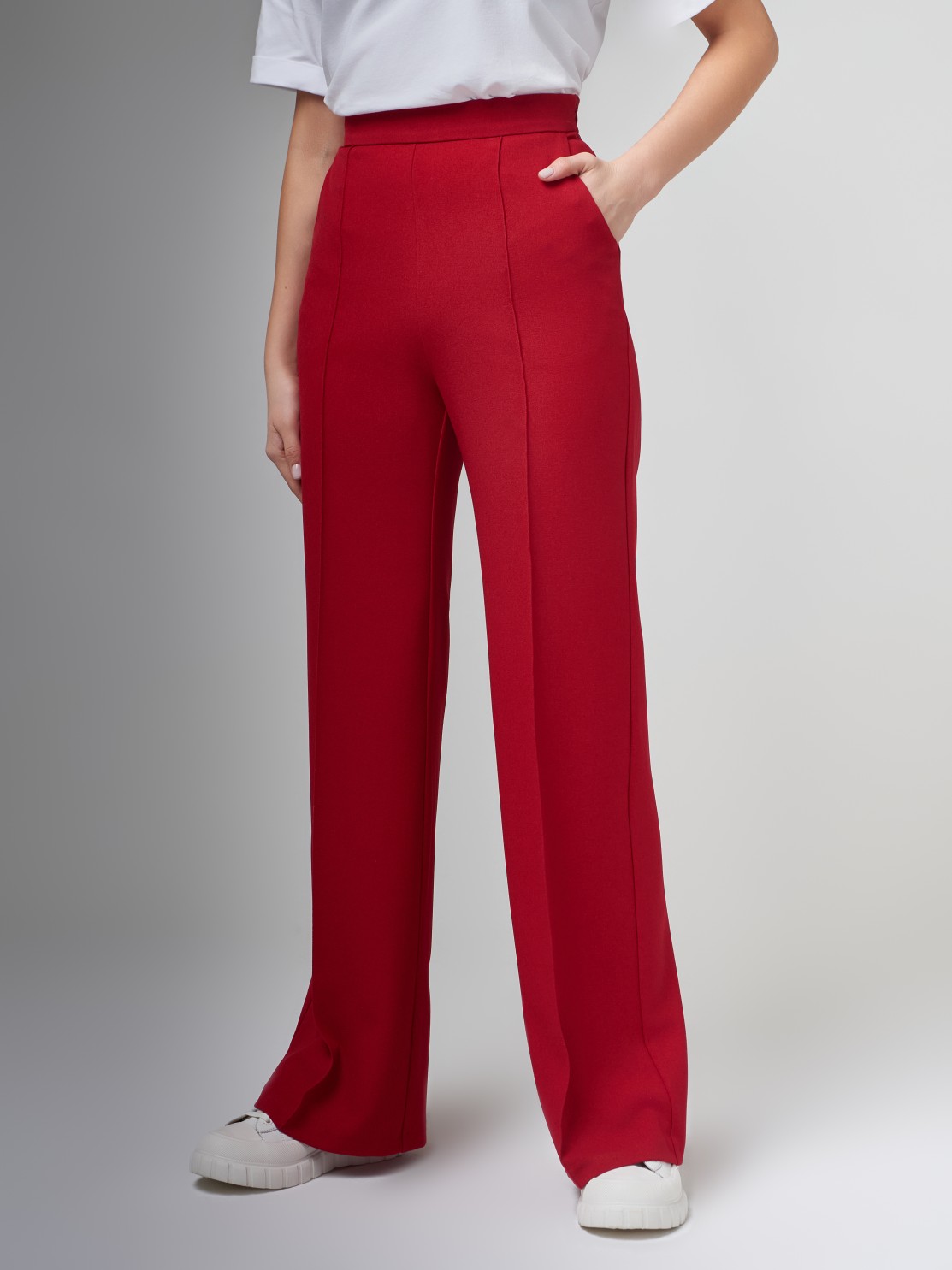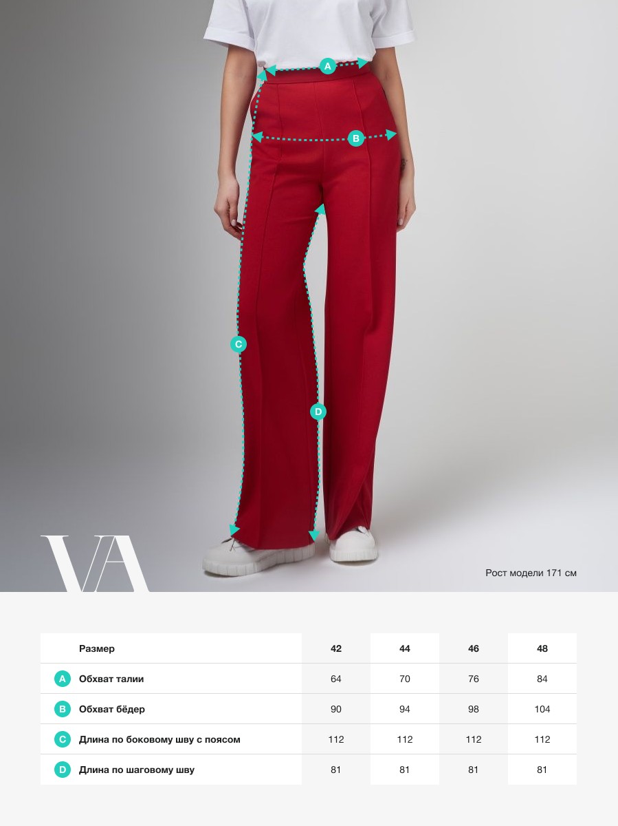 Хорошие брючки, насыщенный красный цвет, ровные строчки , материал не просвечивает.
