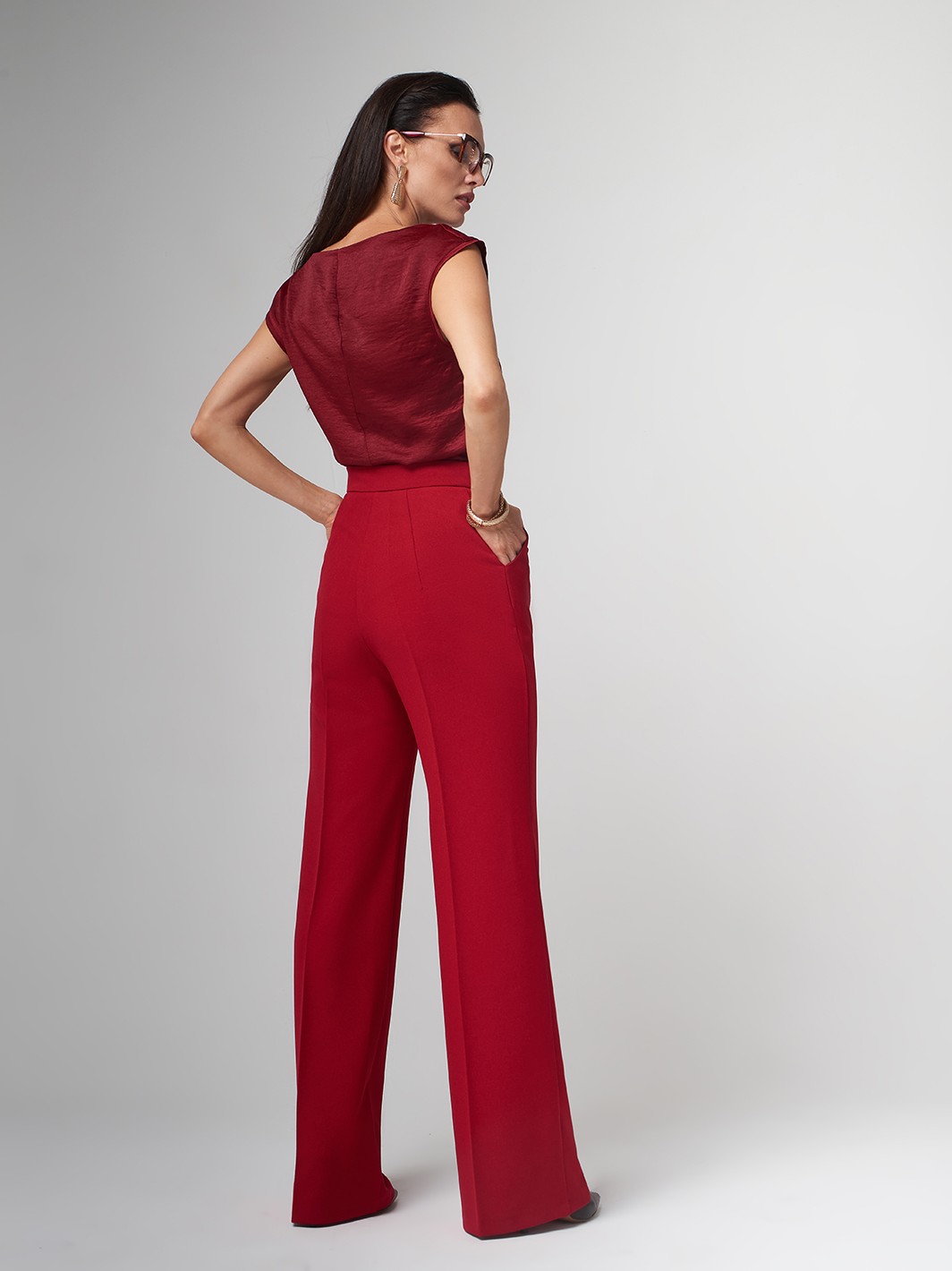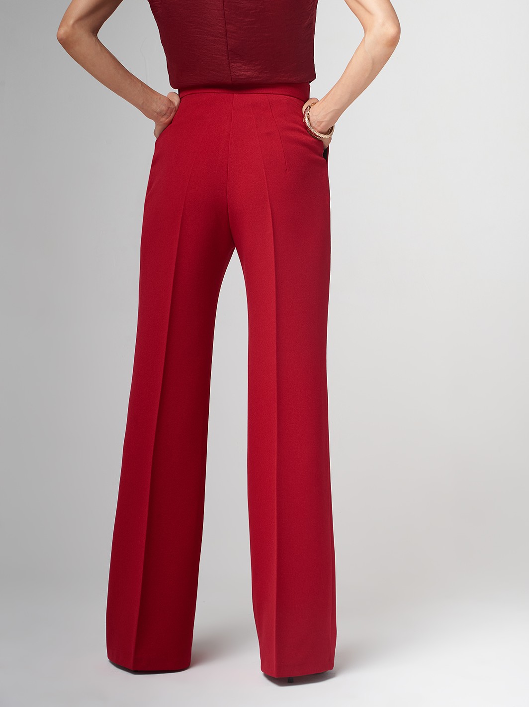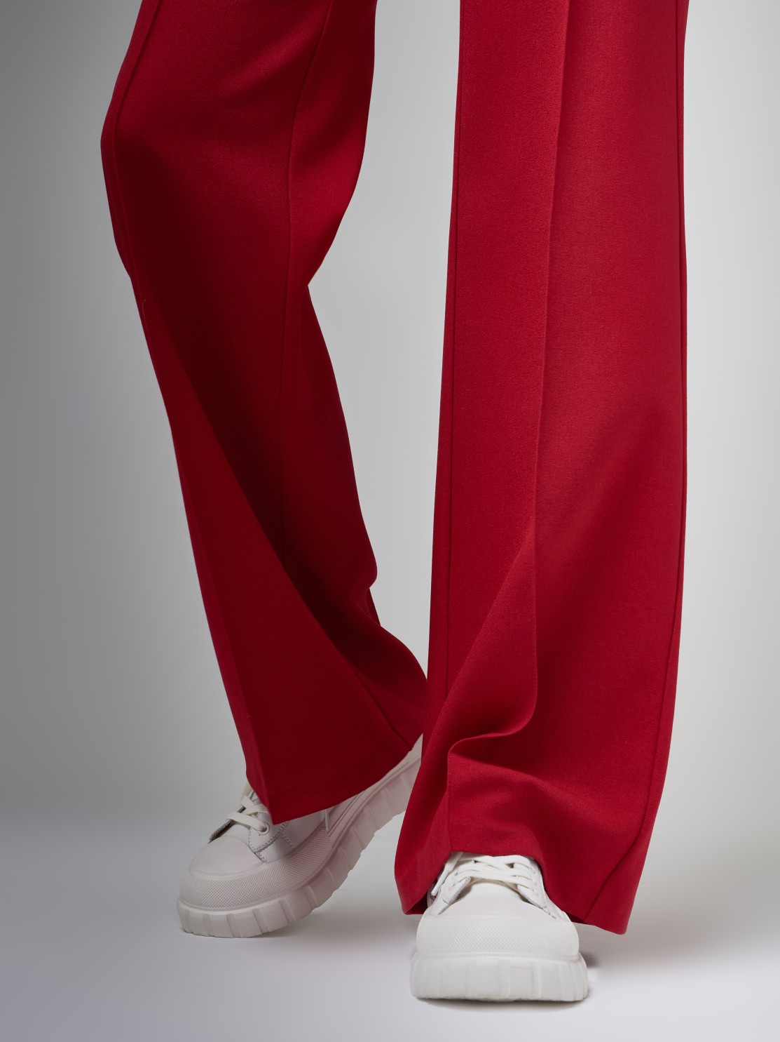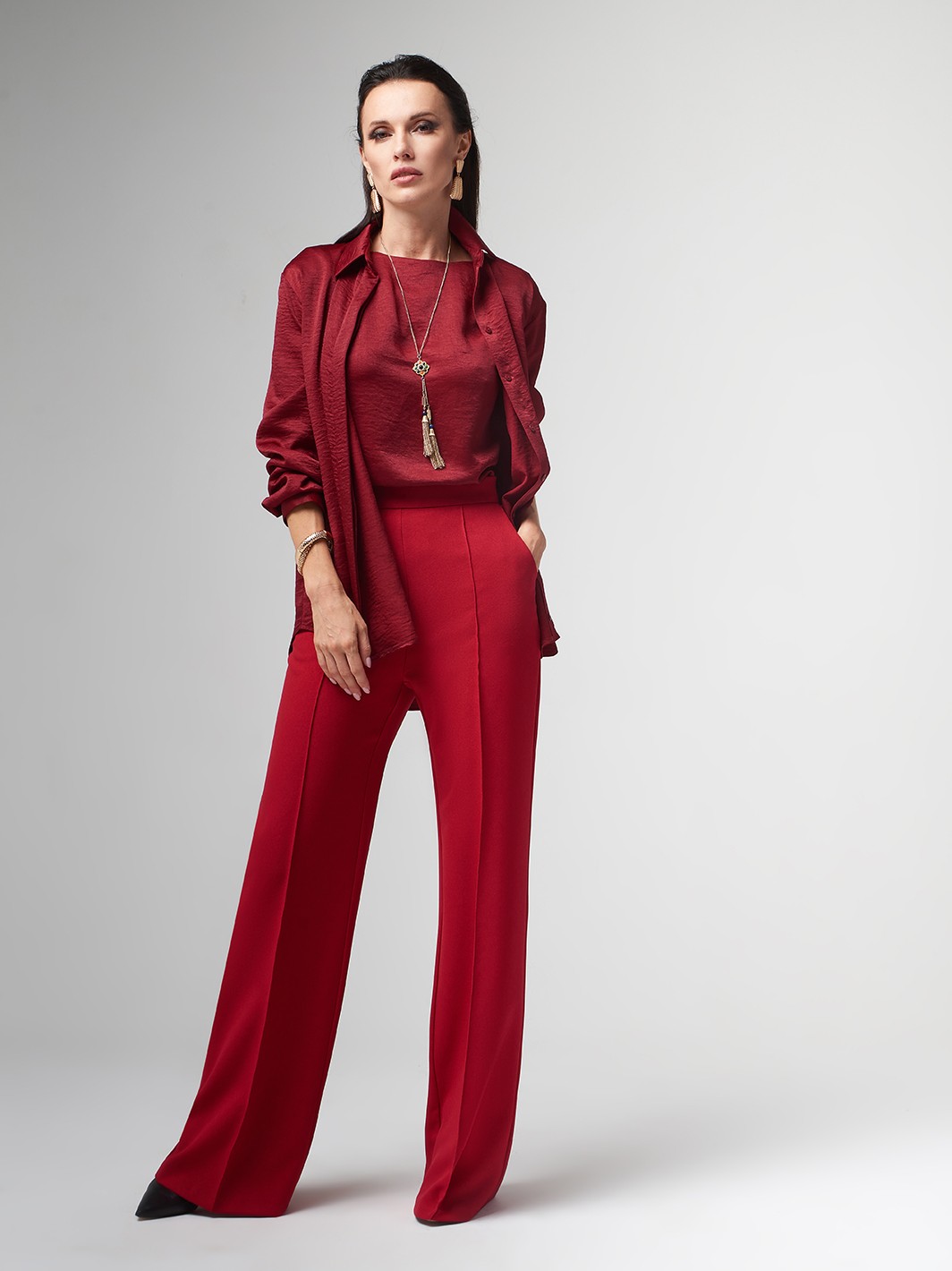 Хорошие брючки, насыщенный красный цвет, ровные строчки , материал не просвечивает.