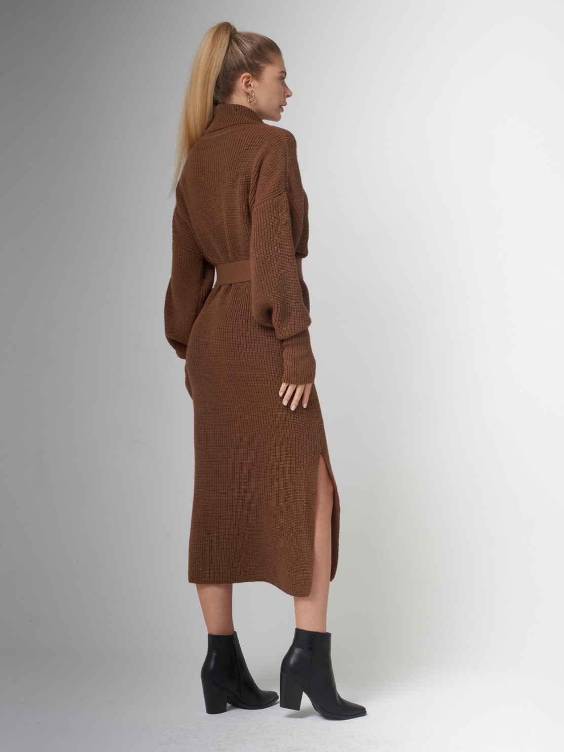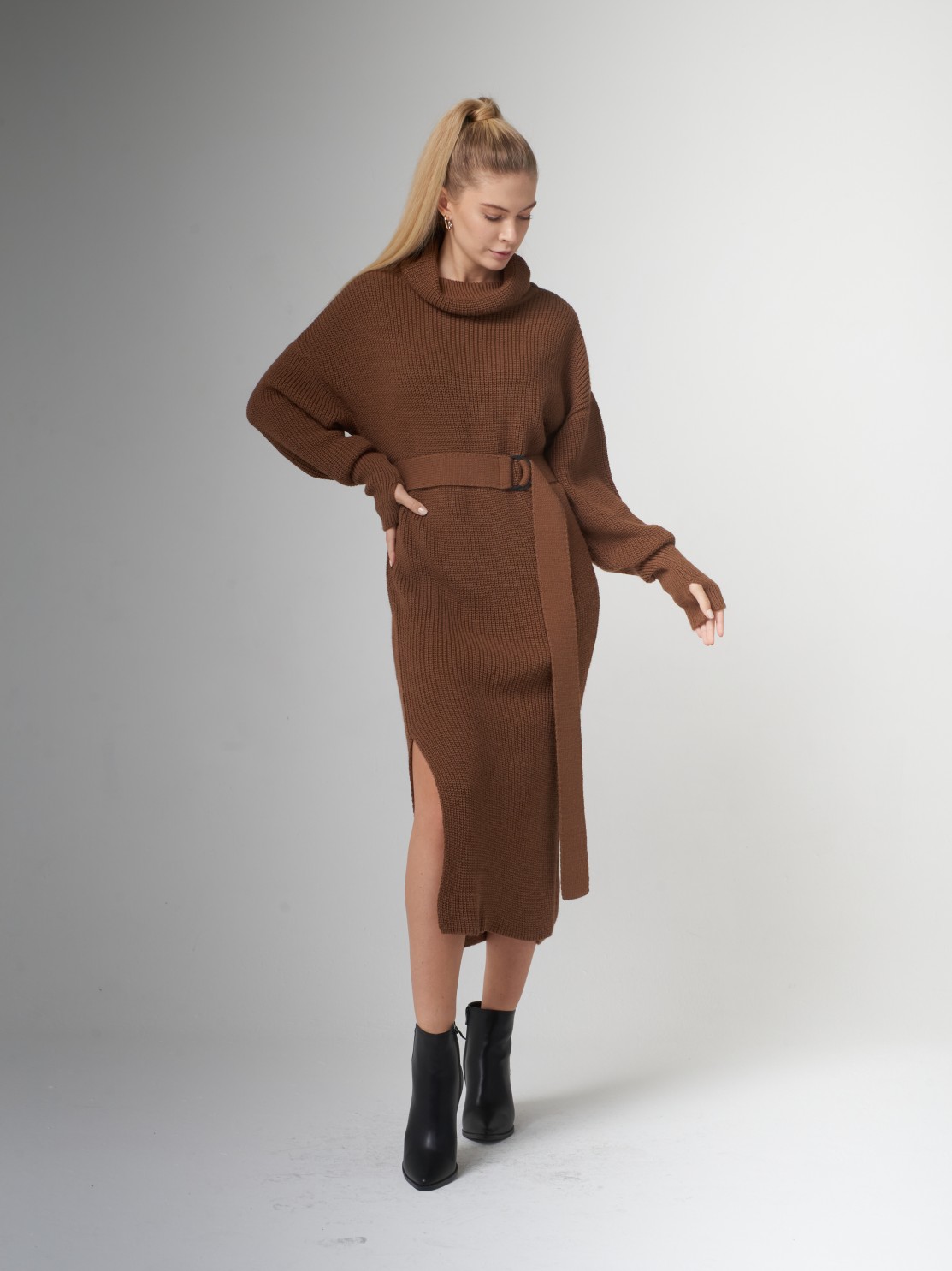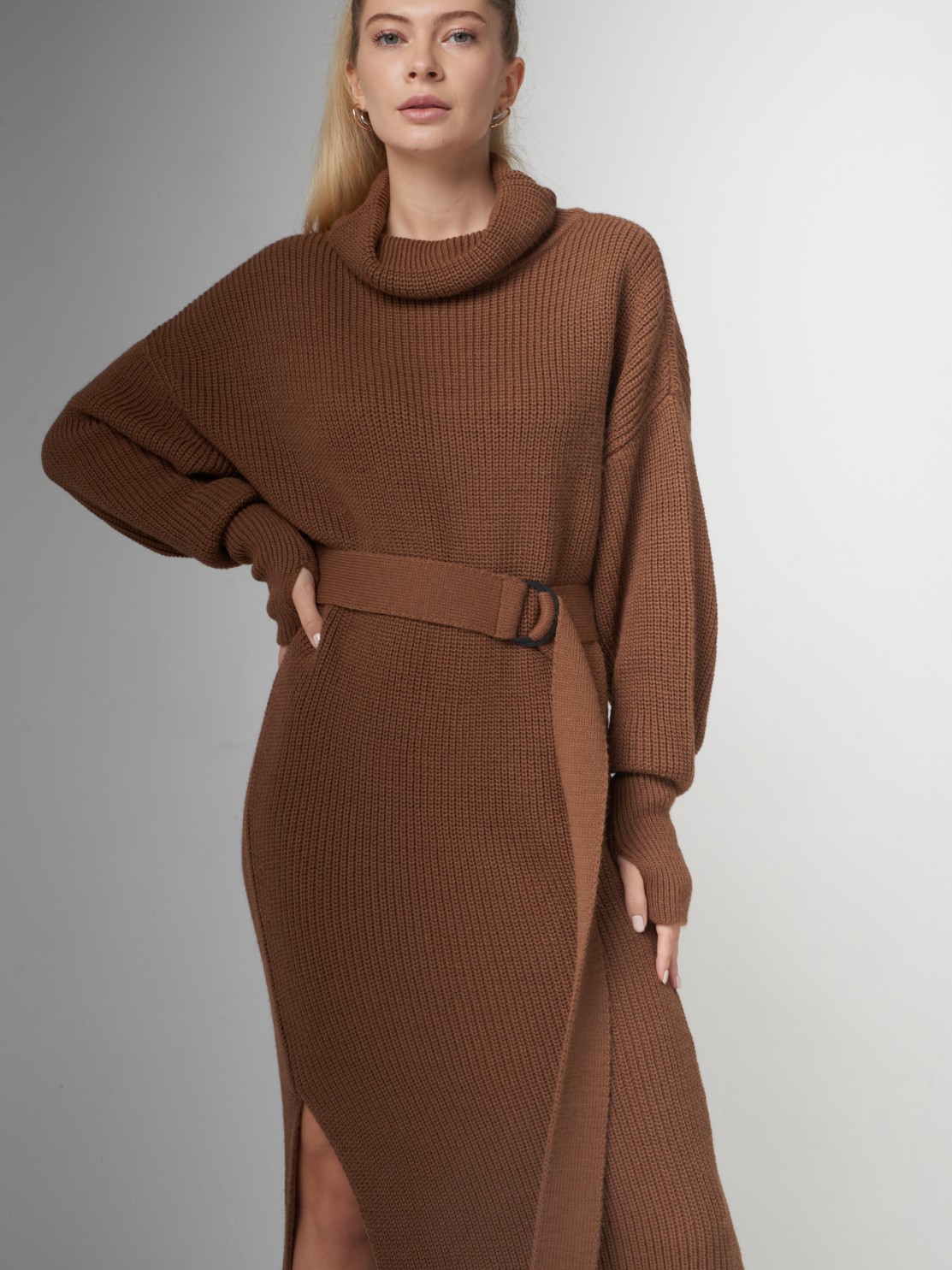 Вырез на ноге смотрится очень красиво, само платье очень мягкое и теплое, красивый карамельный цвет.
