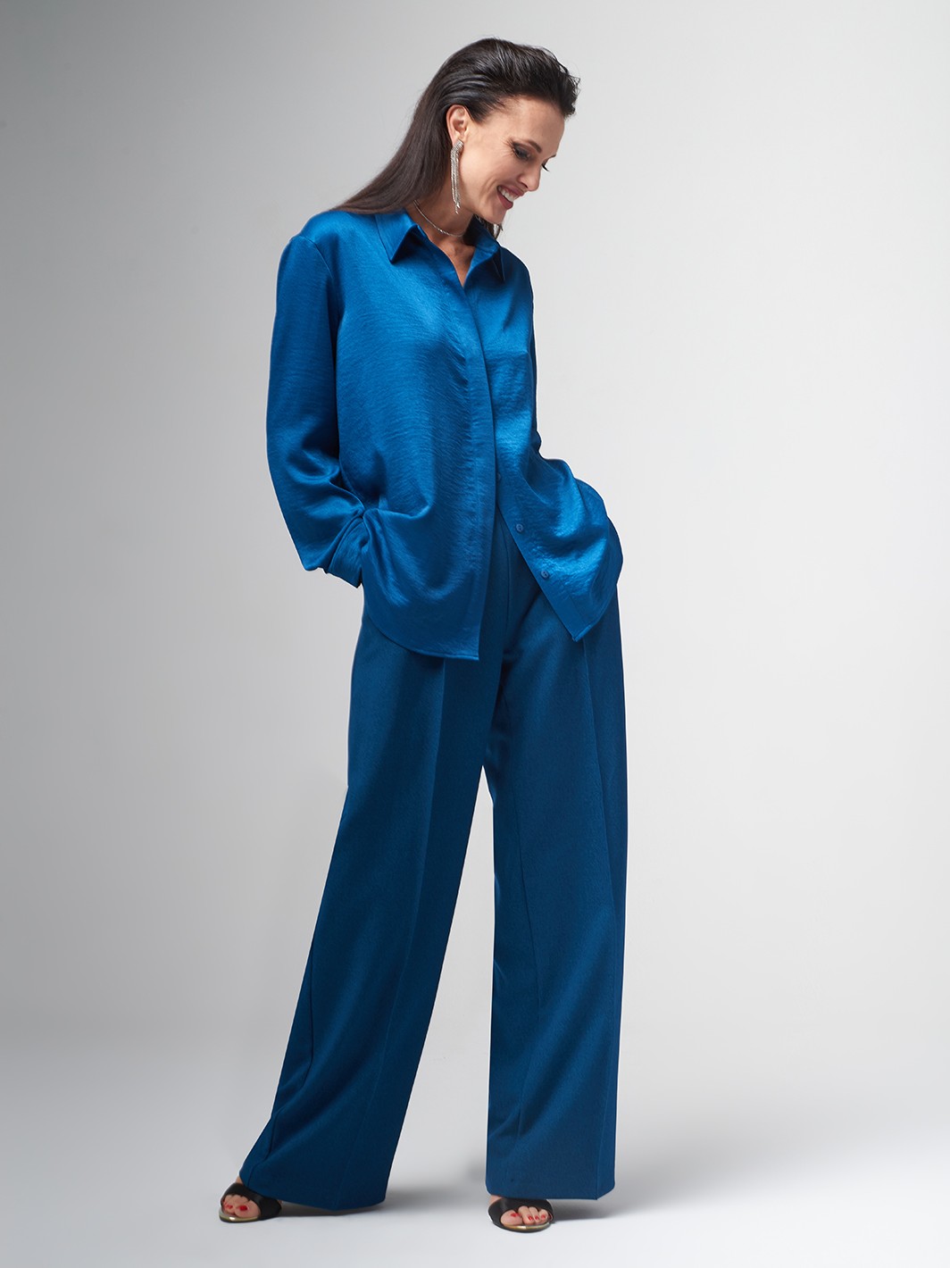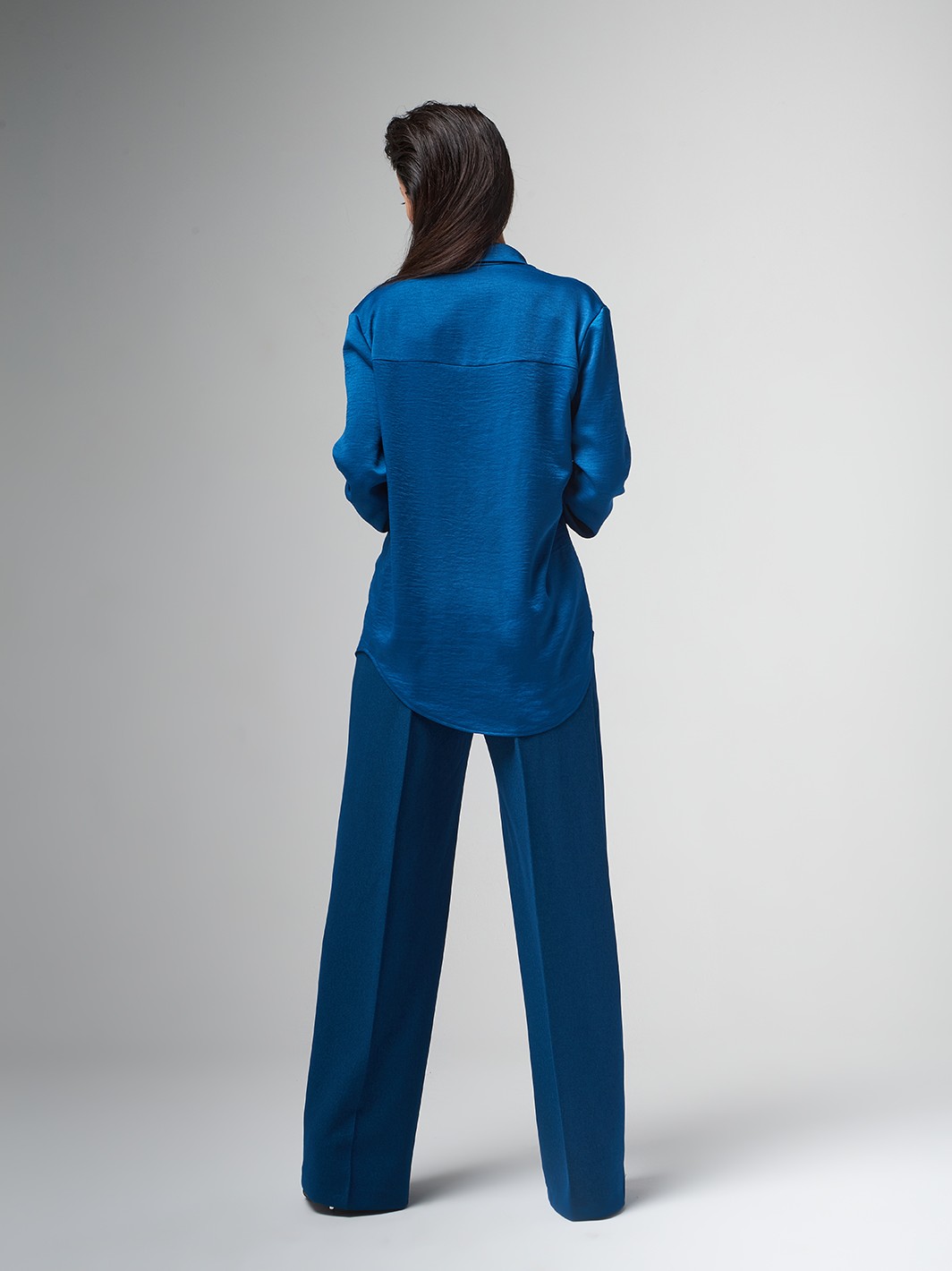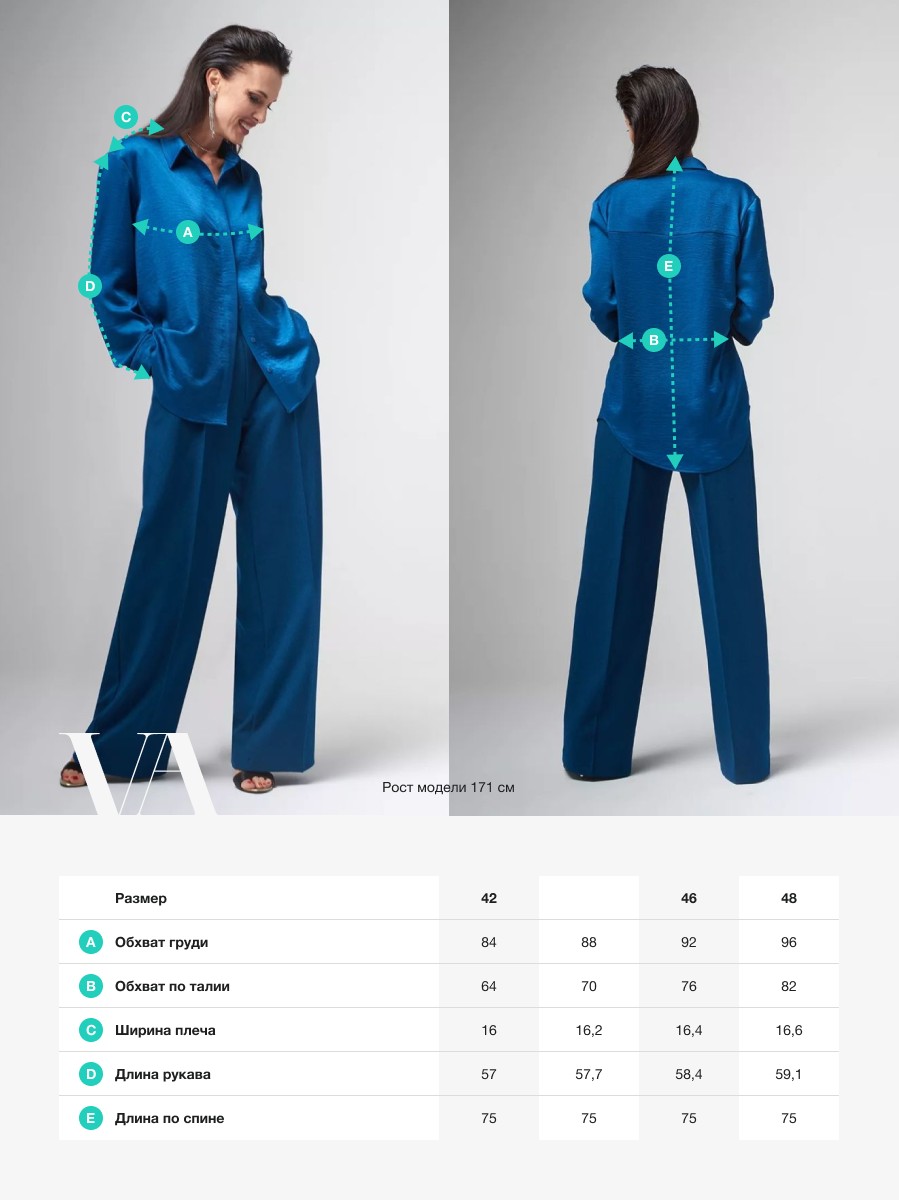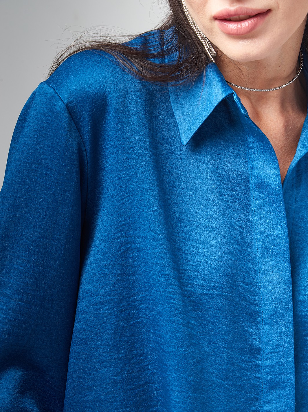 Наша классическая рубашка с воротником, фиксированным манжетом и потайными пуговками. Выполнена из атласной ткани. Отлично сочетается с топами, брюками и юбками.